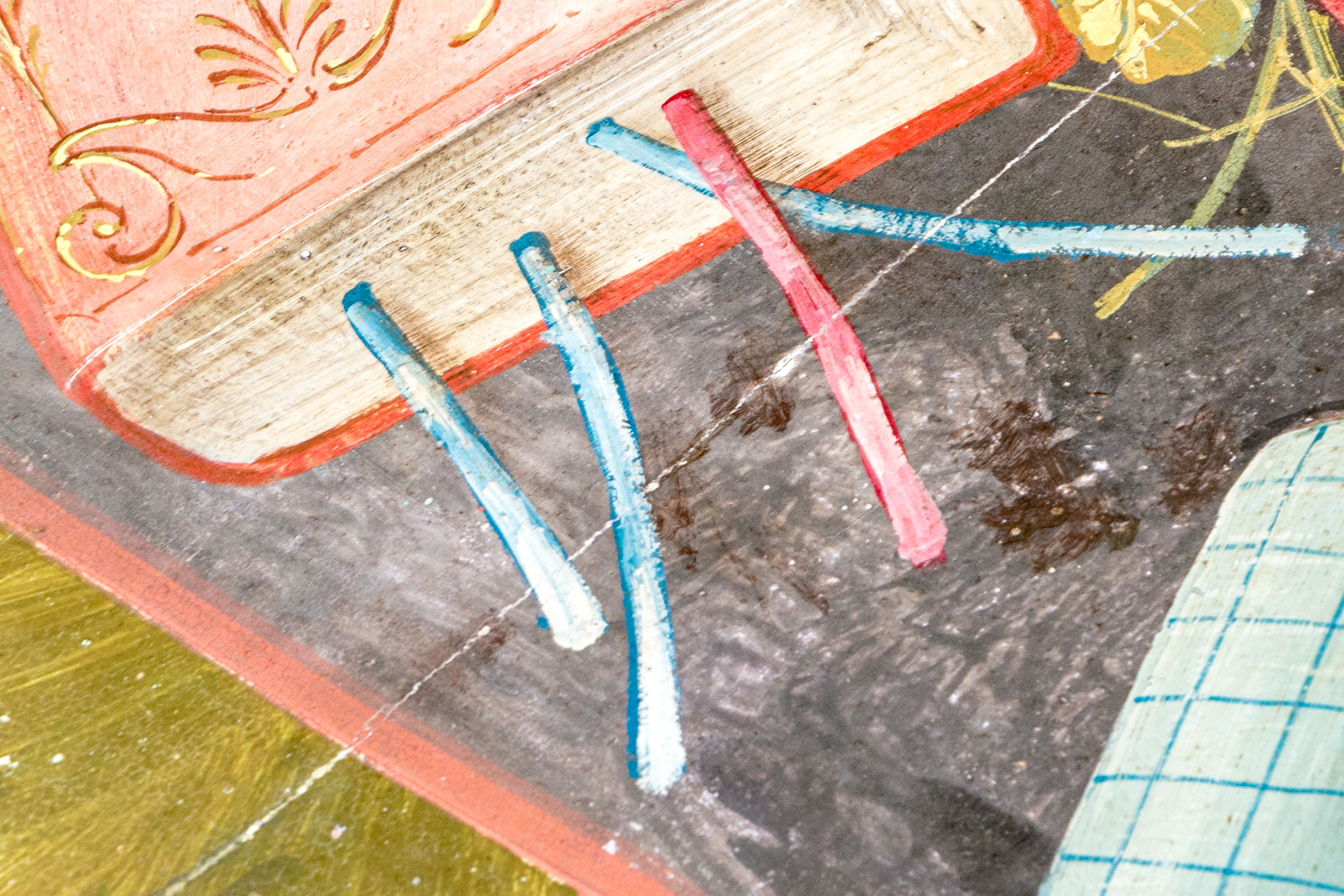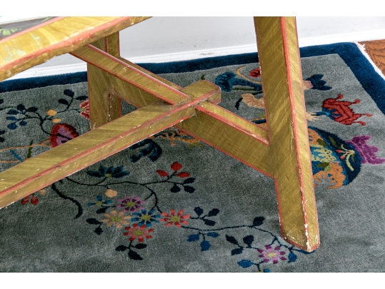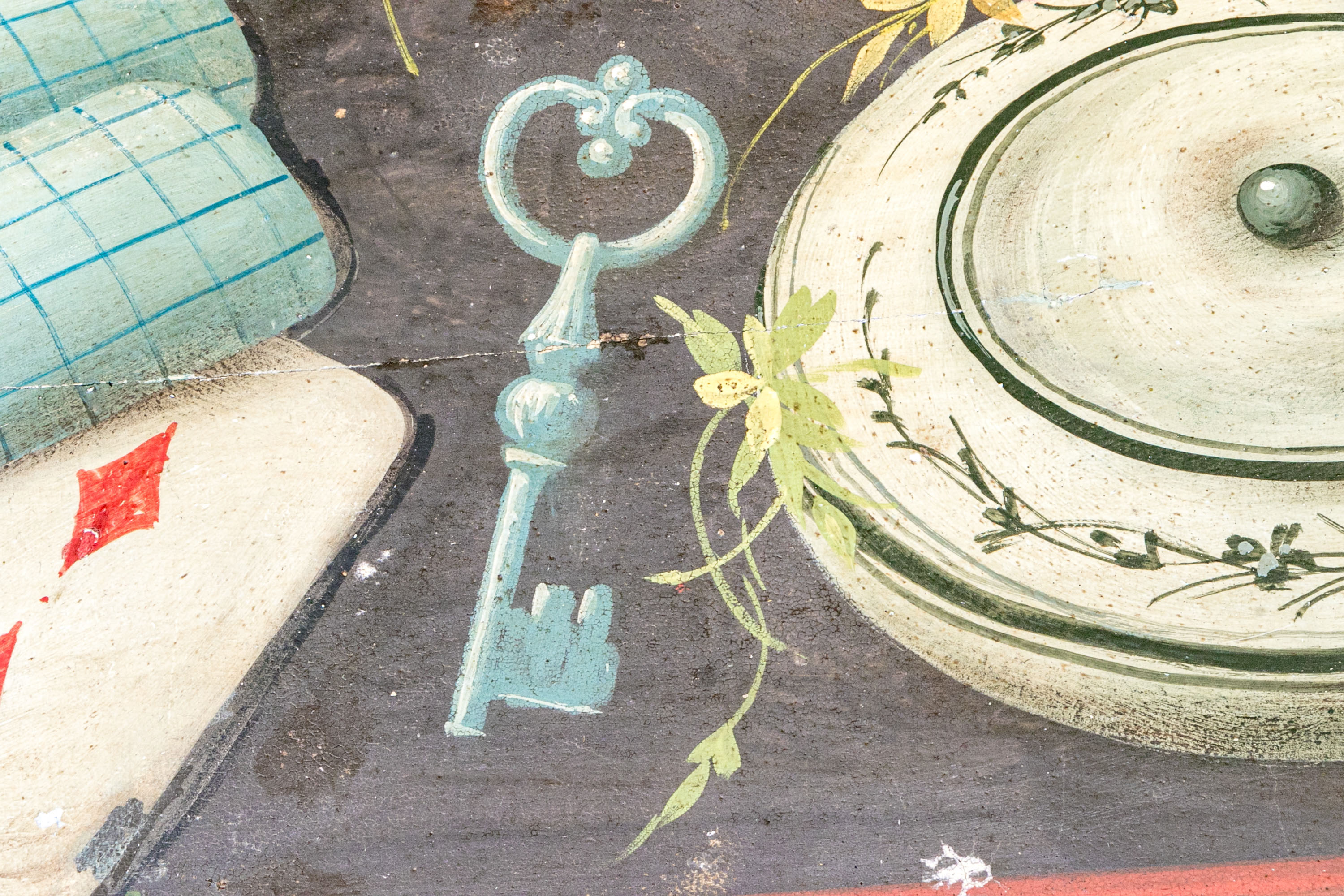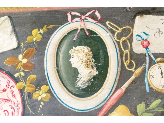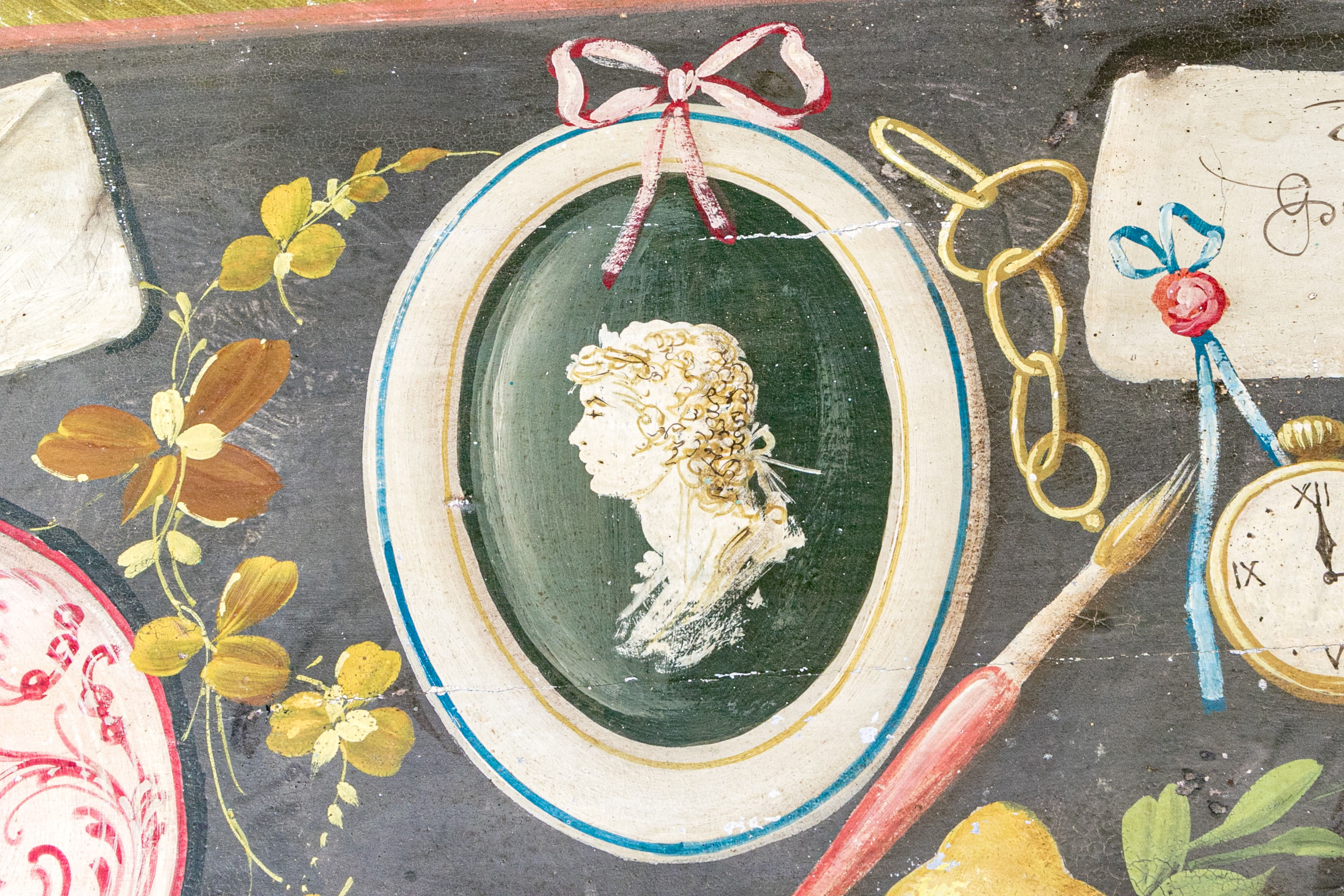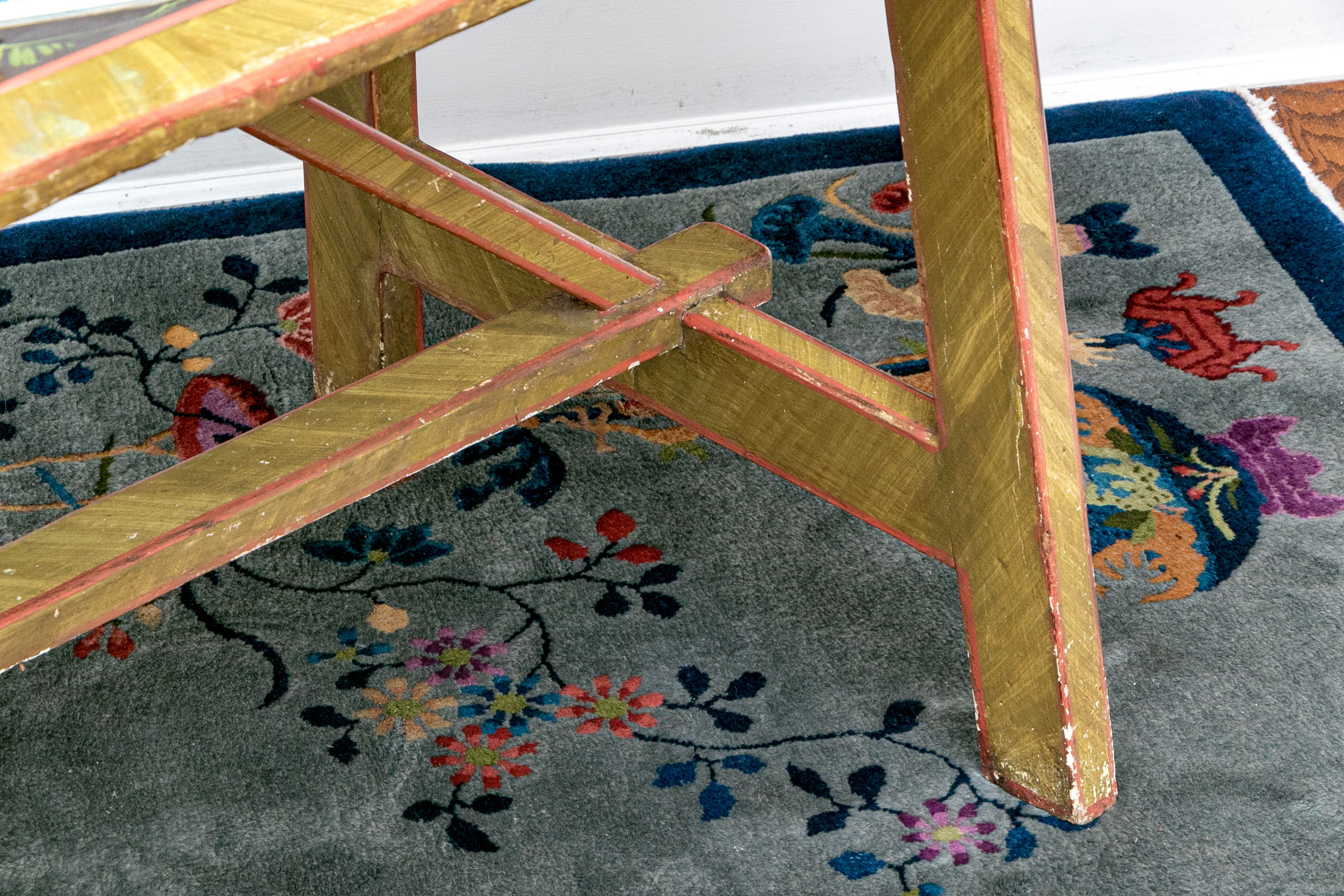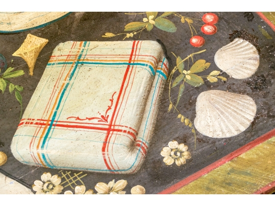 A polychrome painted wood table with a green frame with red edges. The rectangular top with a trompe l'oeil panel, depicting a scattering of various porcelain plates, playing cards, flowers, stationery, et al. Raised on tapering square supports joined by a trestle base with an A-form stretcher.
