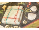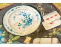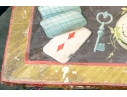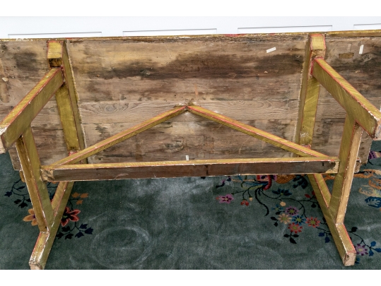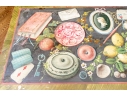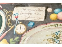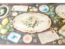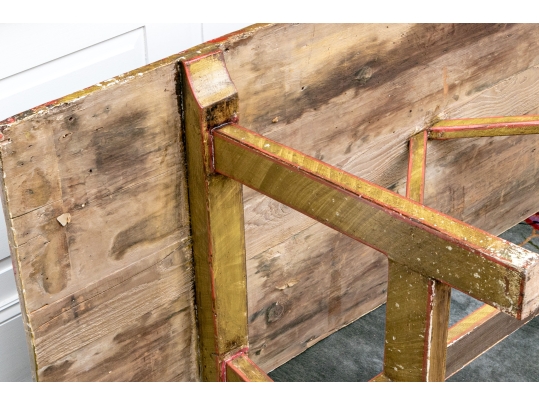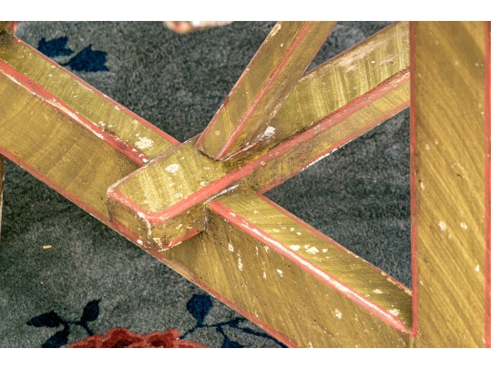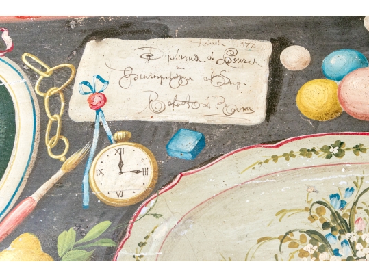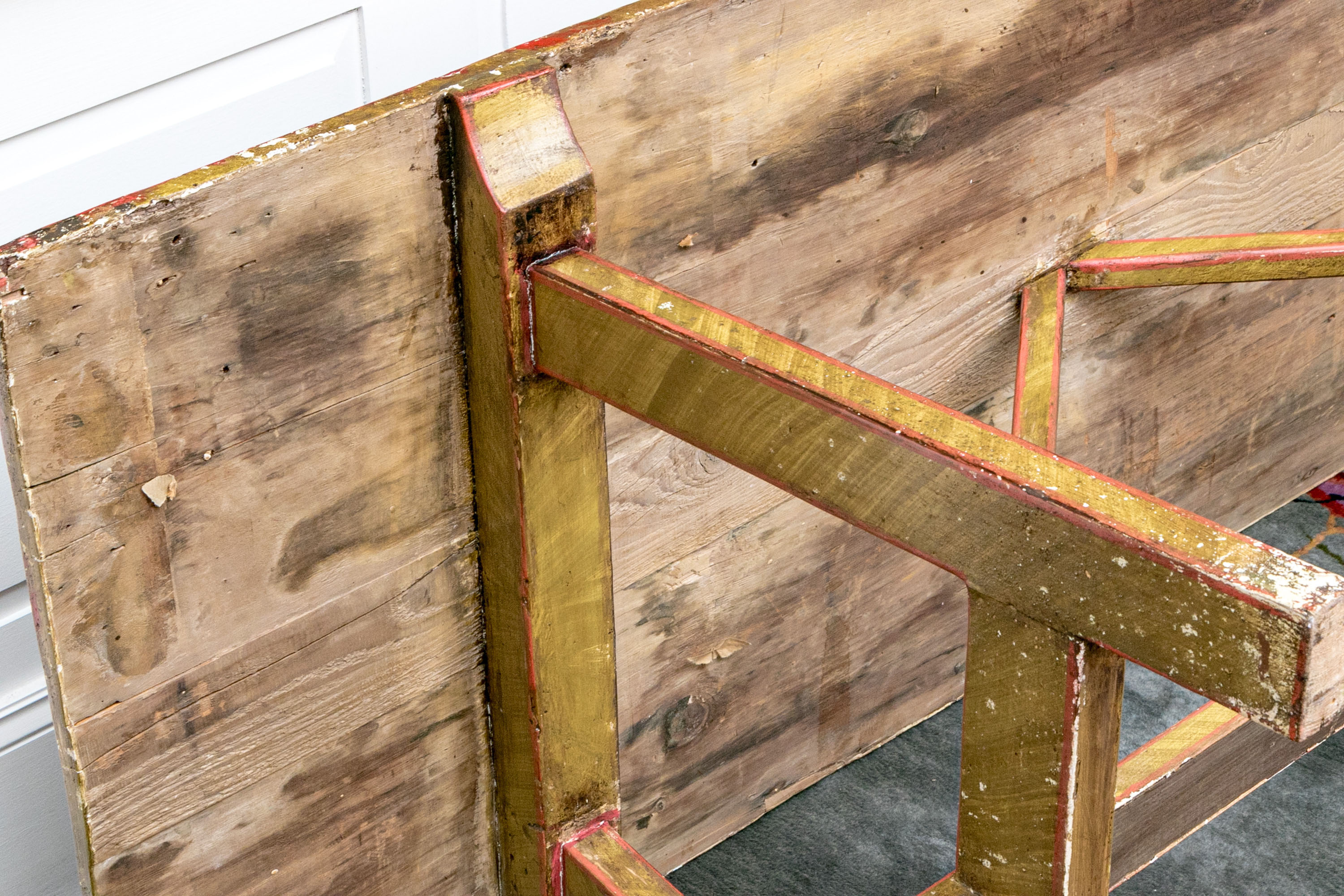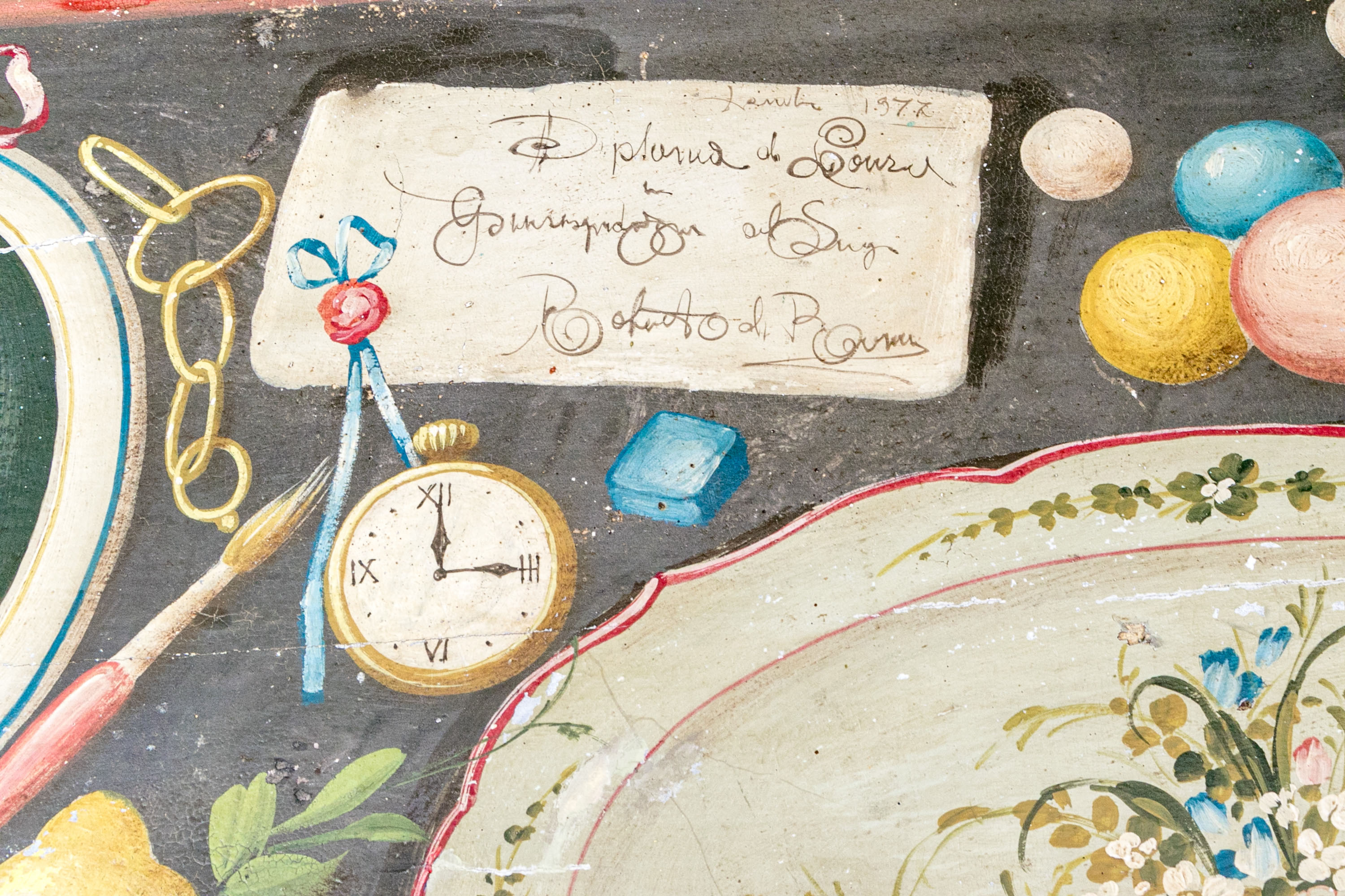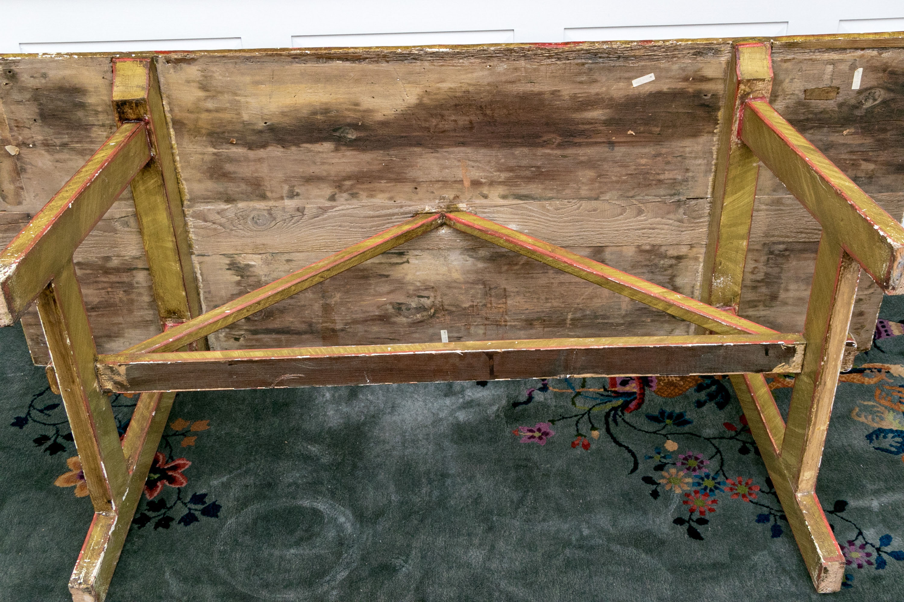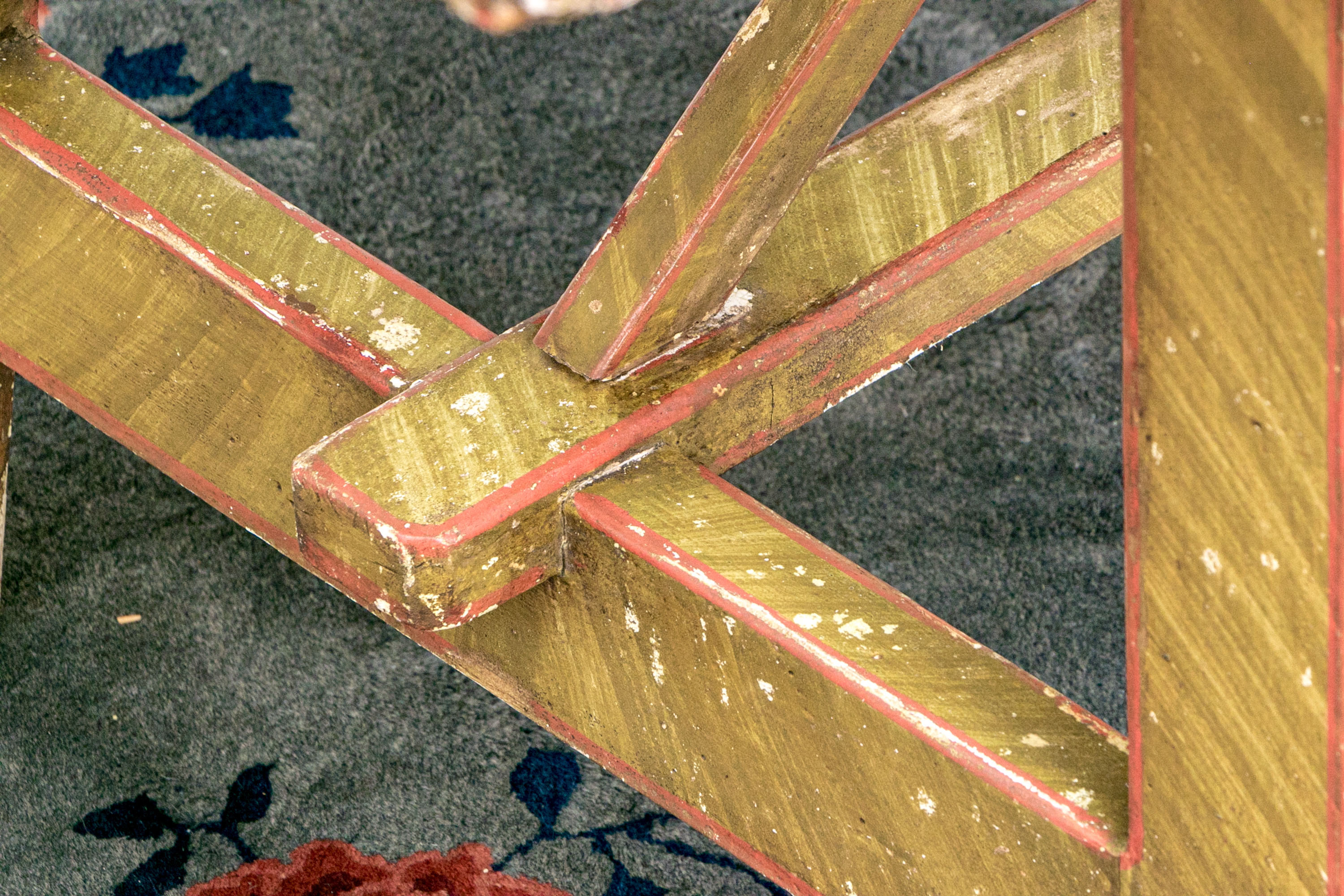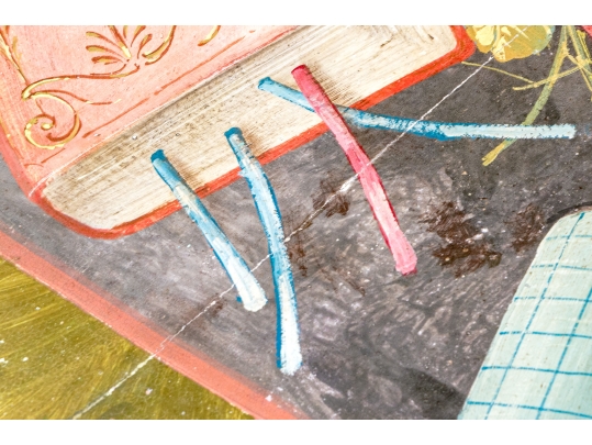 A polychrome painted wood table with a green frame with red edges. The rectangular top with a trompe l'oeil panel, depicting a scattering of various porcelain plates, playing cards, flowers, stationery, et al. Raised on tapering square supports joined by a trestle base with an A-form stretcher.