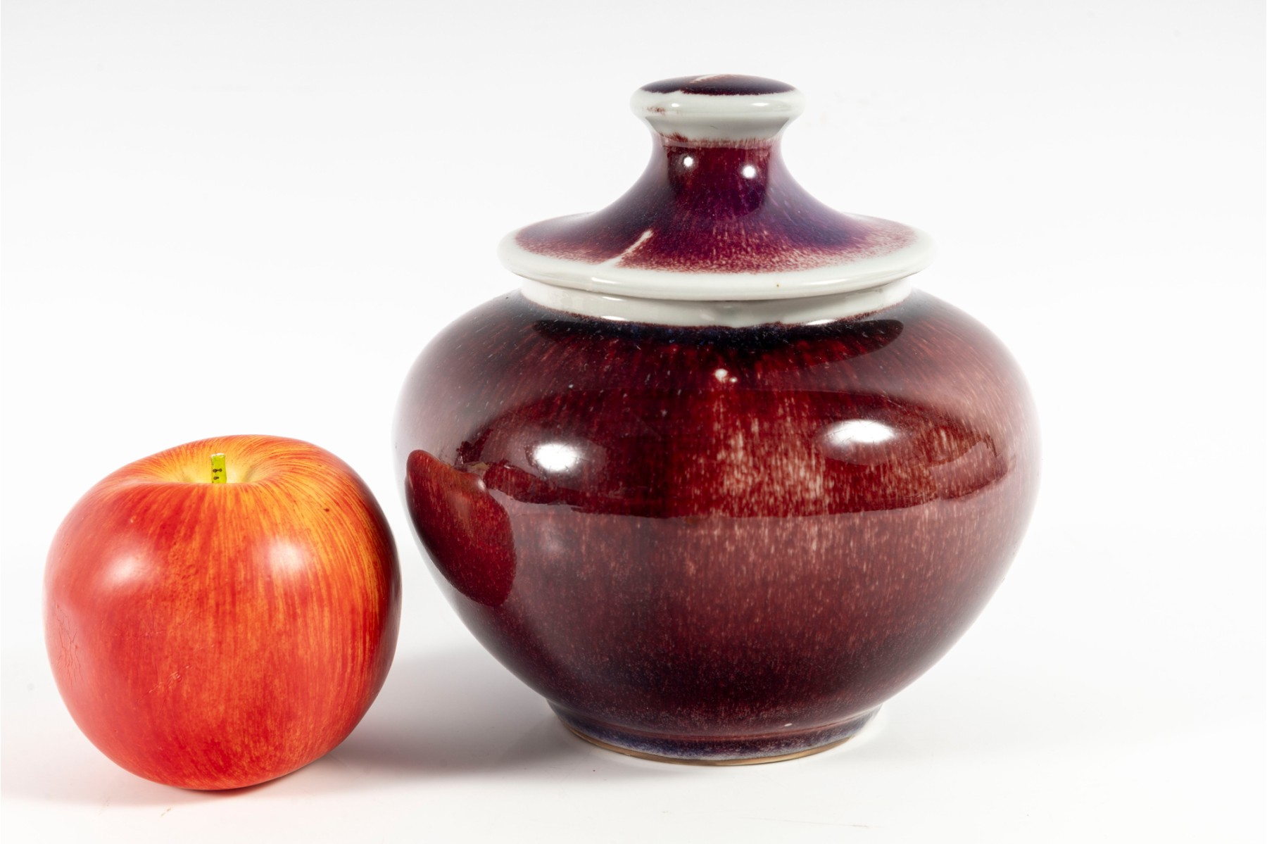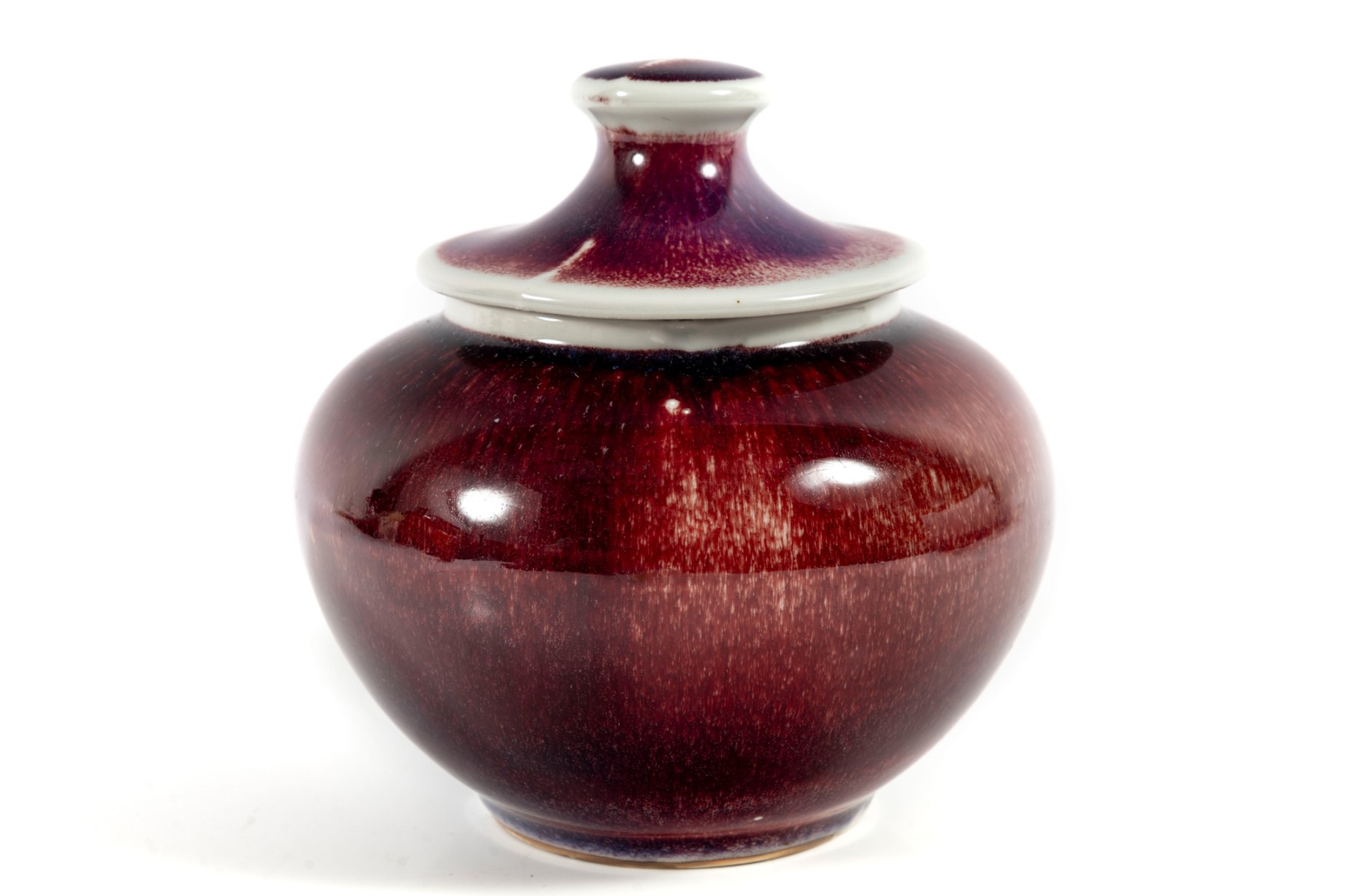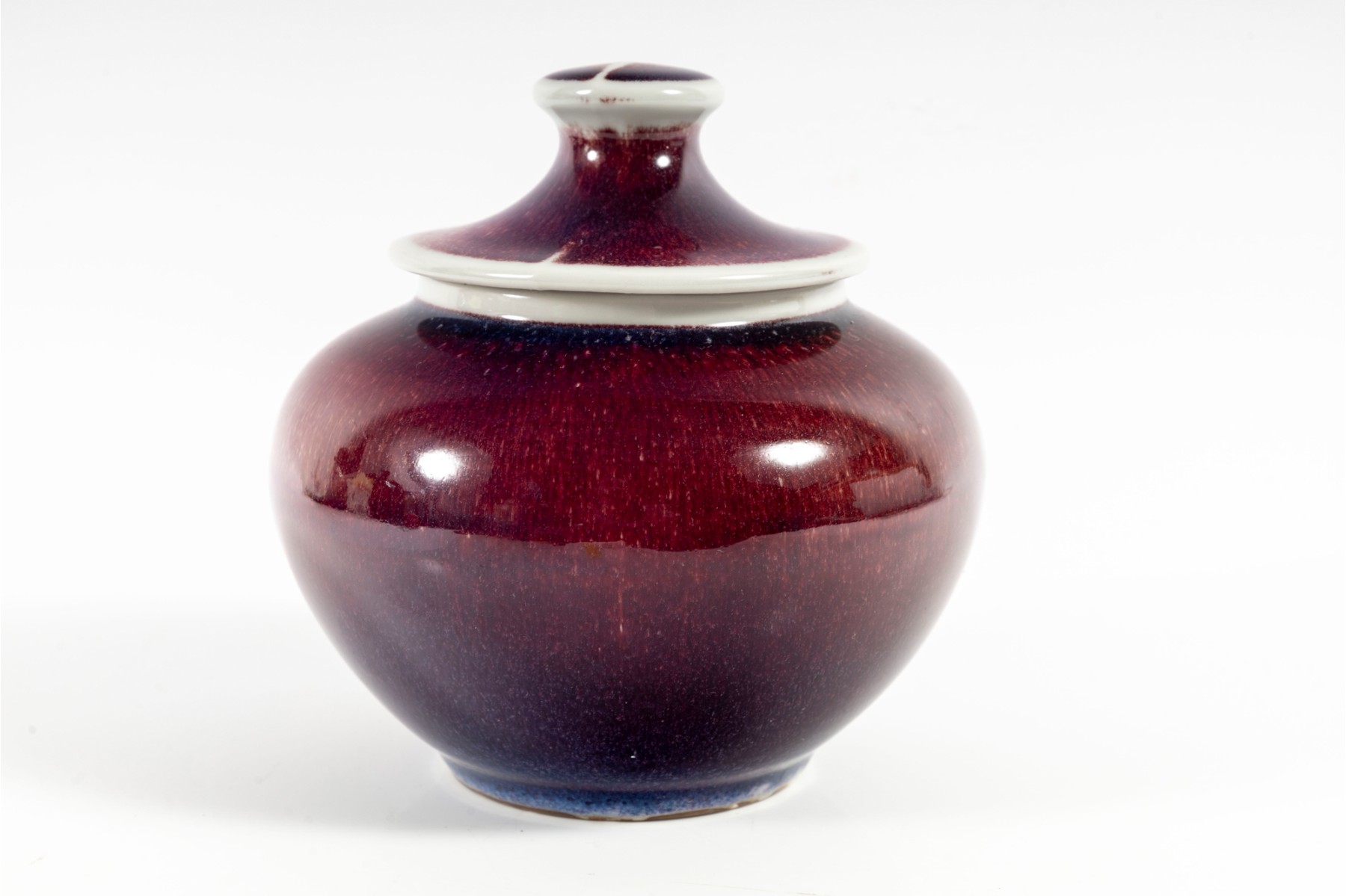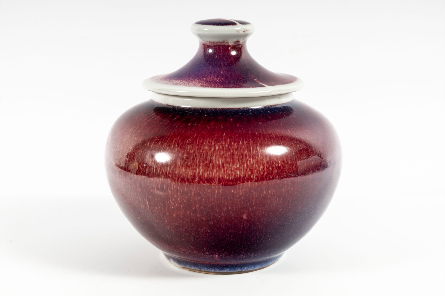 A lovely porcelain pottery lidded ginger jar, antique -- adorned in the illusive oxblood glaze which displays rich color variation throughout with subtle hues of magenta. No markings present.