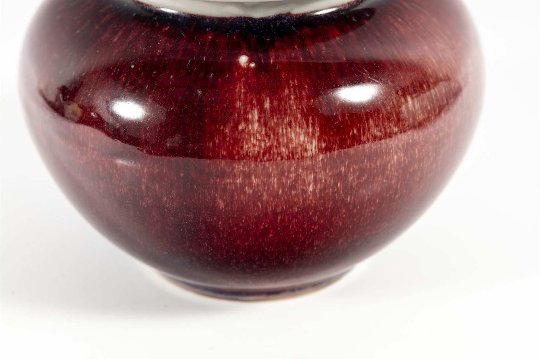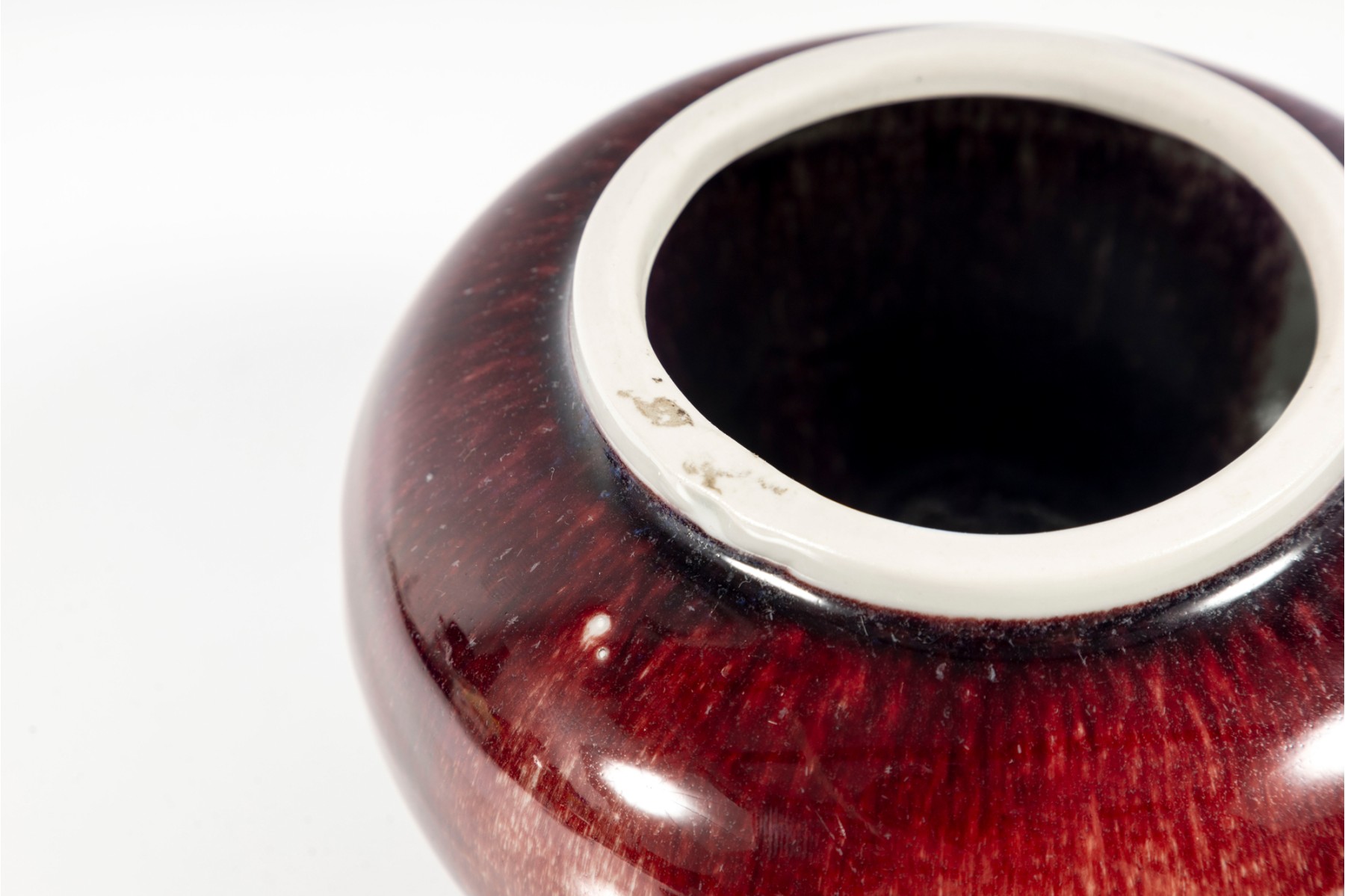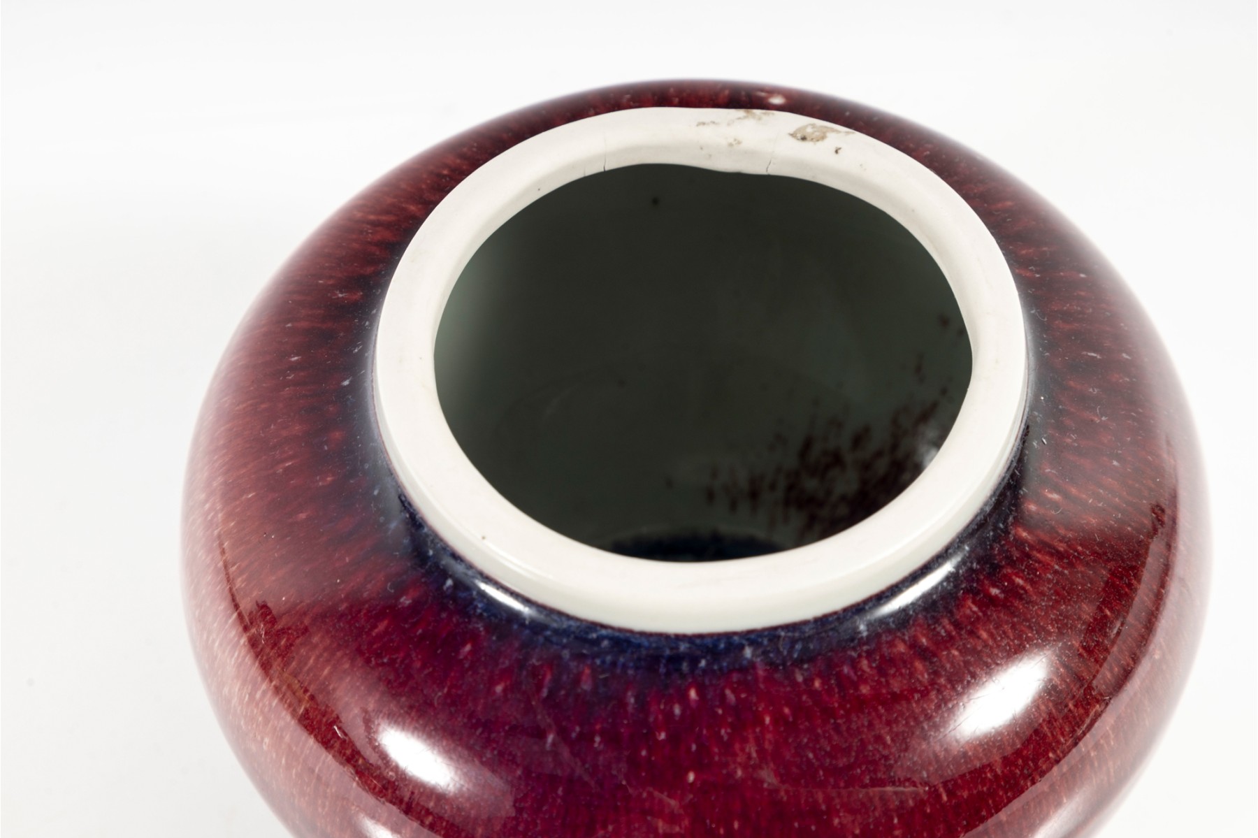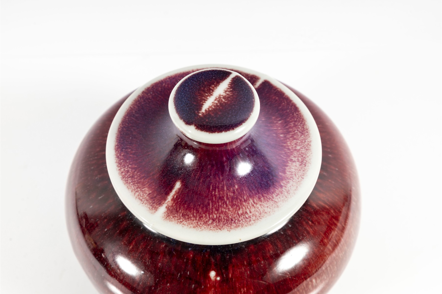 A lovely porcelain pottery lidded ginger jar, antique -- adorned in the illusive oxblood glaze which displays rich color variation throughout with subtle hues of magenta. No markings present.