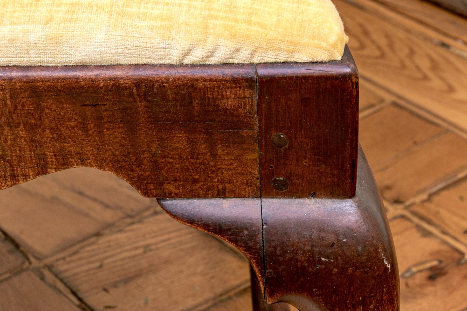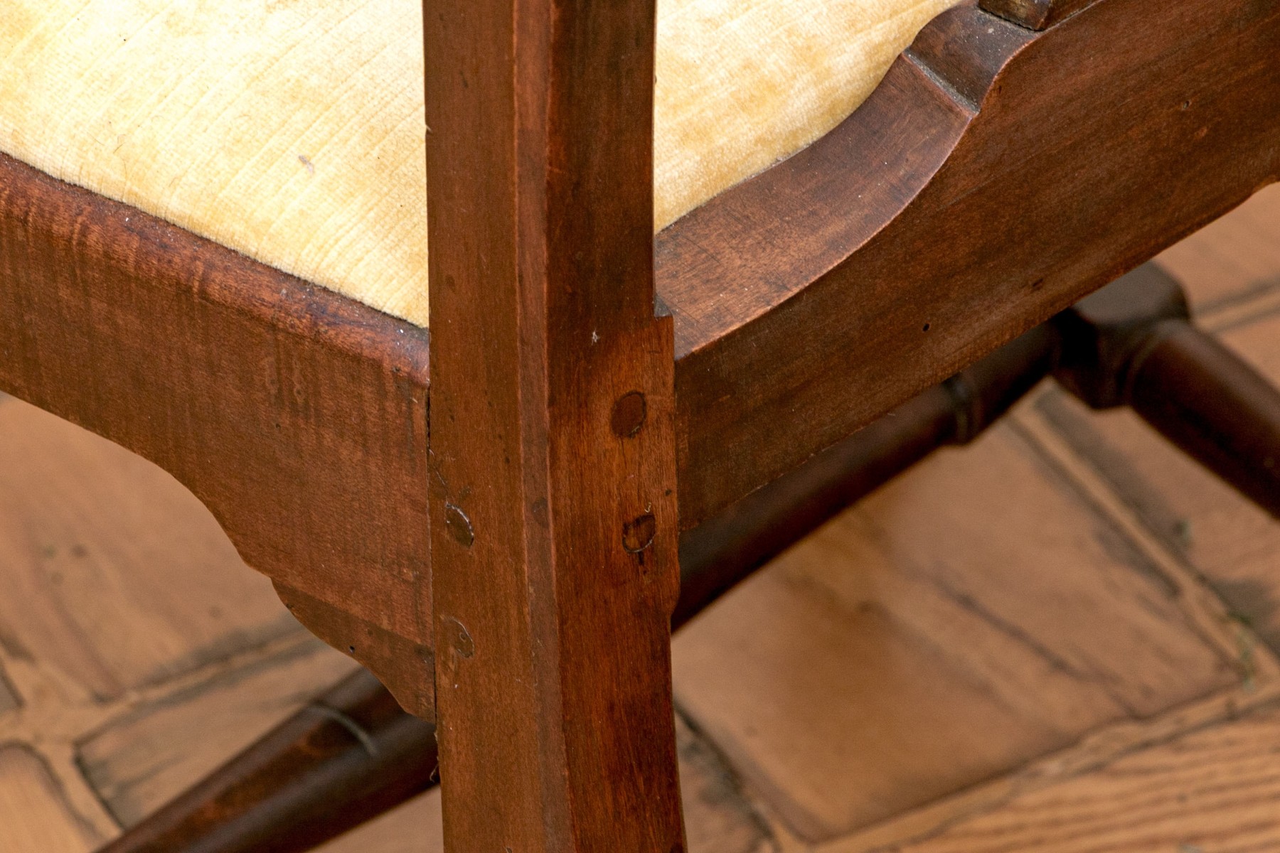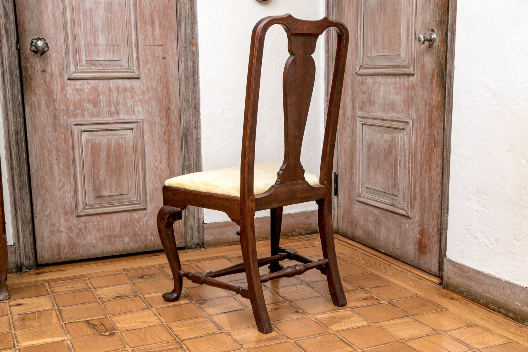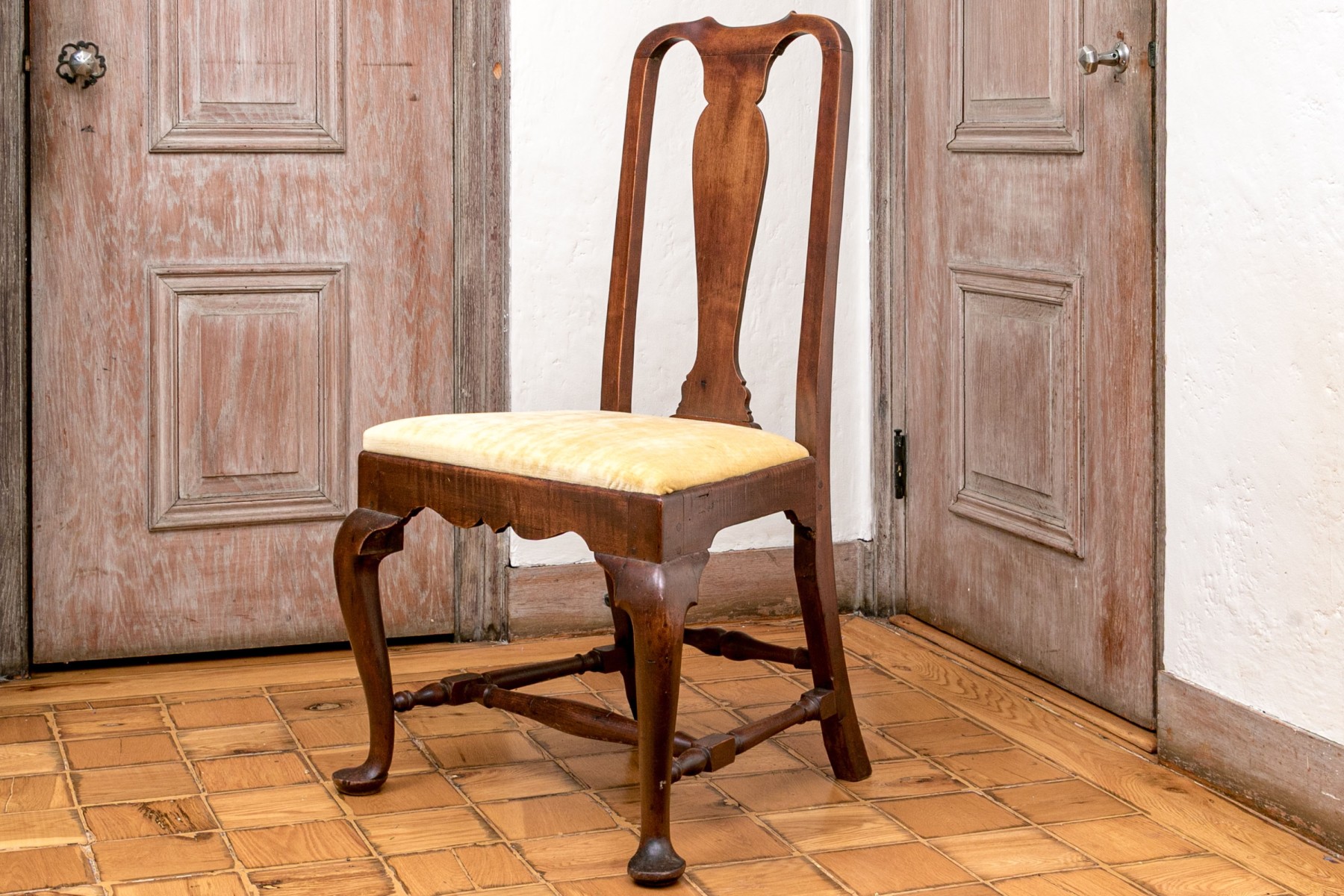 A delightful antique Queen Anne Connecticut side chair circa 1760. Well crafted in rich medium brown cherry, the chair features elegantly curved ears sloping into a slender vase form splat. A yellow velveteen slip seat fits into a nicely scalloped apron, raised over cabriole legs with pad feet and a nicely turned H-stretcher.