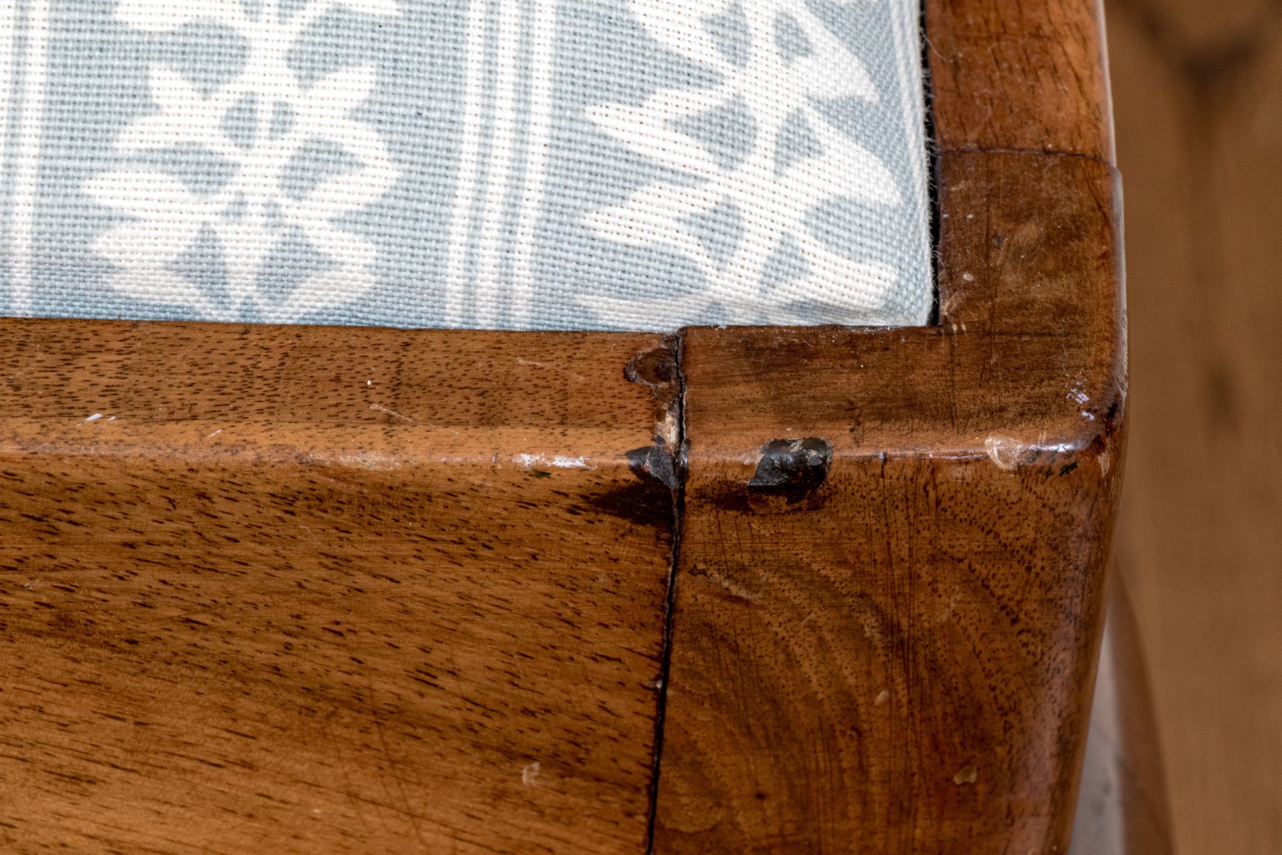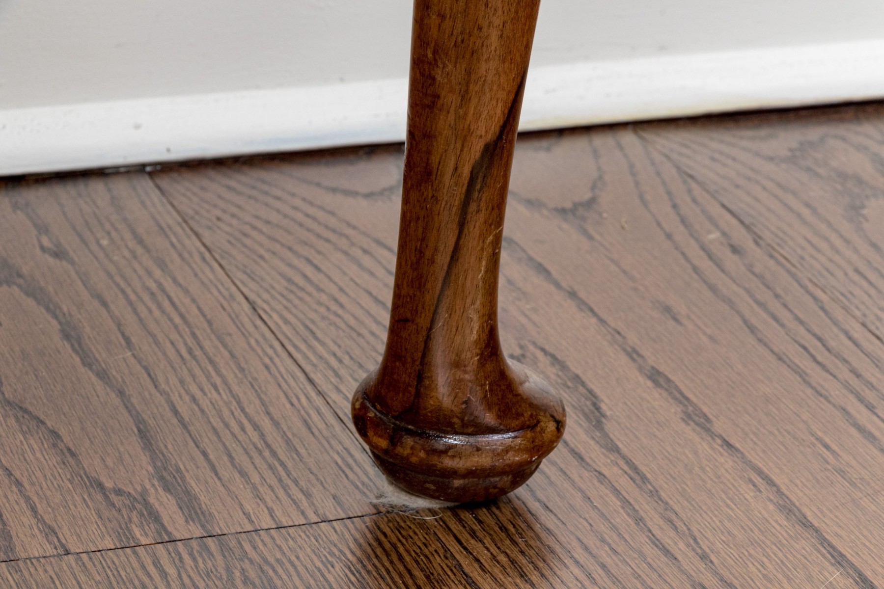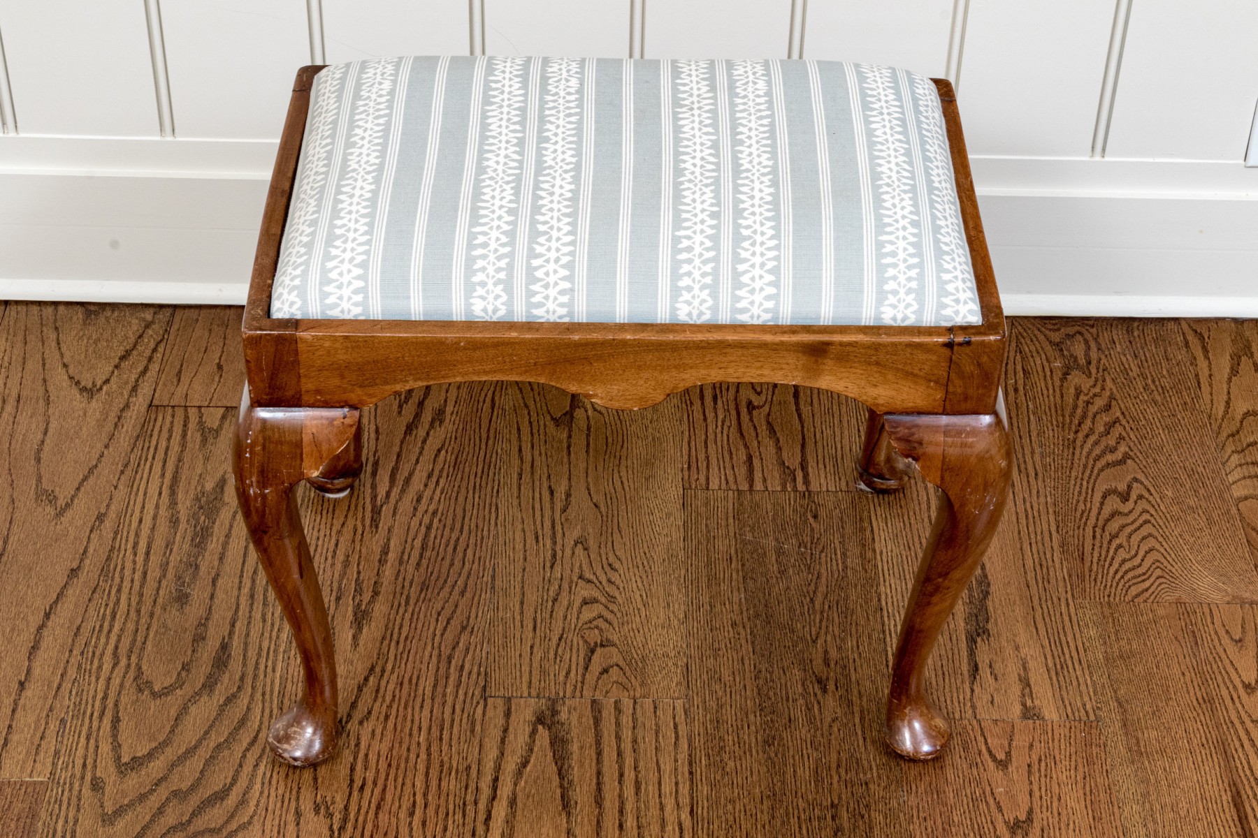 Wonderfully upholstered seat cushion that can be removed. On a wooden frame with cabriole legs and pad feet.