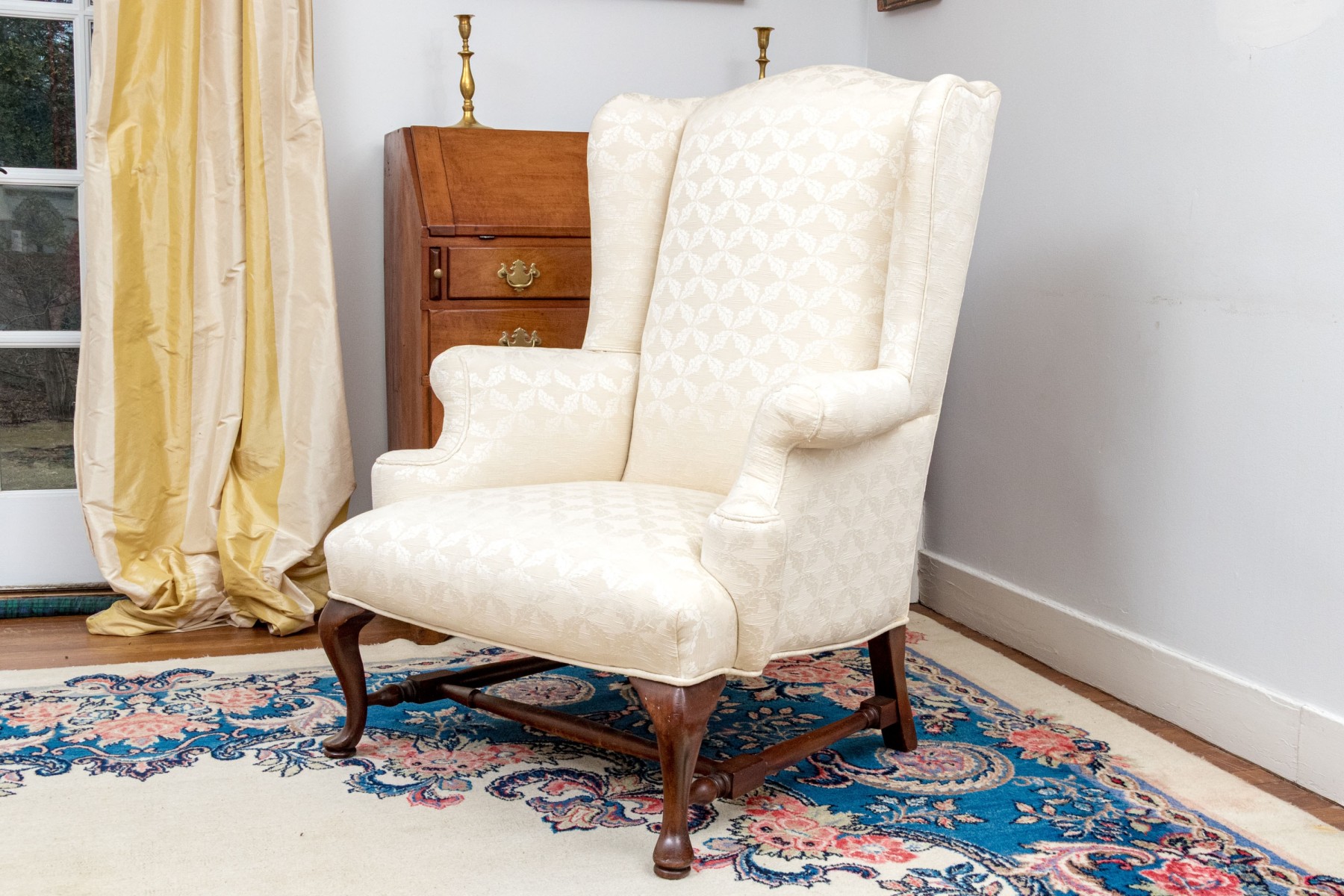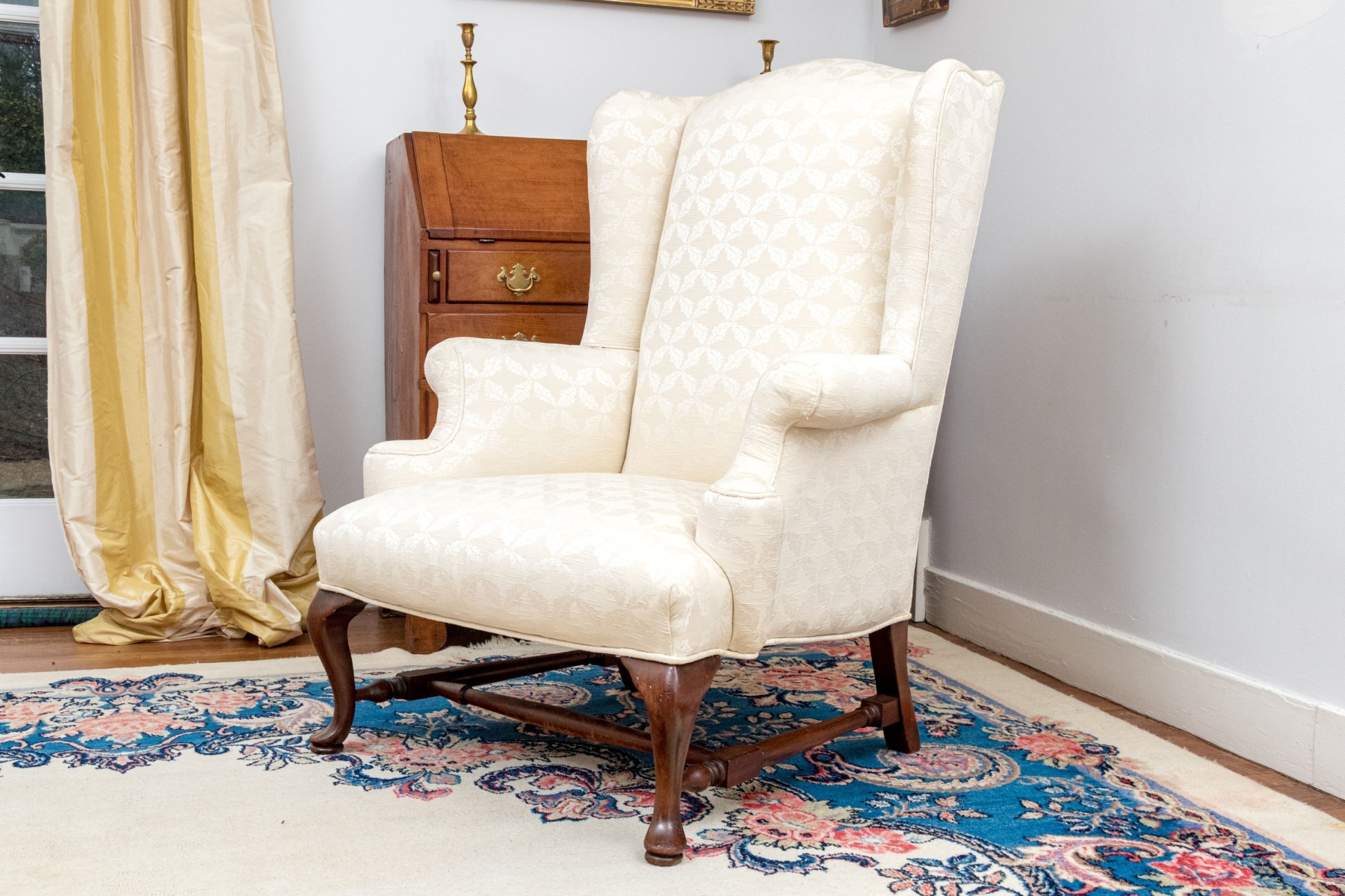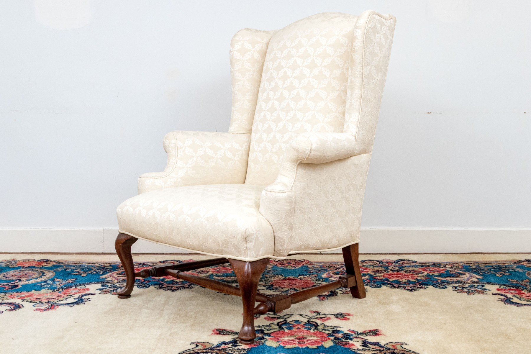 A gorgeous antique wingback armchair in classic form, sporting a tall back and low, deep-set seat later custom upholstered in cream white with circular medallion patterns. Raised over dark stained cherry cabriole front legs on pad feet supported by a turned H-stretcher.