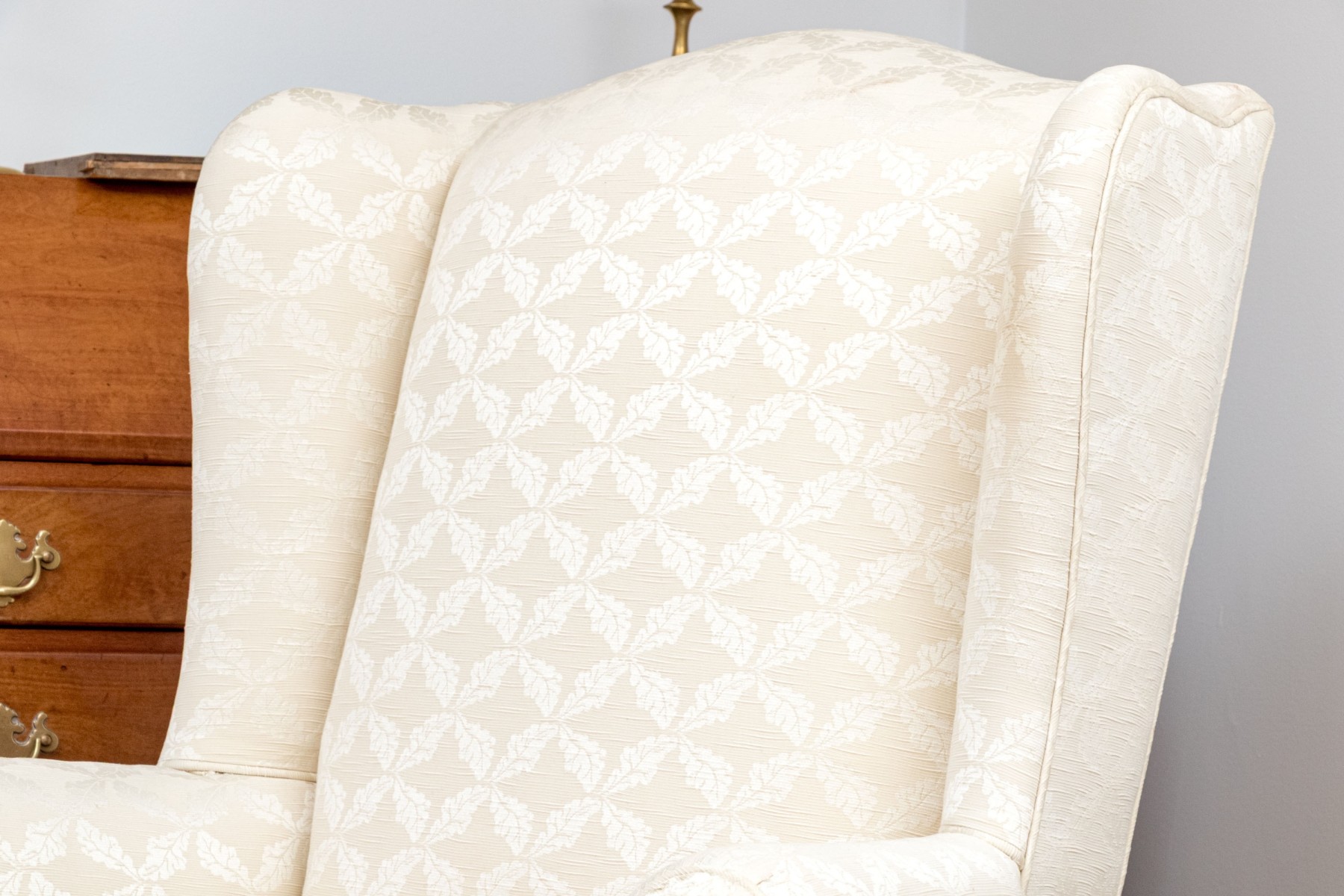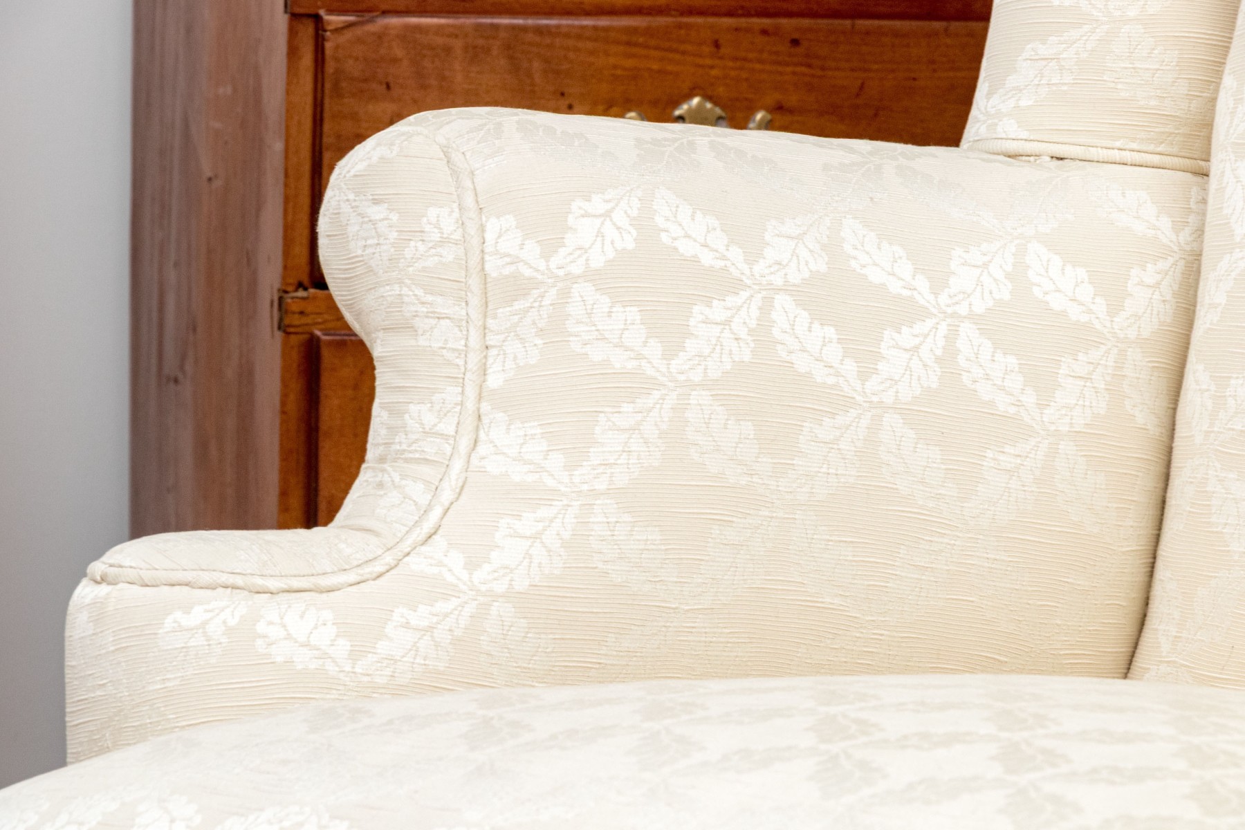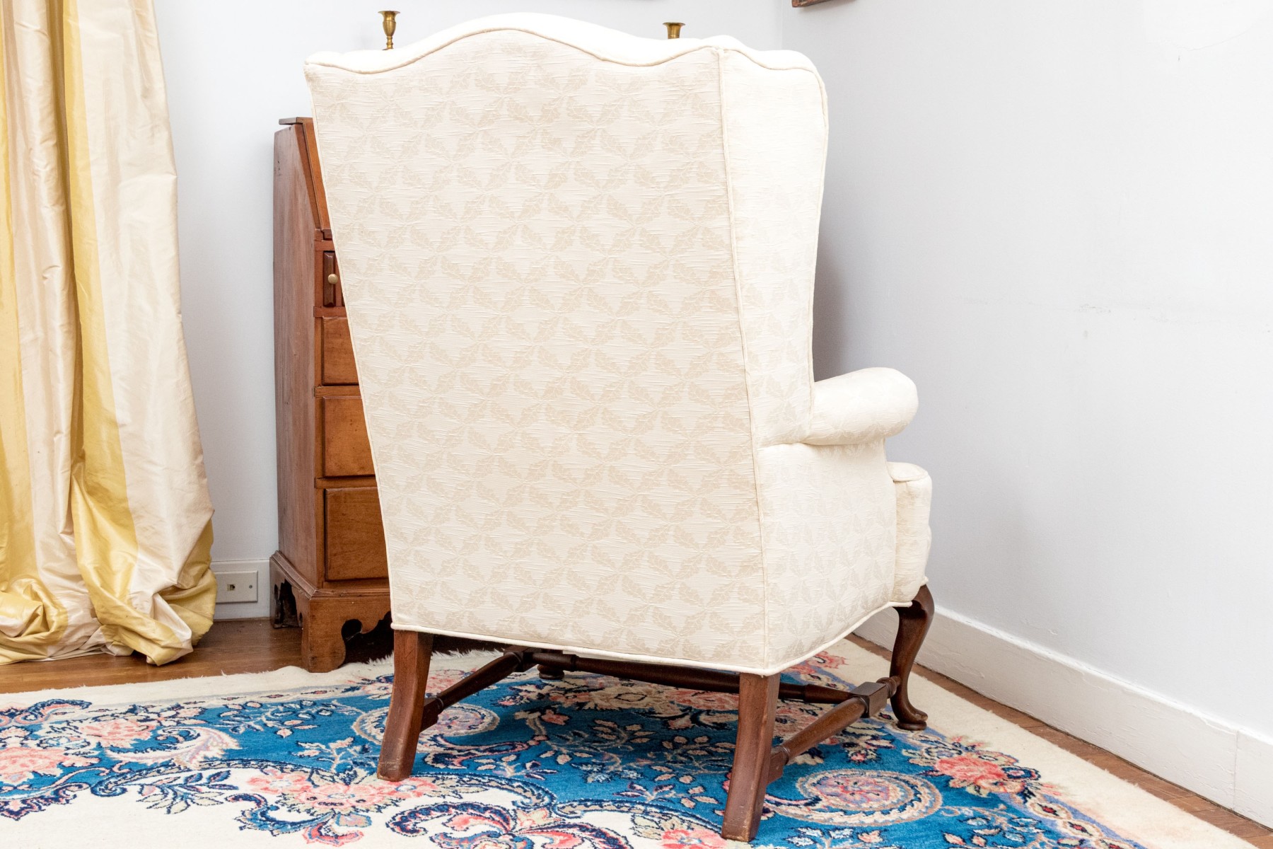 A gorgeous antique wingback armchair in classic form, sporting a tall back and low, deep-set seat later custom upholstered in cream white with circular medallion patterns. Raised over dark stained cherry cabriole front legs on pad feet supported by a turned H-stretcher.