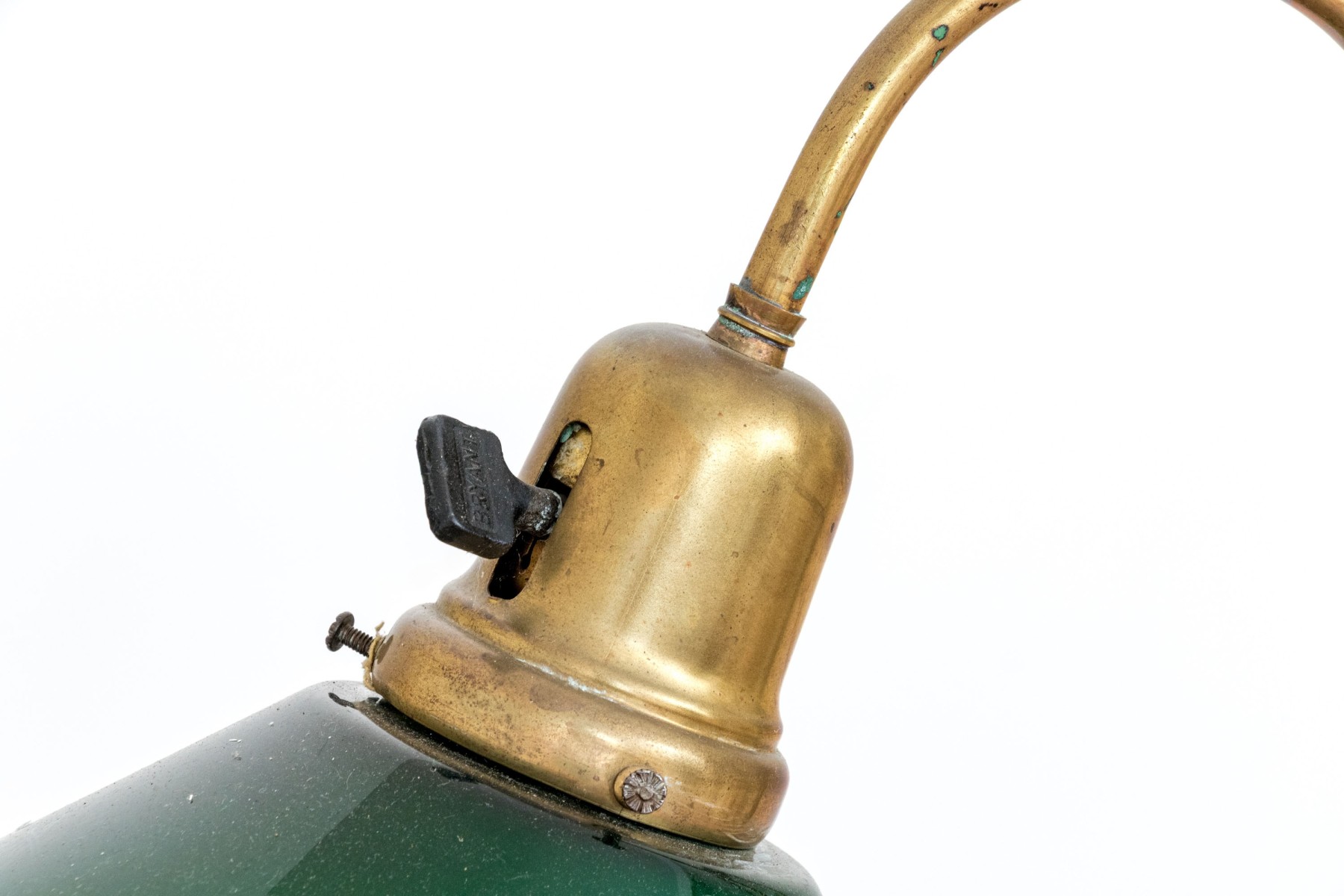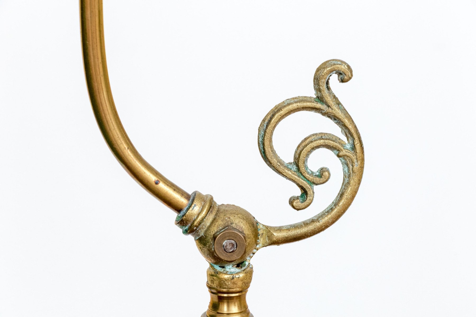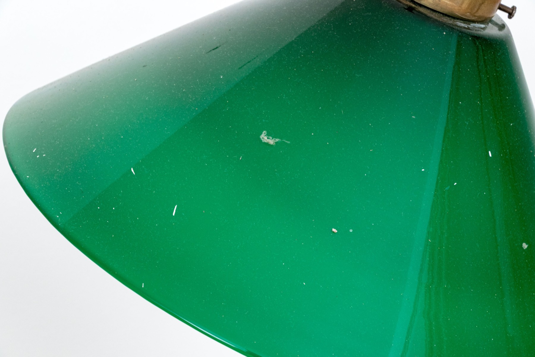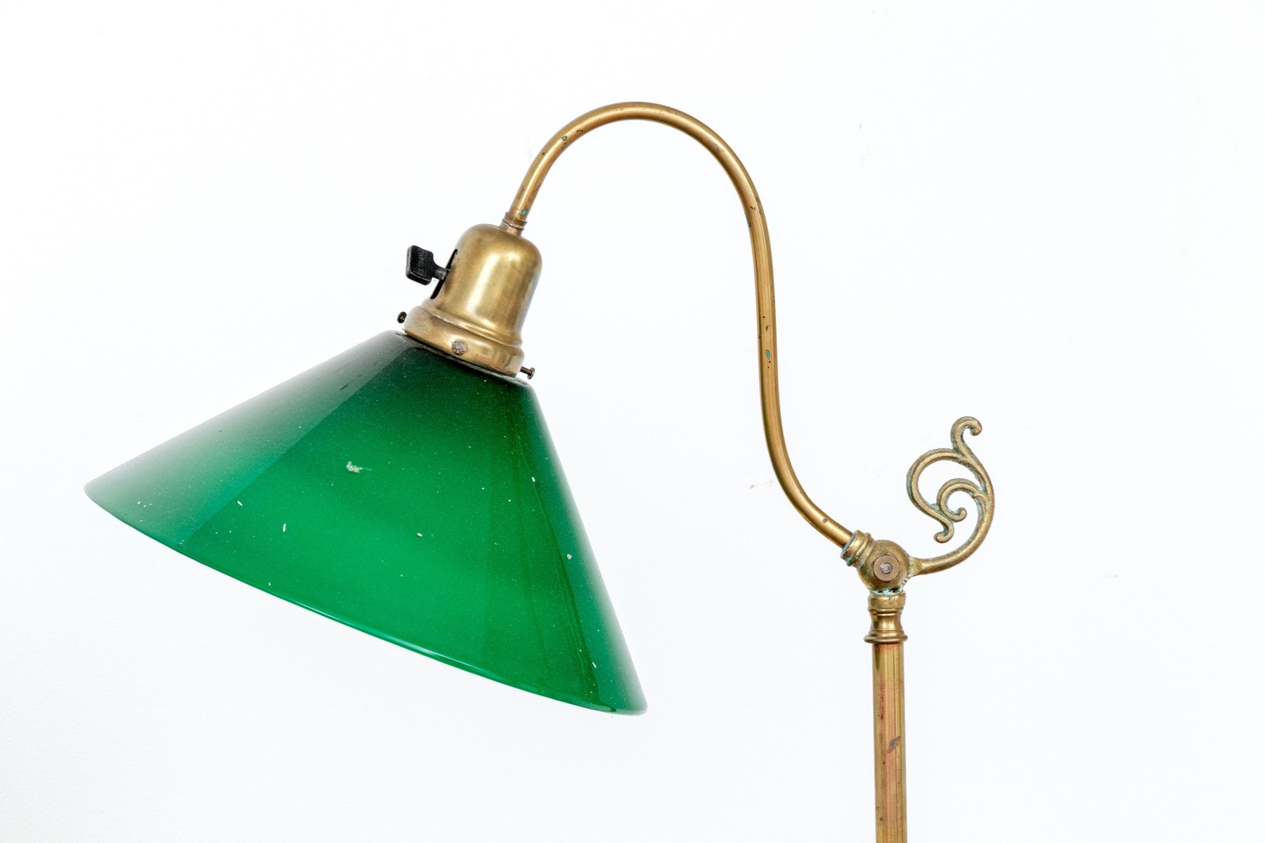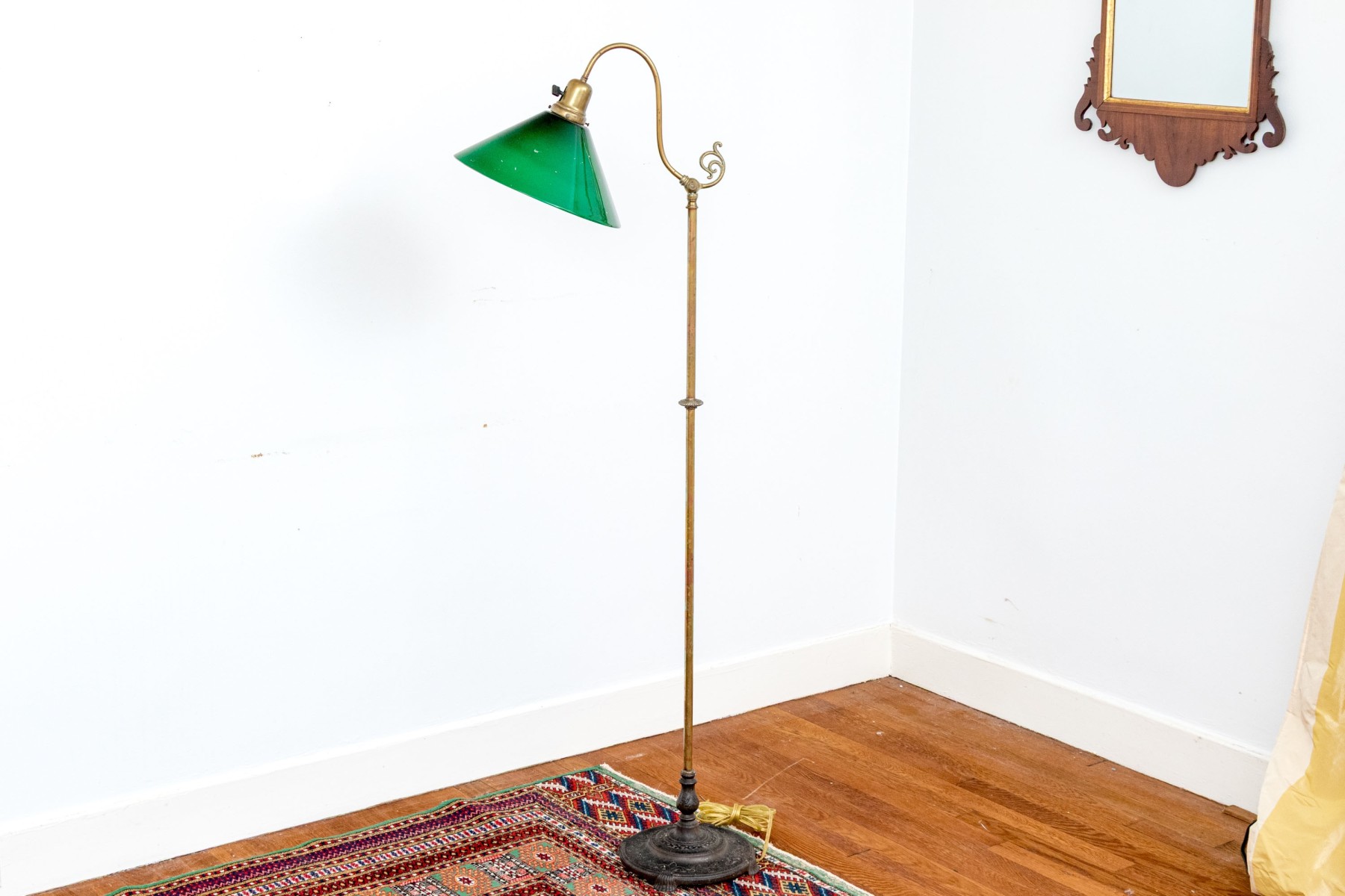 A fabulous floor lamp with great Art Nouveau and Arts and Crafts style, sporting a conical green glass shade on a scrolling S-form arm with a vine-like flourish at the end, affixed to a sleek cylindrical column leading down to a dark circular base.