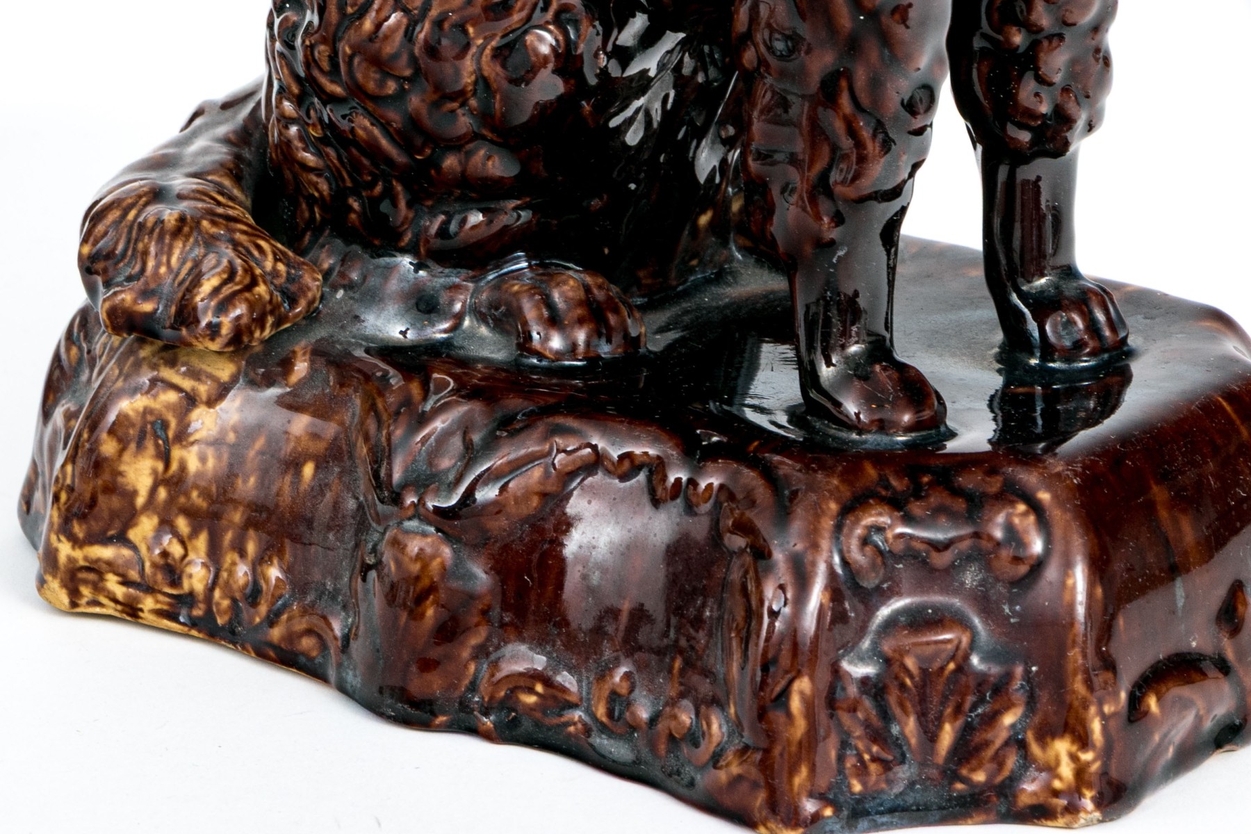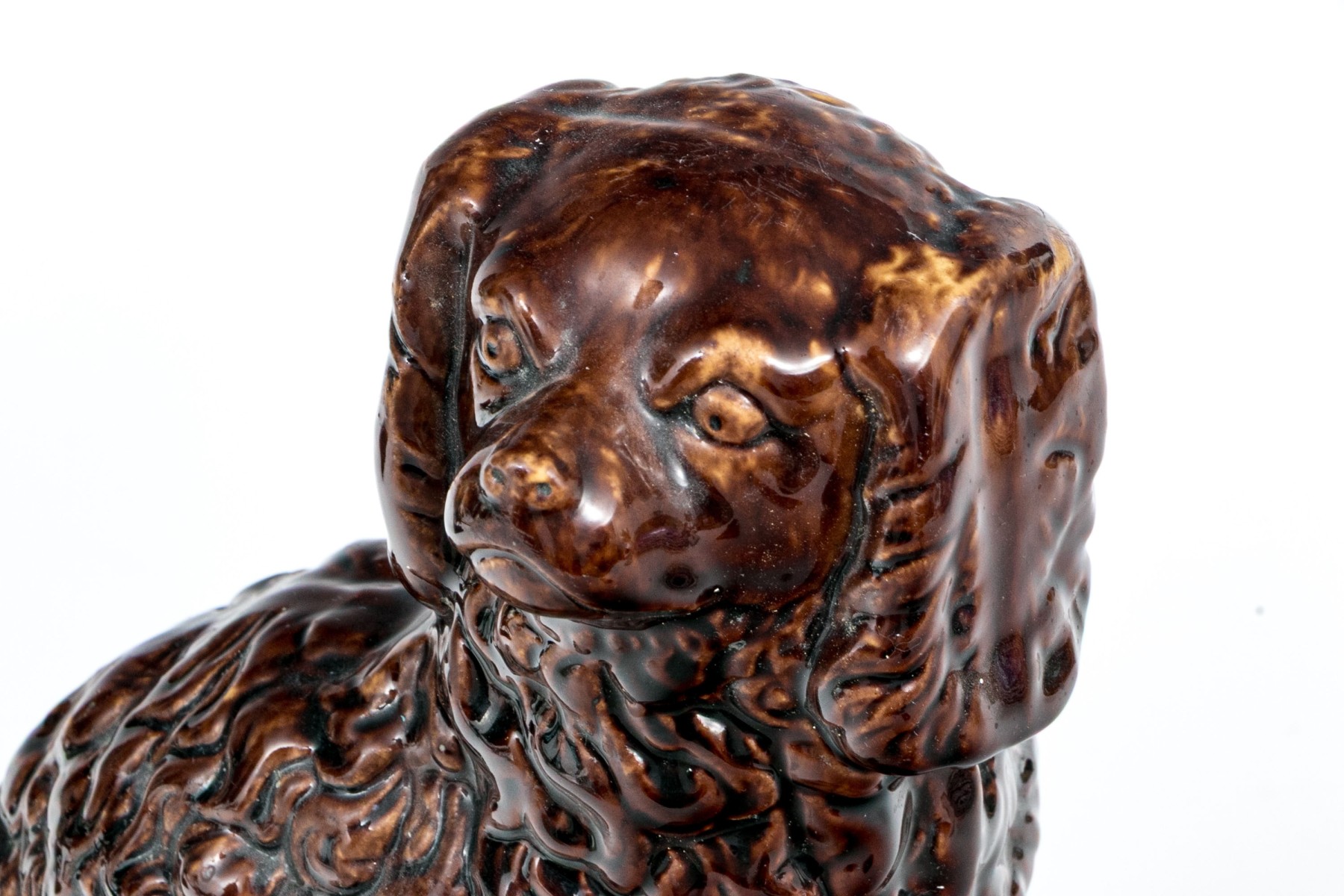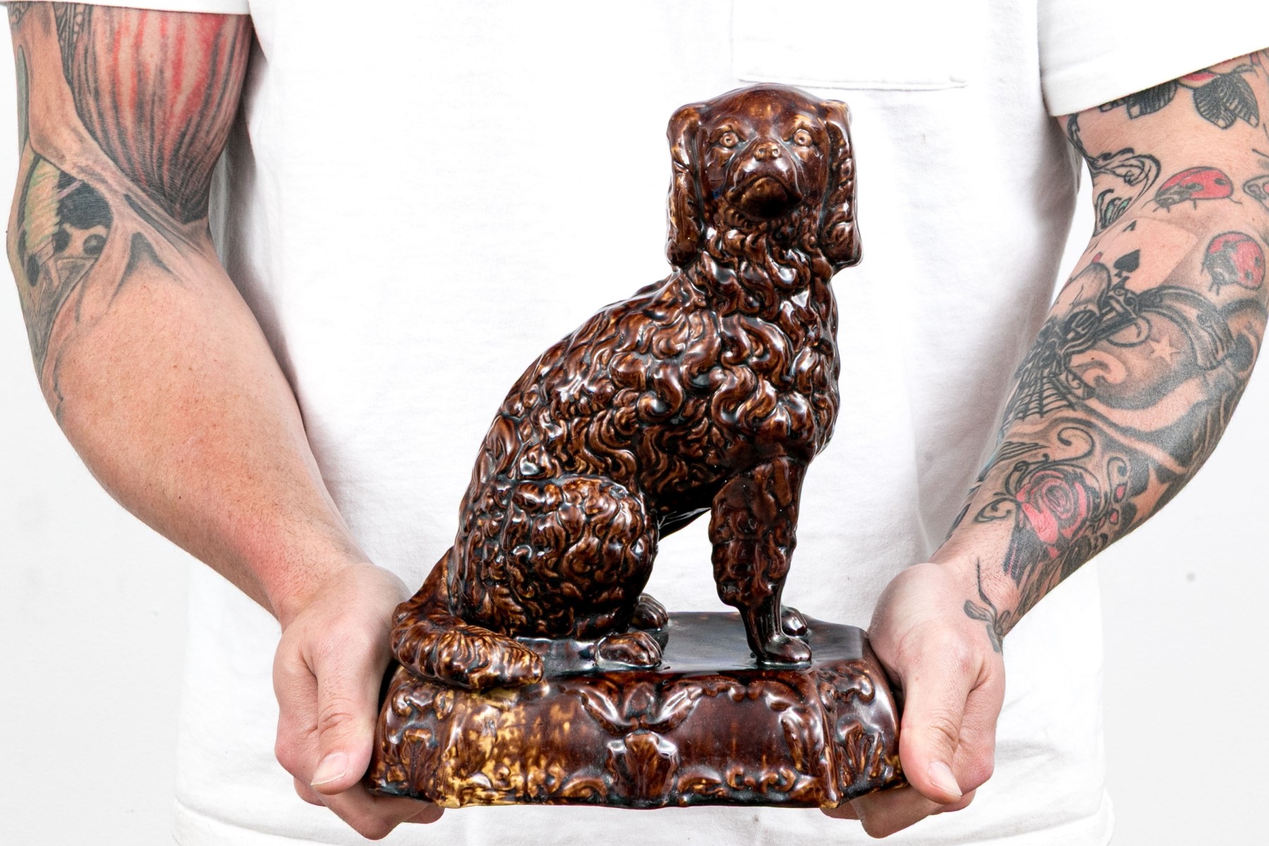 A delightful antique ceramic figure of a Spaniel dog in classic Rockingham/Bennington brown glaze with beautiful cream mottling. The dog is seen with head turned in attention and body seated in profile over a cut-corner rectangular base. Beautifully detailed throughout the fur texture and finished with foliate relife around the base.