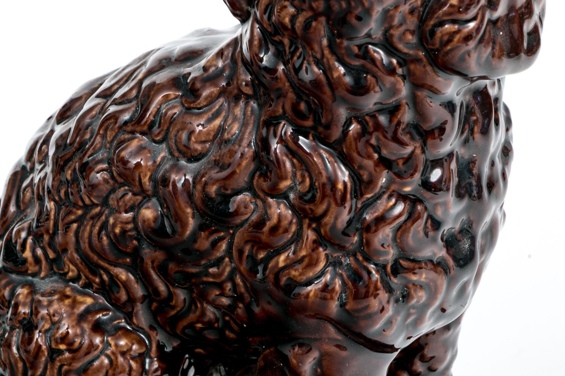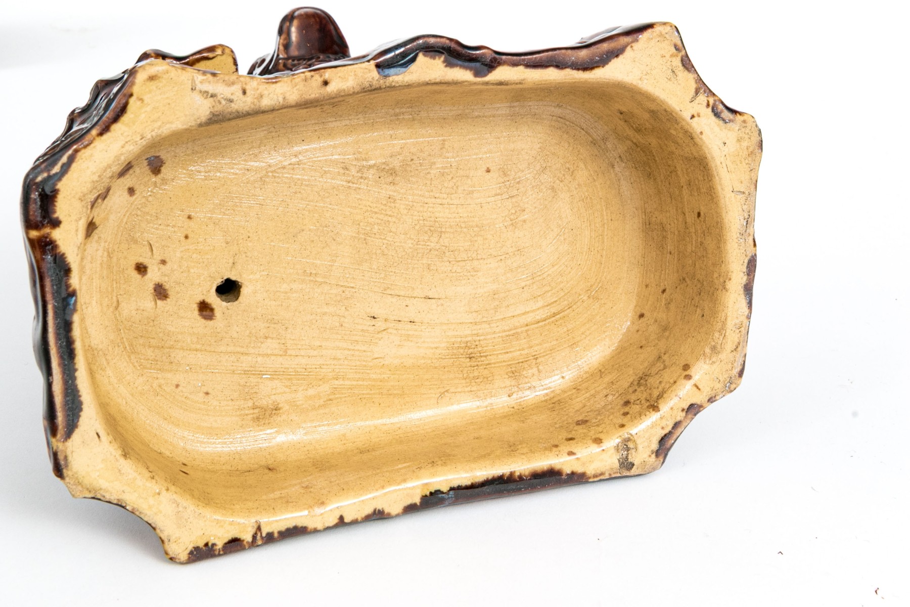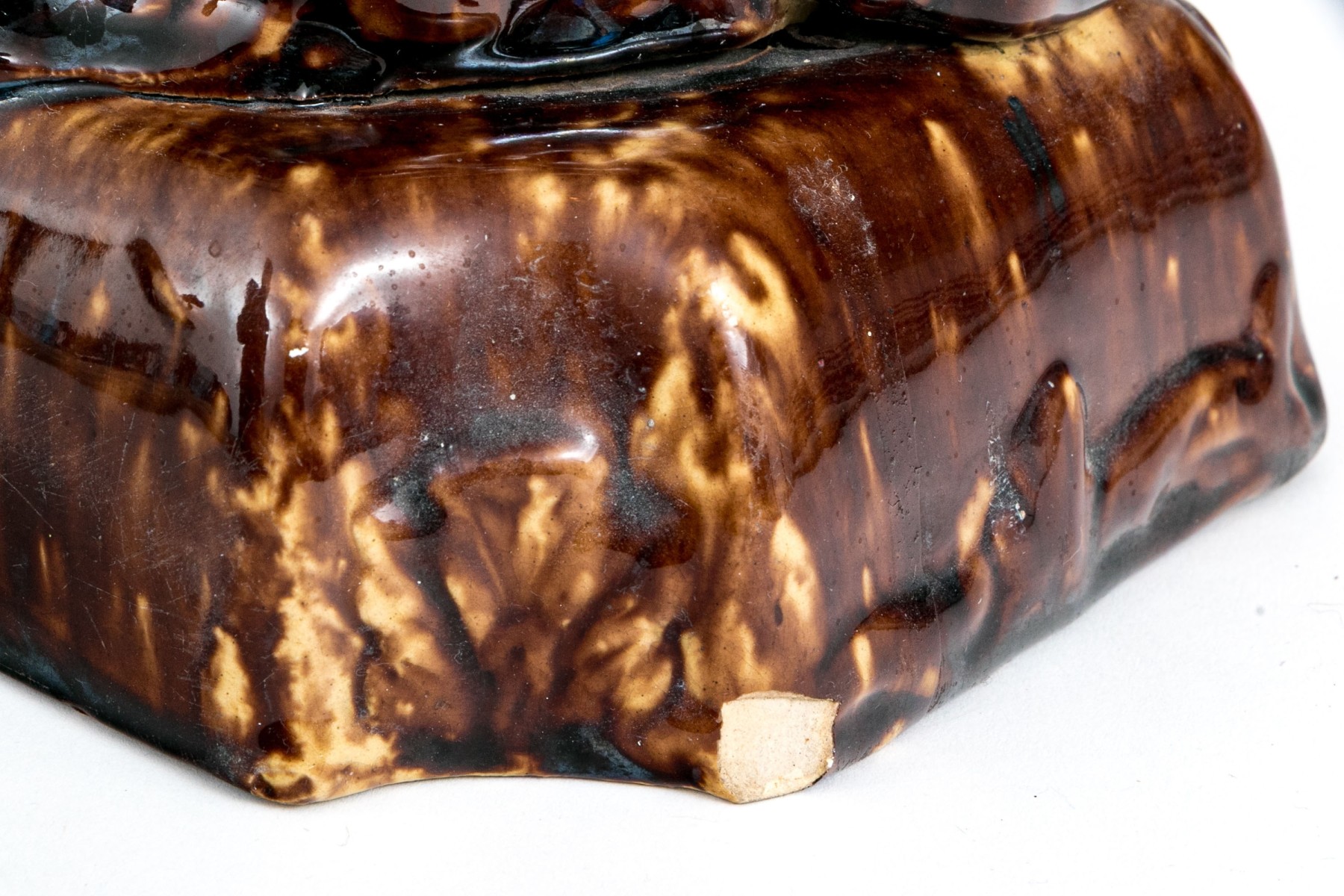 A delightful antique ceramic figure of a Spaniel dog in classic Rockingham/Bennington brown glaze with beautiful cream mottling. The dog is seen with head turned in attention and body seated in profile over a cut-corner rectangular base. Beautifully detailed throughout the fur texture and finished with foliate relife around the base.