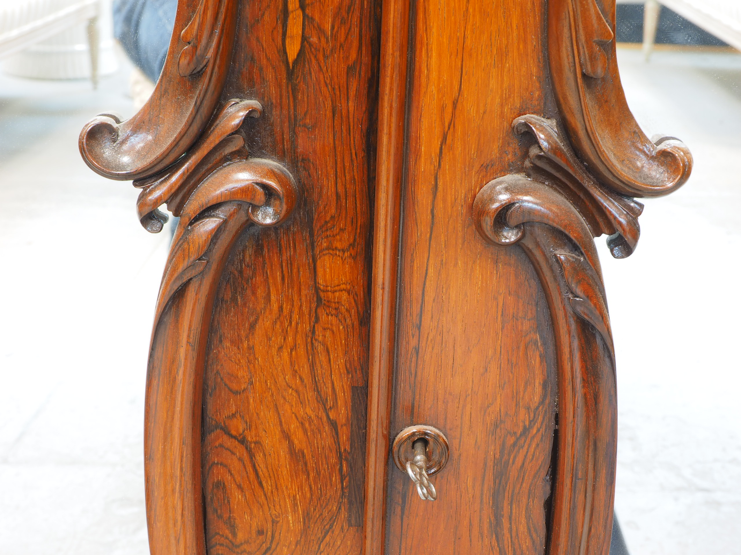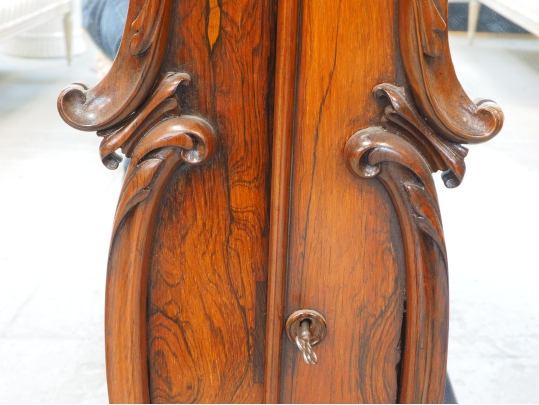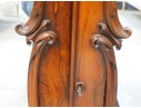 Fine antique sideboard server with much decorative carving in a flowing Art Nouveau/ Baroque style. The chosen wood is particularly rich in graining and flow. Condition is very good with age appropriate veneer lift in some areas, and some very slight nicks . There is age related acceptable wear to the interior and one shelf. Working original lock with key.