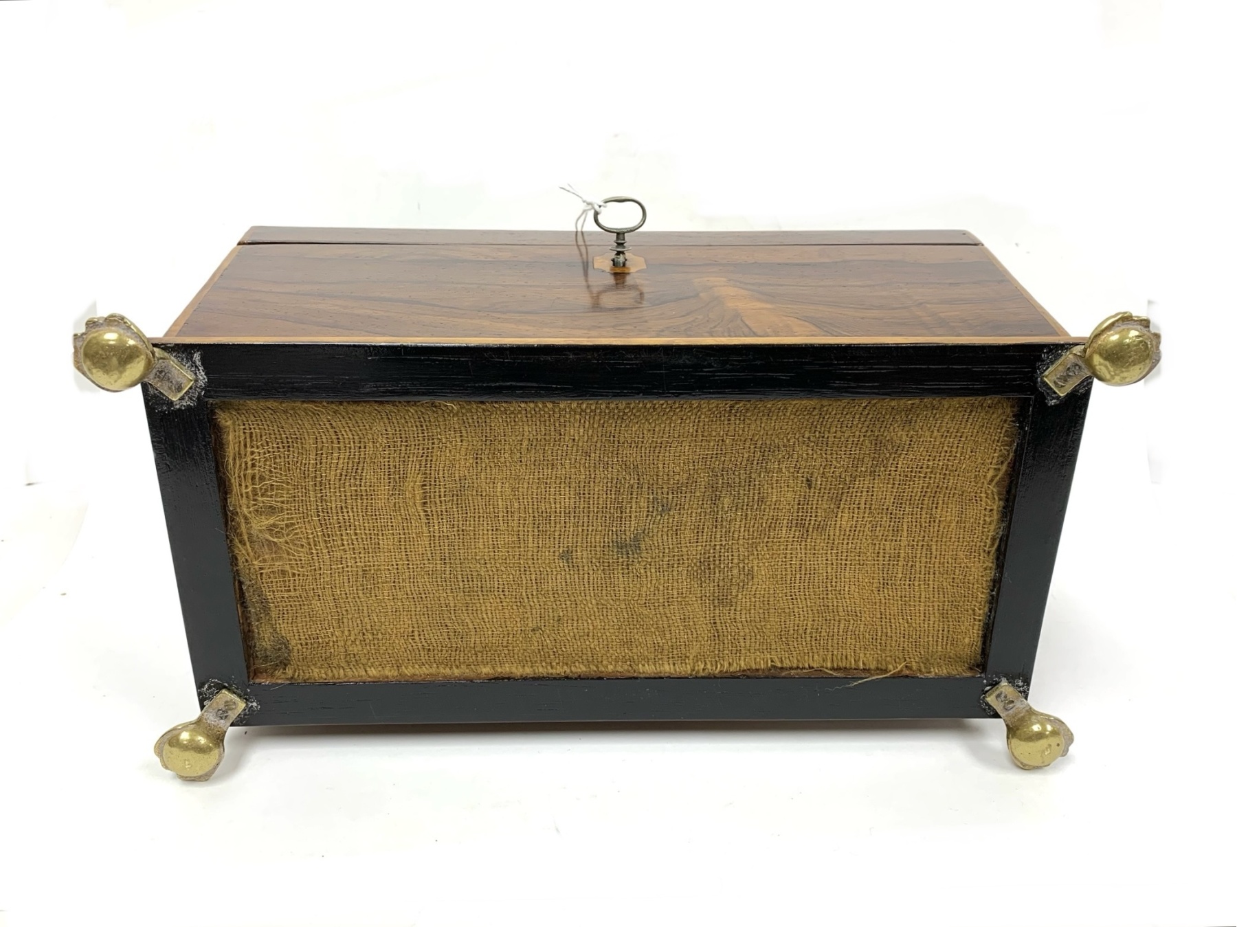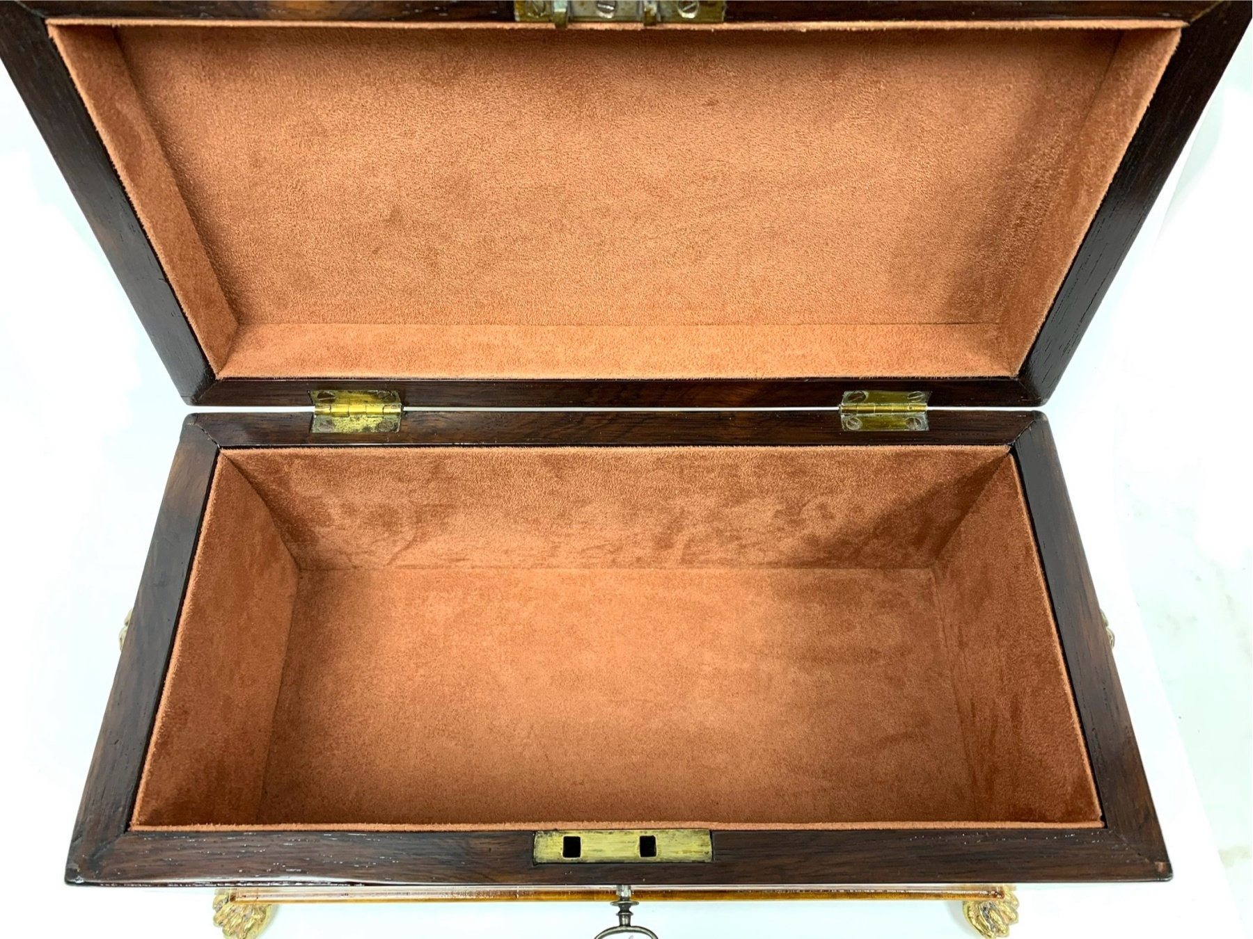 The box is adorned with brass lion's head ring handles on the sides and sits on brass lion's paw feet. Comes with a working key.