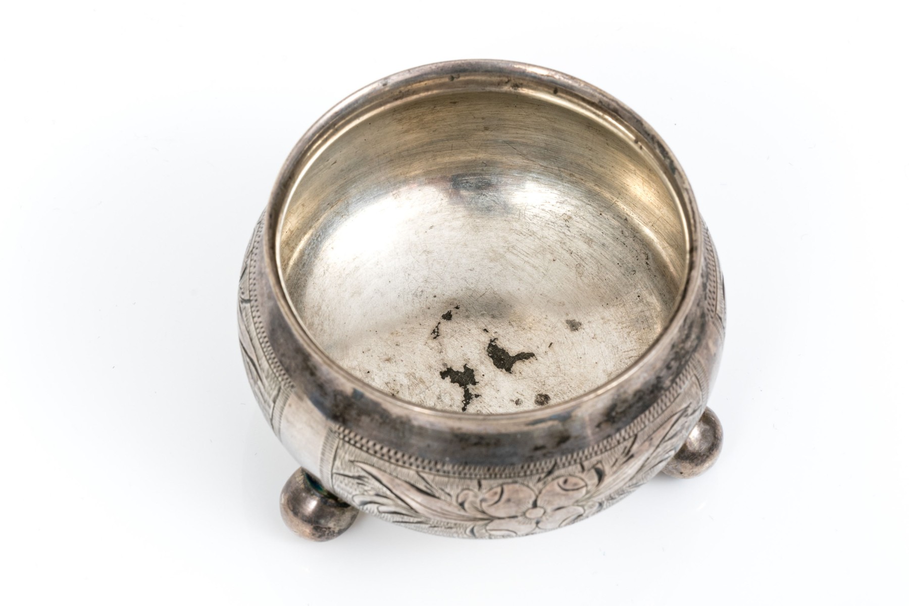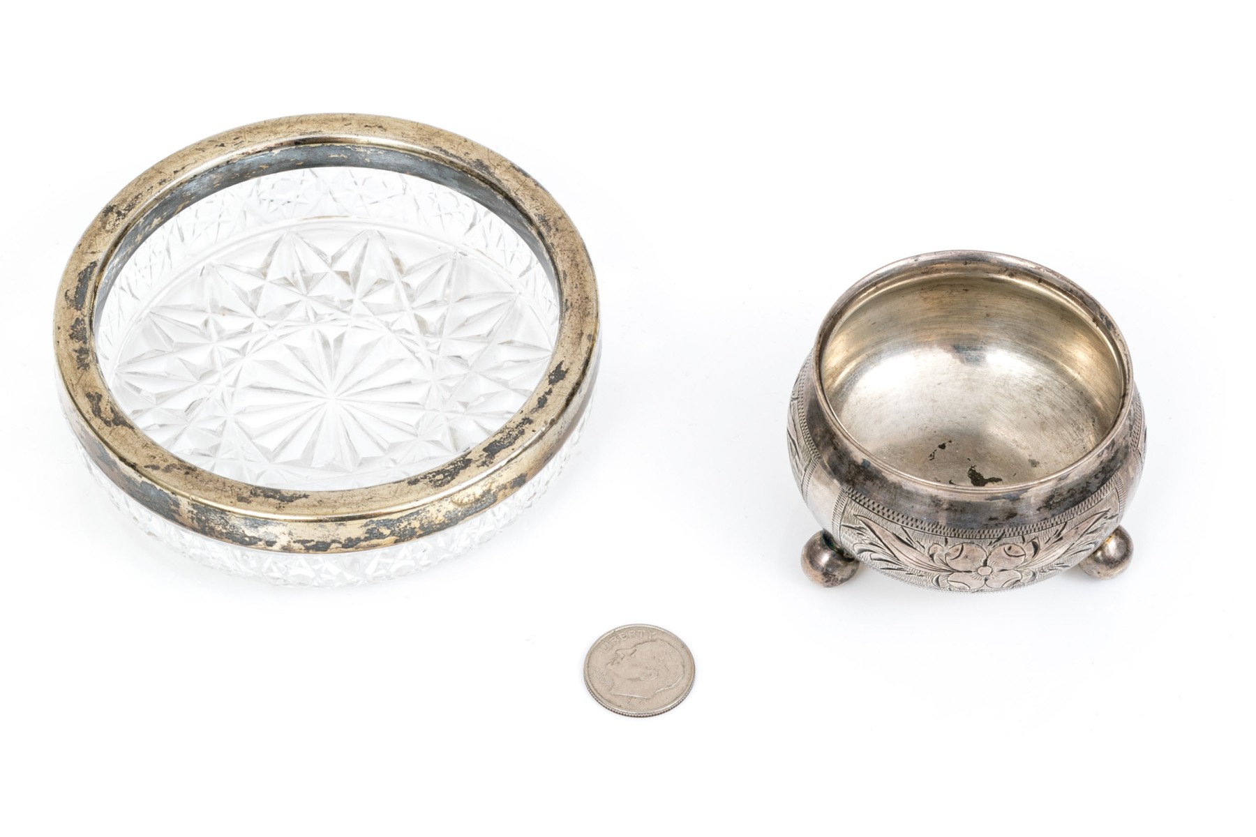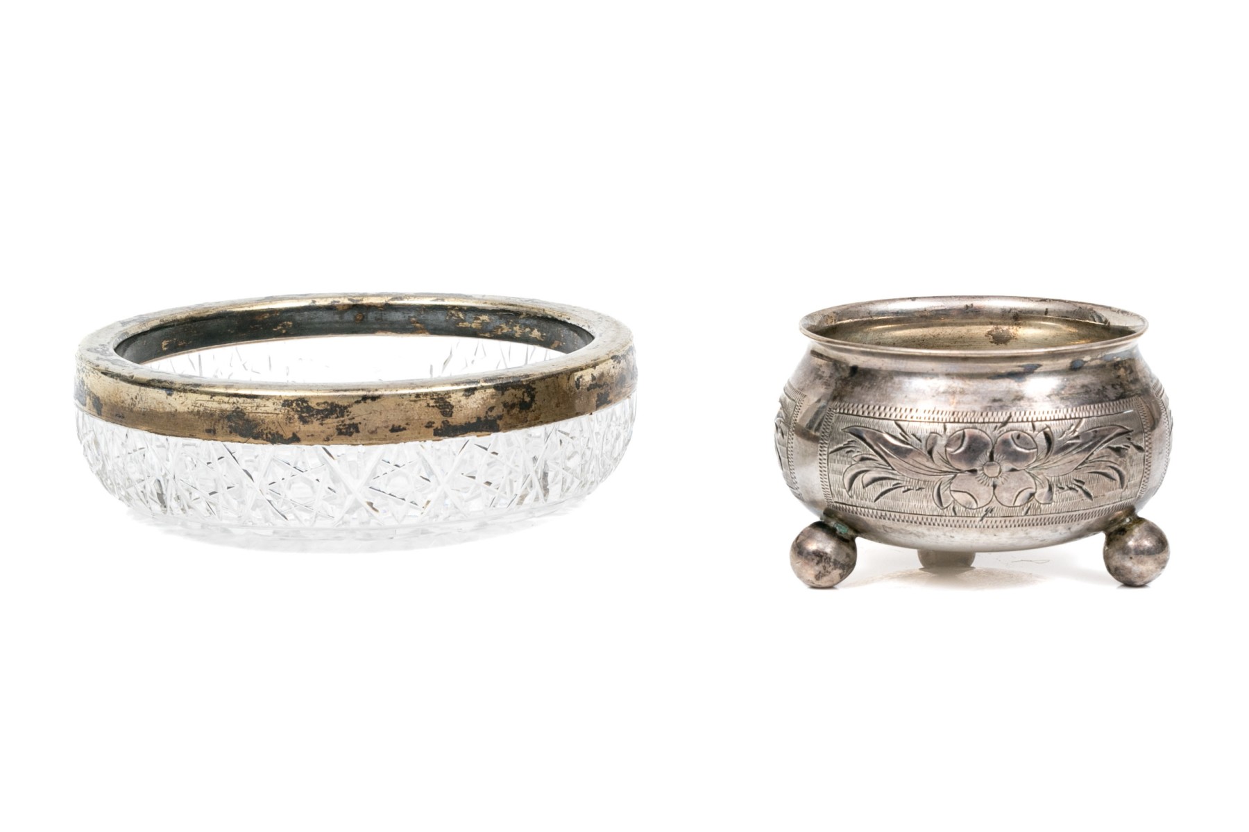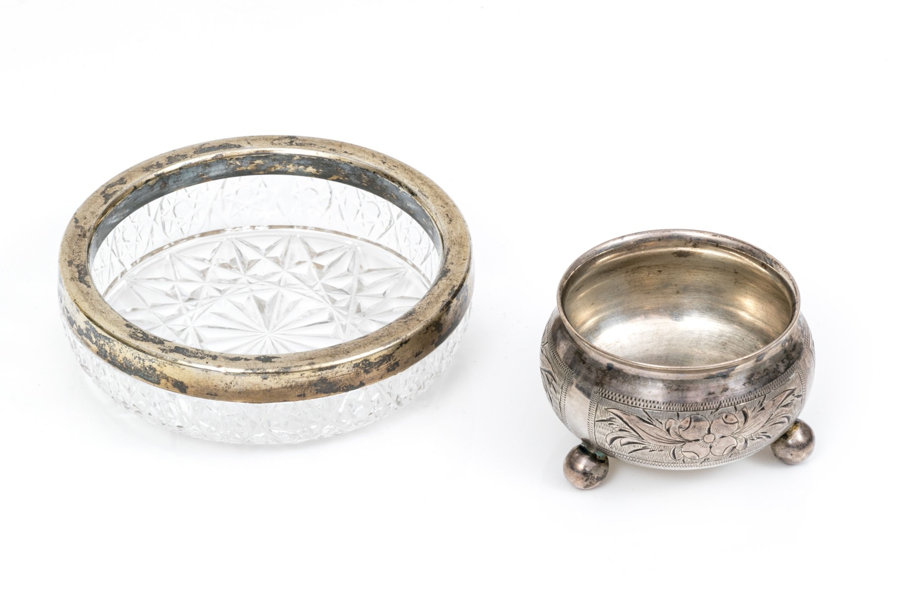 Antique Russian 84 silver chased salt and 875 Russian silver rimmed cut glass nut dish