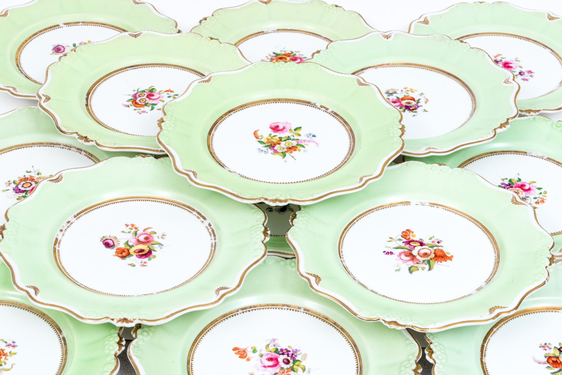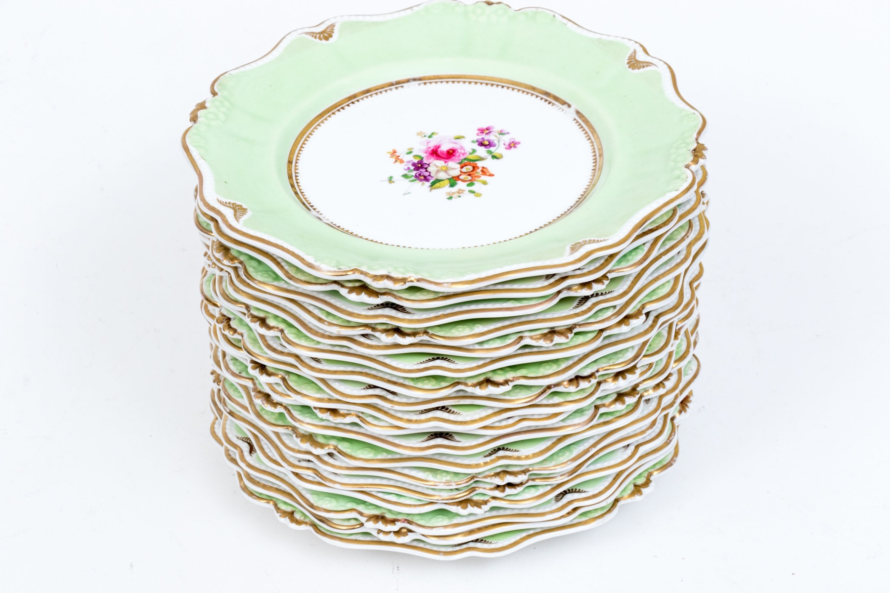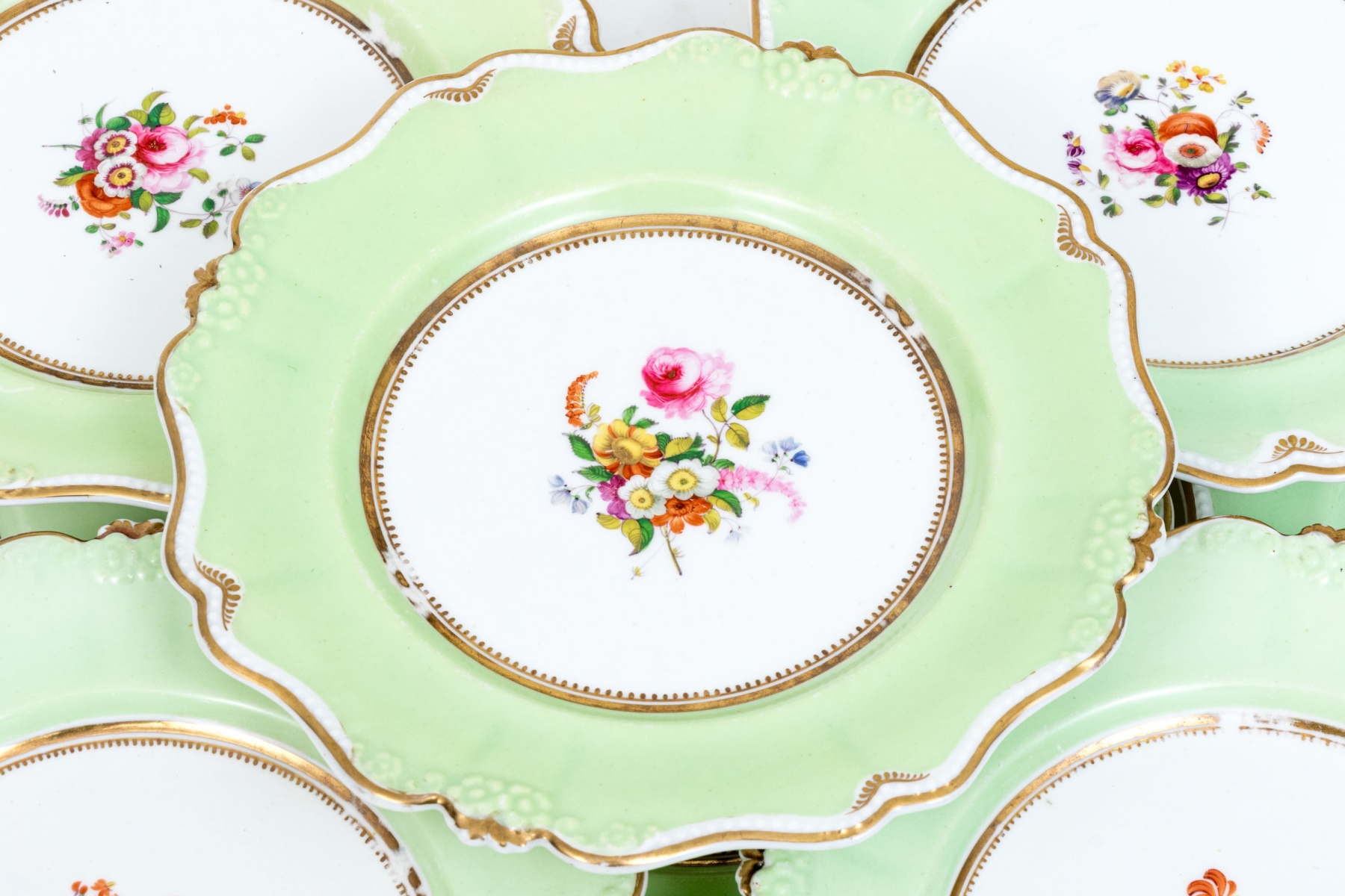 A great set of eighteen Paris porcelain plates with scalloped and gilt finished rims surrounding green borders with interior gilt trims surrounding the polychromatic floral bouquet.