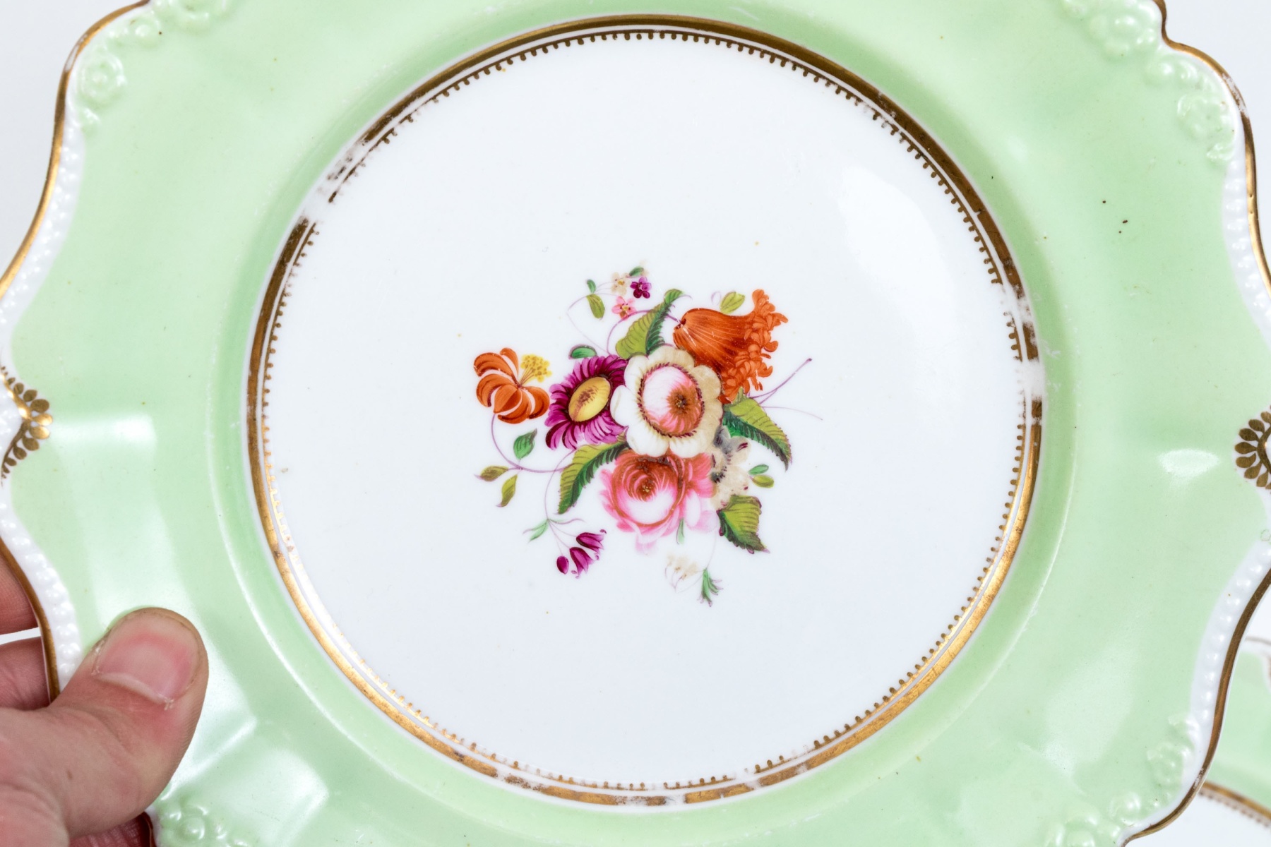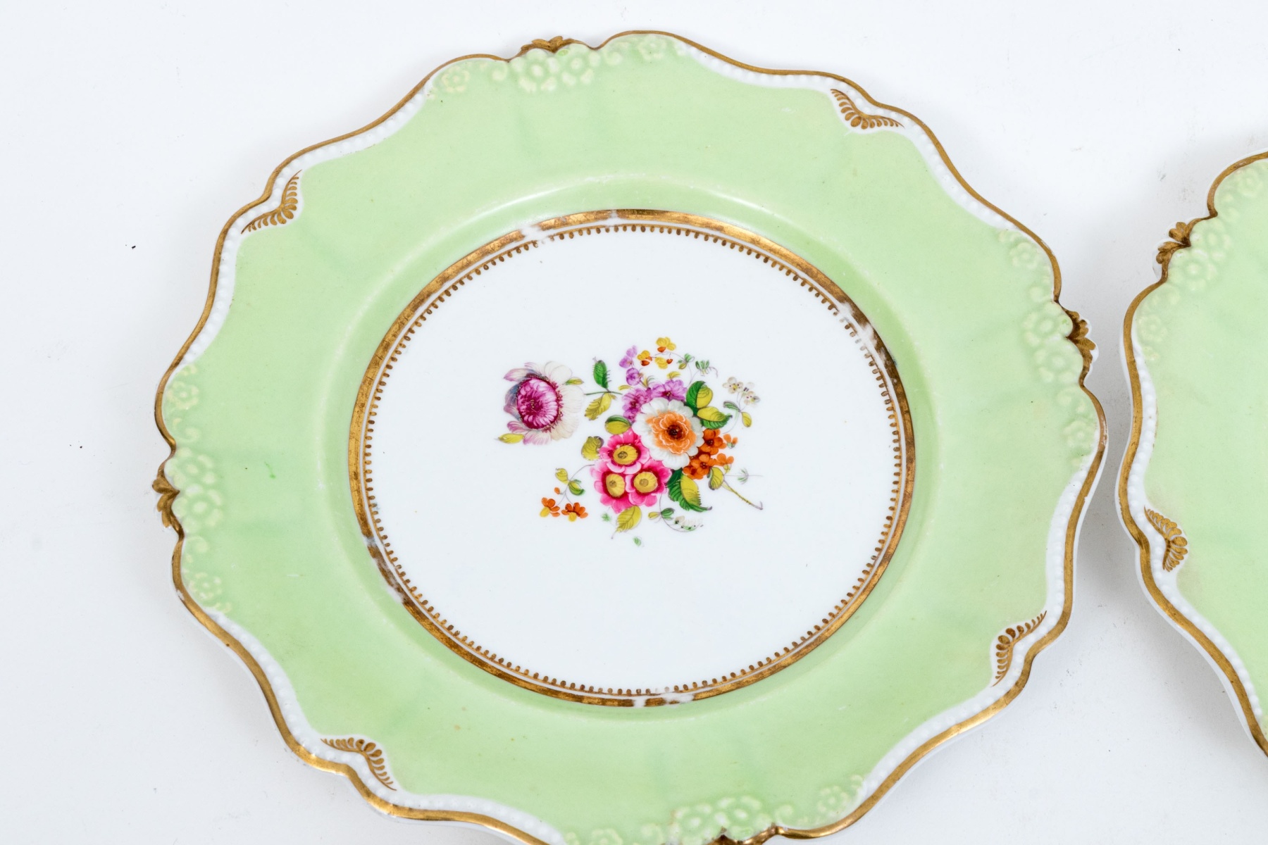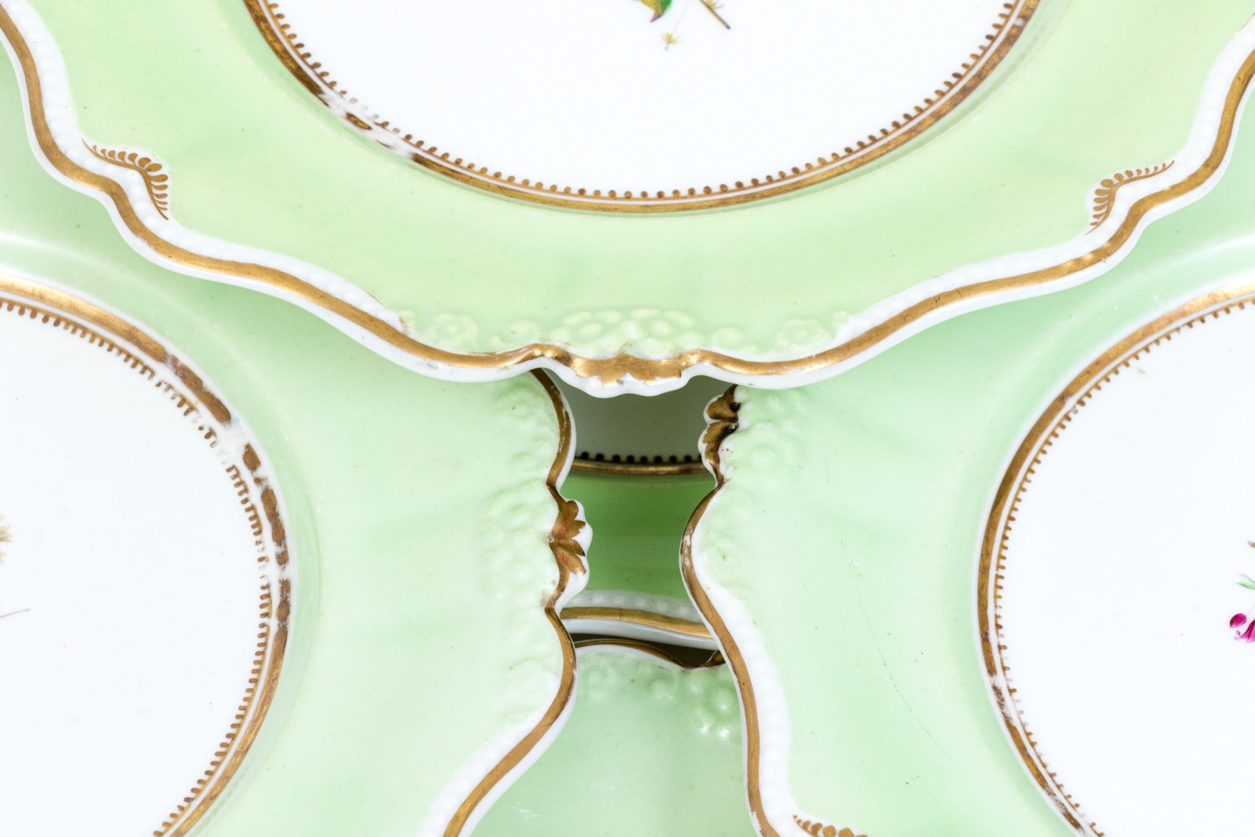 A great set of eighteen Paris porcelain plates with scalloped and gilt finished rims surrounding green borders with interior gilt trims surrounding the polychromatic floral bouquet.