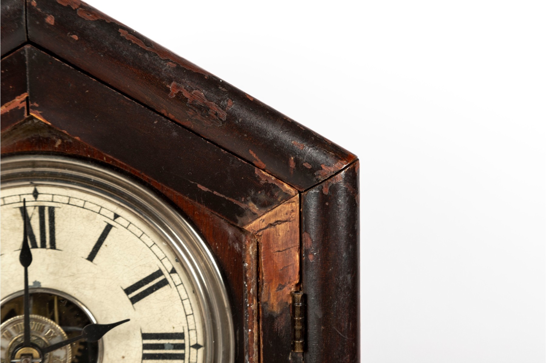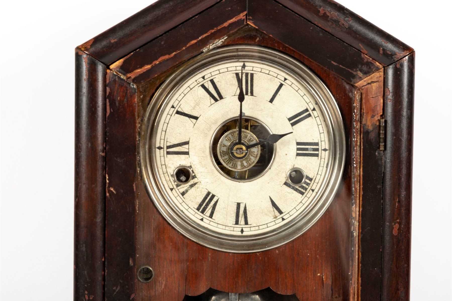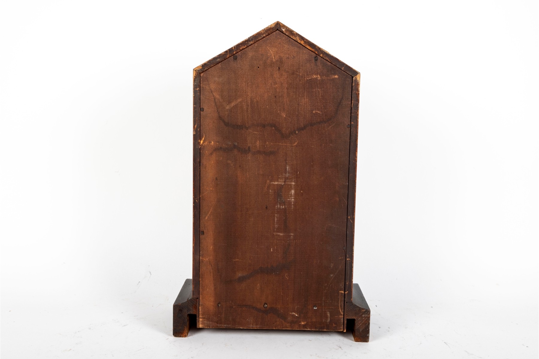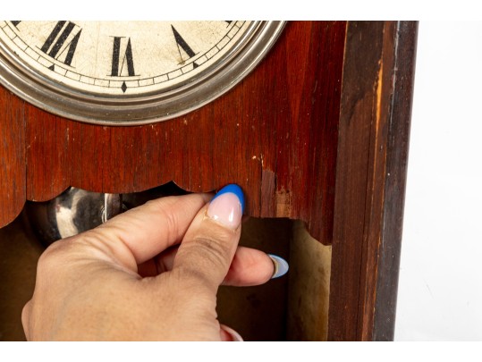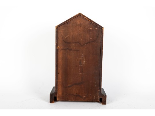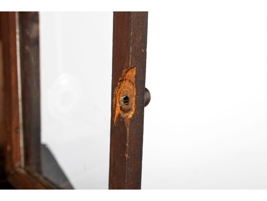 Consistent with age. Losses to wood trim/veneers. Loose wood trim which holds the glass window in place. Unknown if functional.
