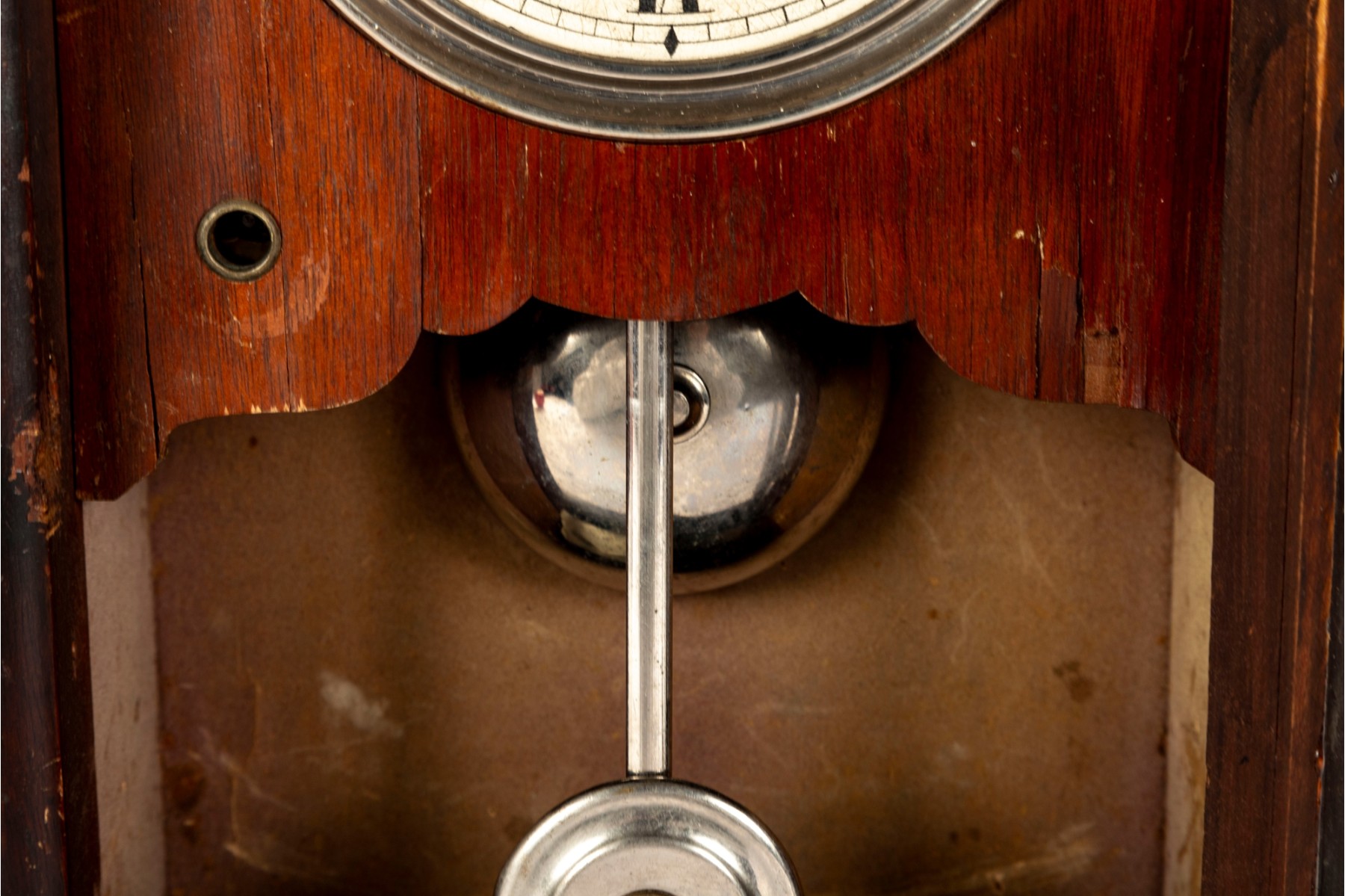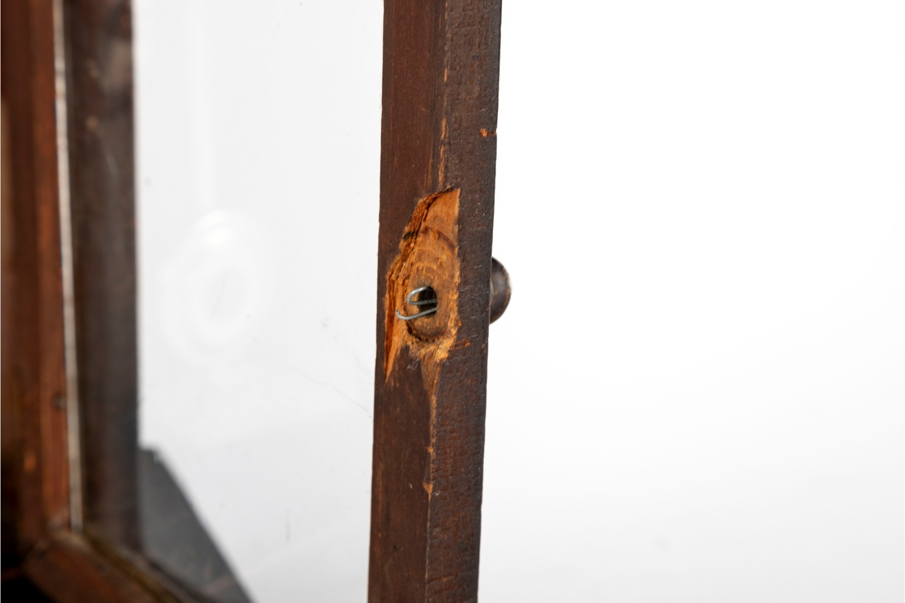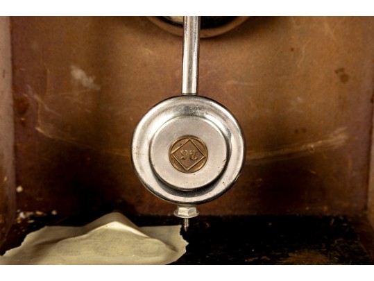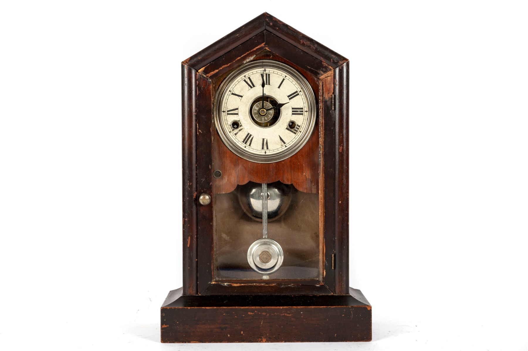 Consistent with age. Losses to wood trim/veneers. Loose wood trim which holds the glass window in place. Unknown if functional.