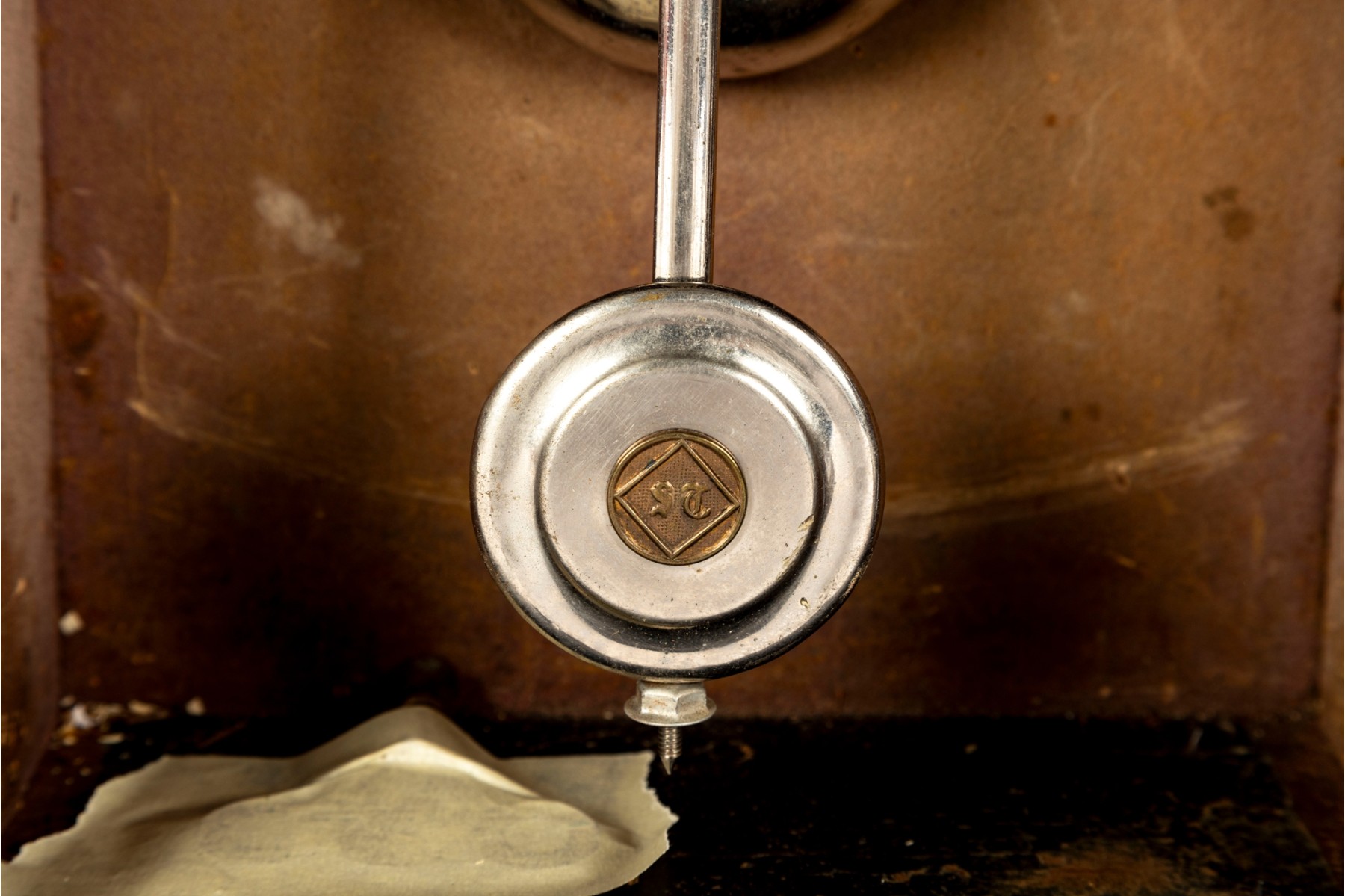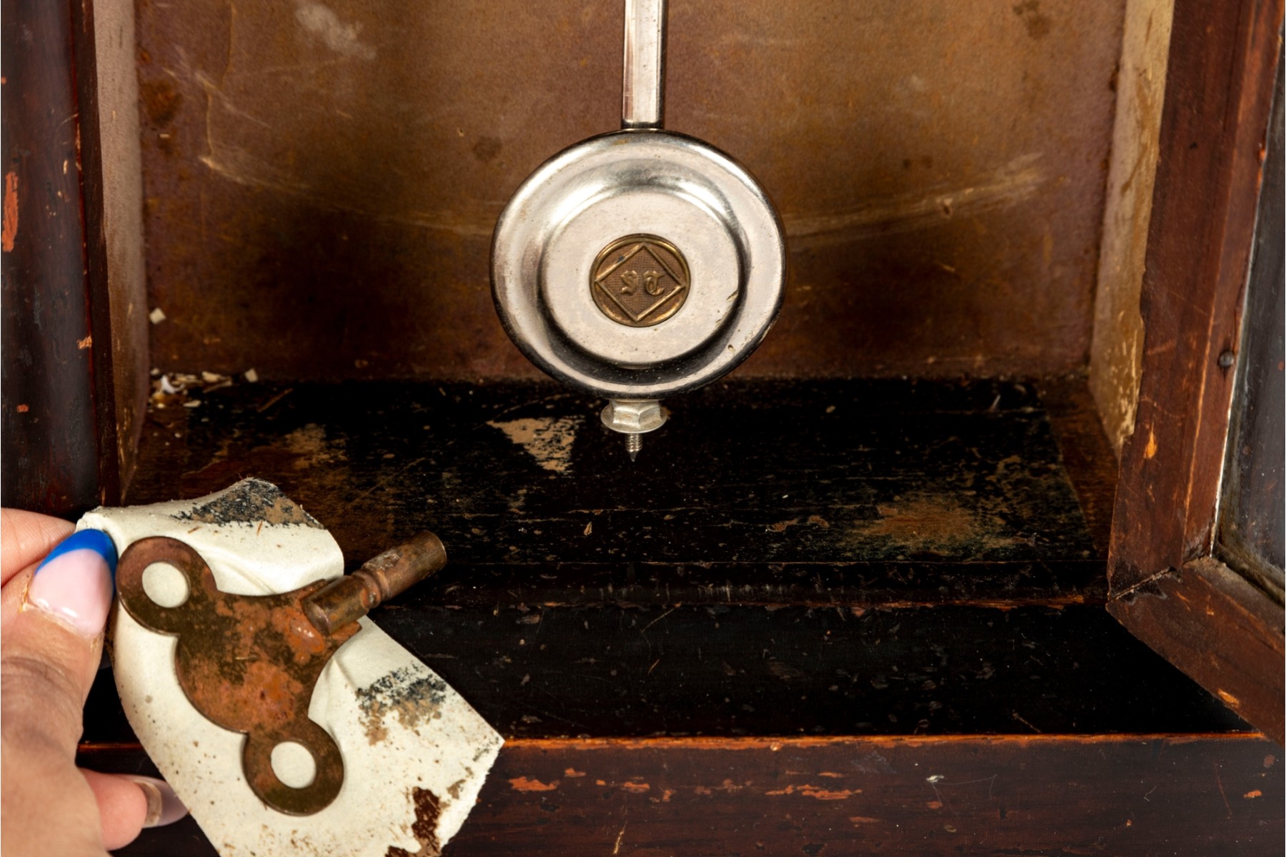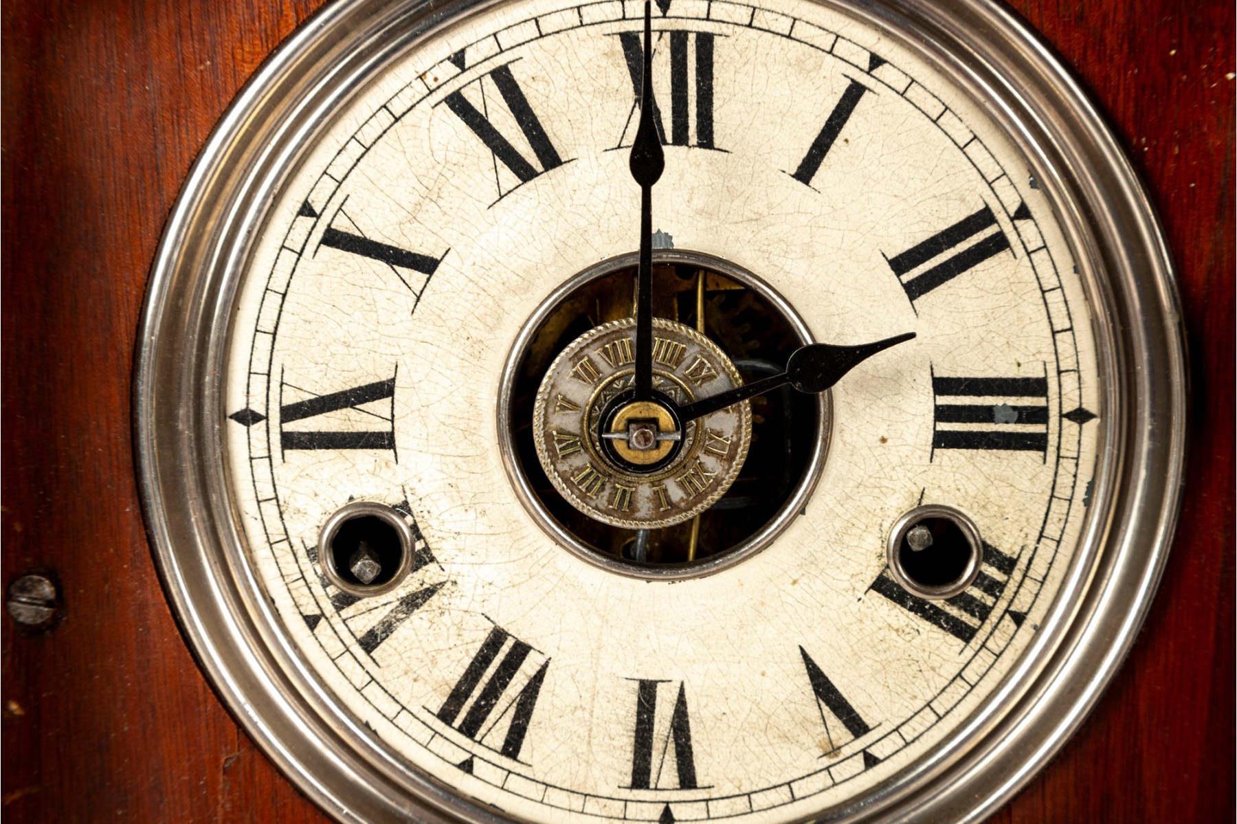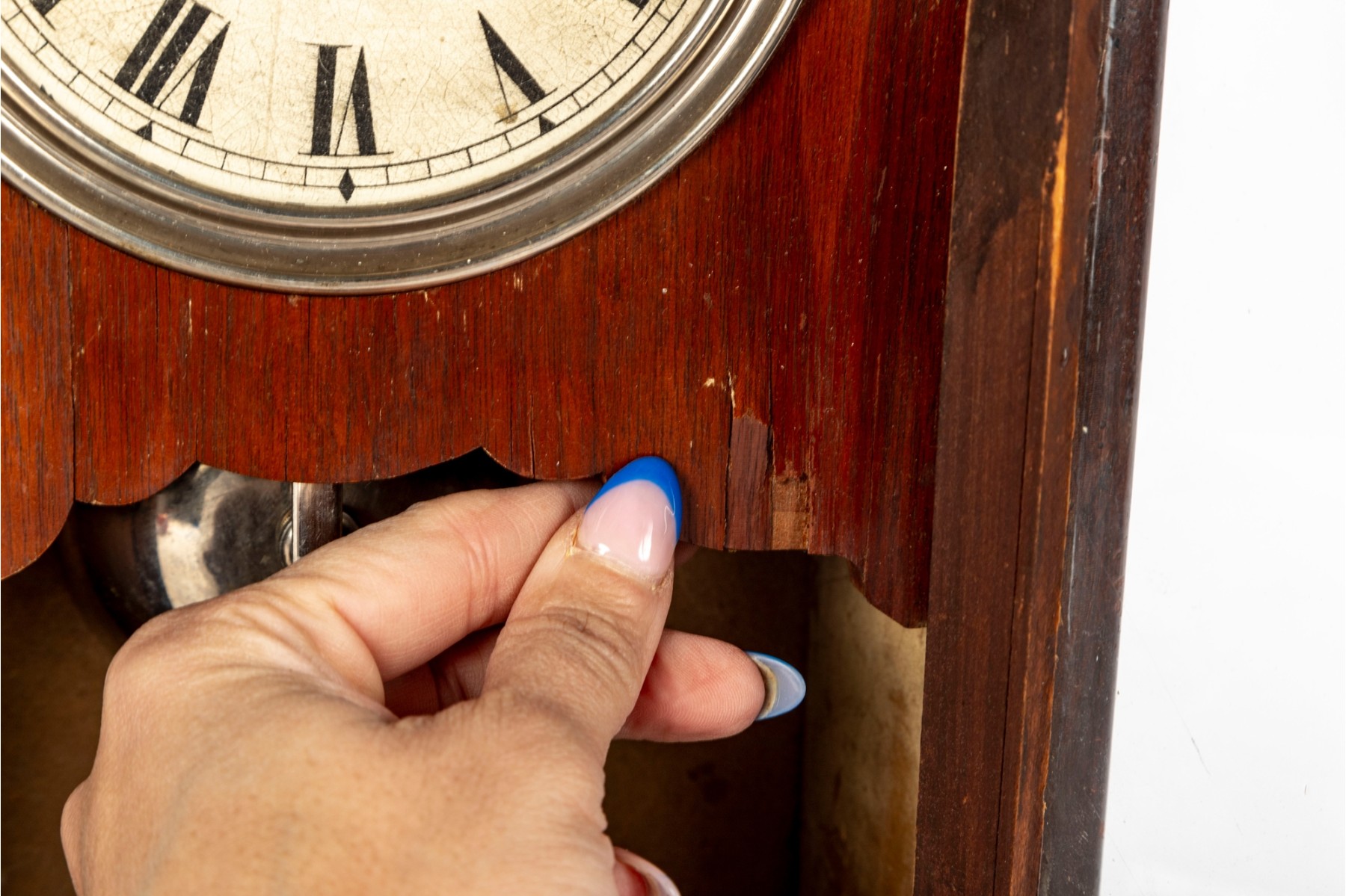 Consistent with age. Losses to wood trim/veneers. Loose wood trim which holds the glass window in place. Unknown if functional.