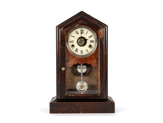 Late 19th century Seth Thomas Pendulum mantle clock with a classically designed wood case and a Roman Numerical clock face -- key included.