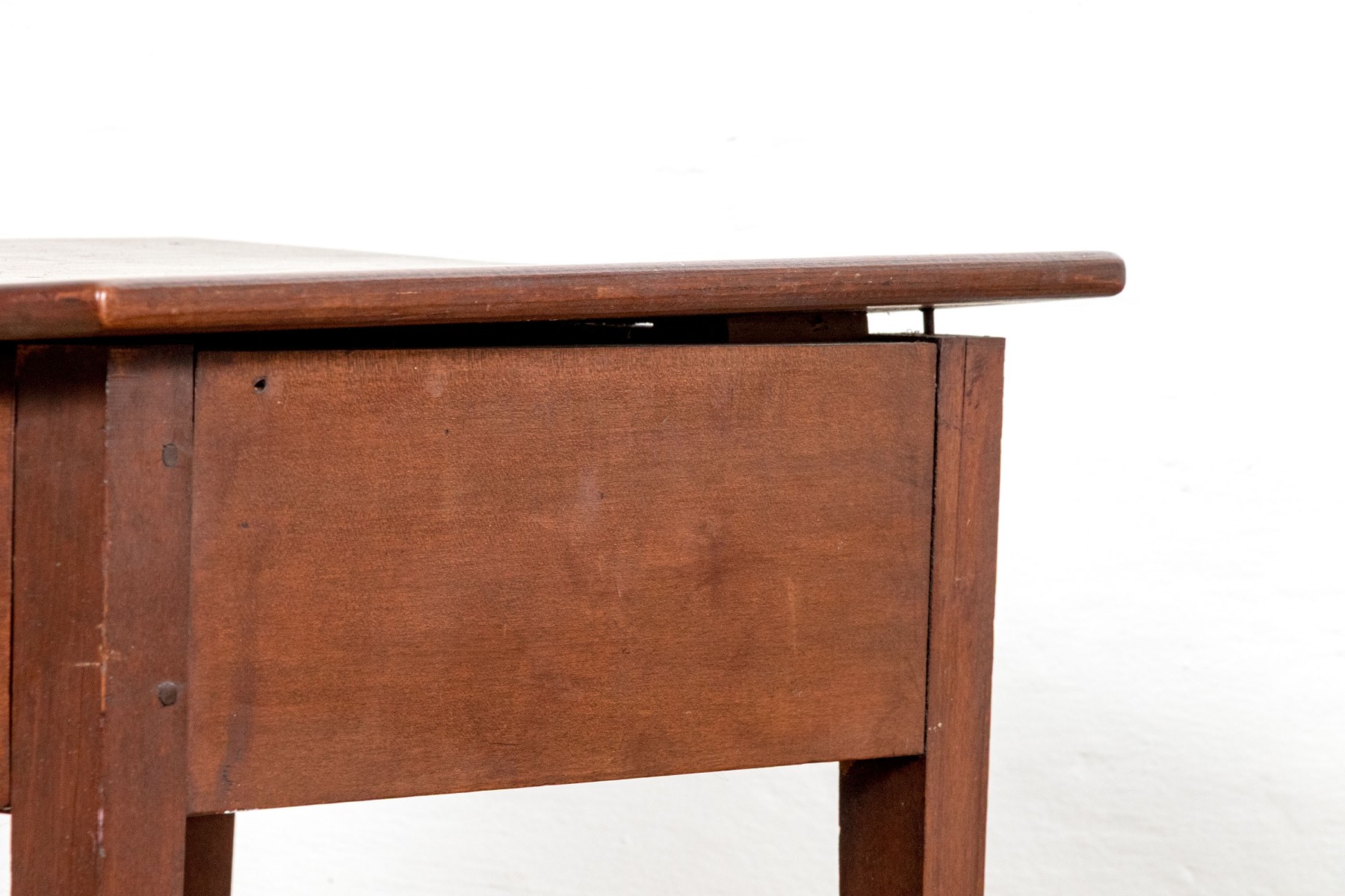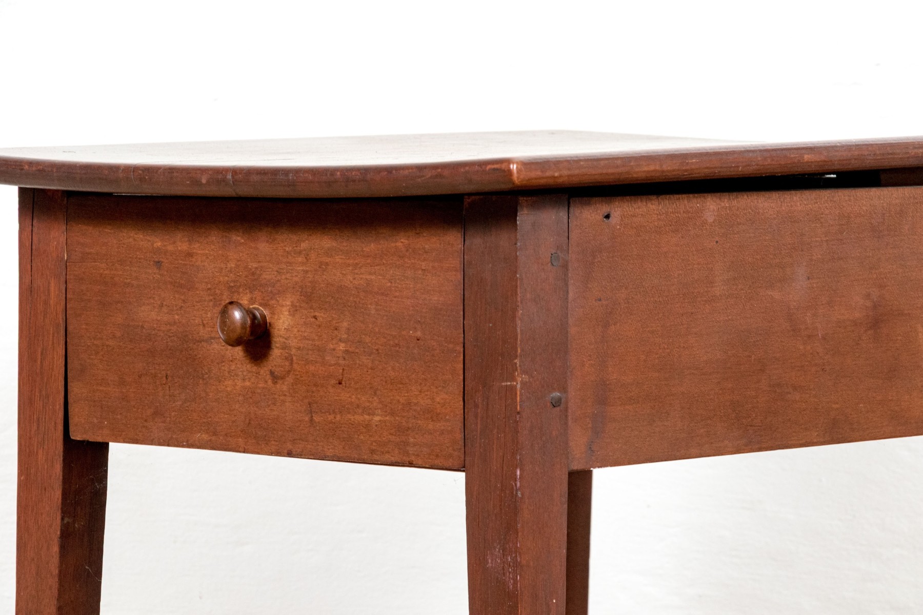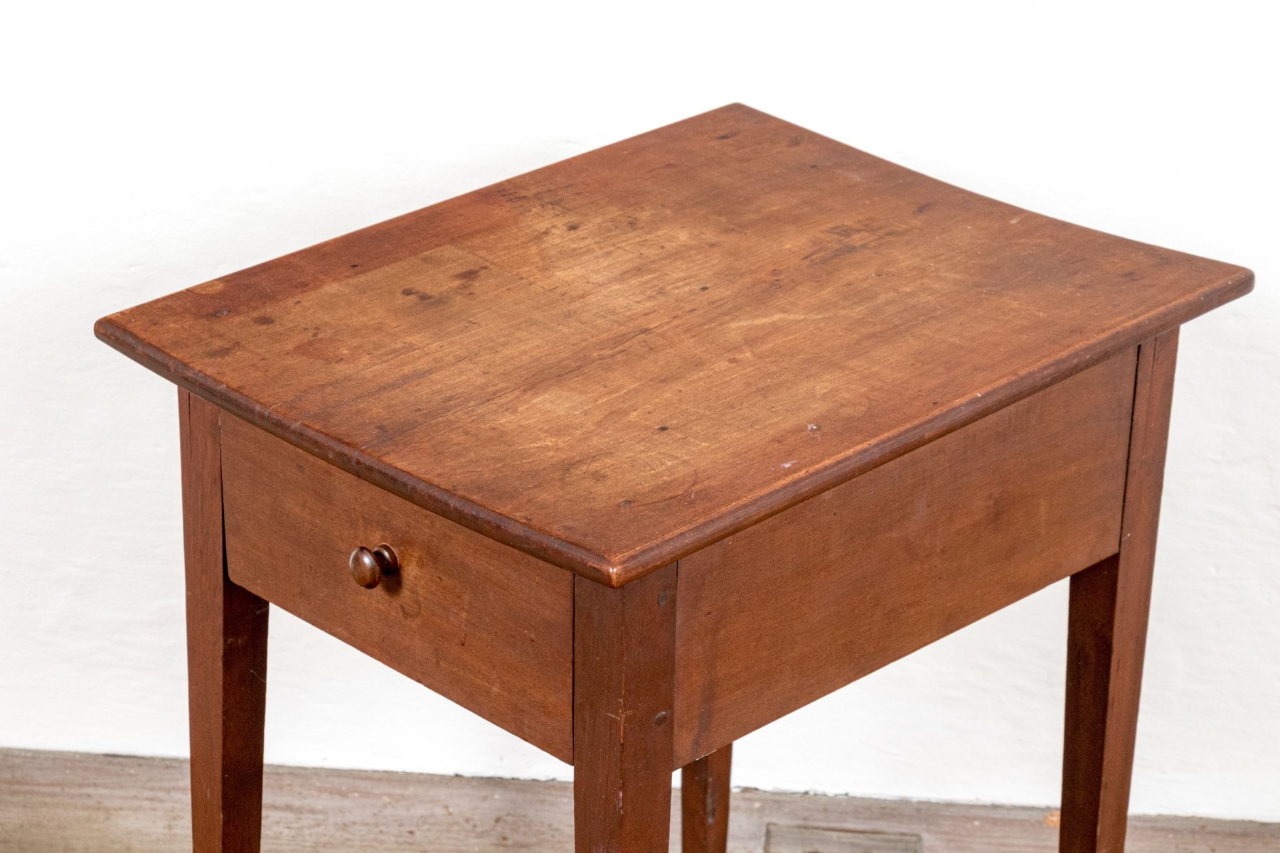 A wonderful antique Shaker style side table crafted in warm medium brown cherry wood, showcasing a rectangular top overhanging a single drawer with a small knob handle raised over sleek straight, tapered legs.