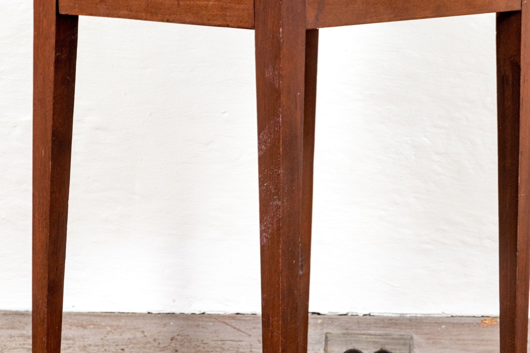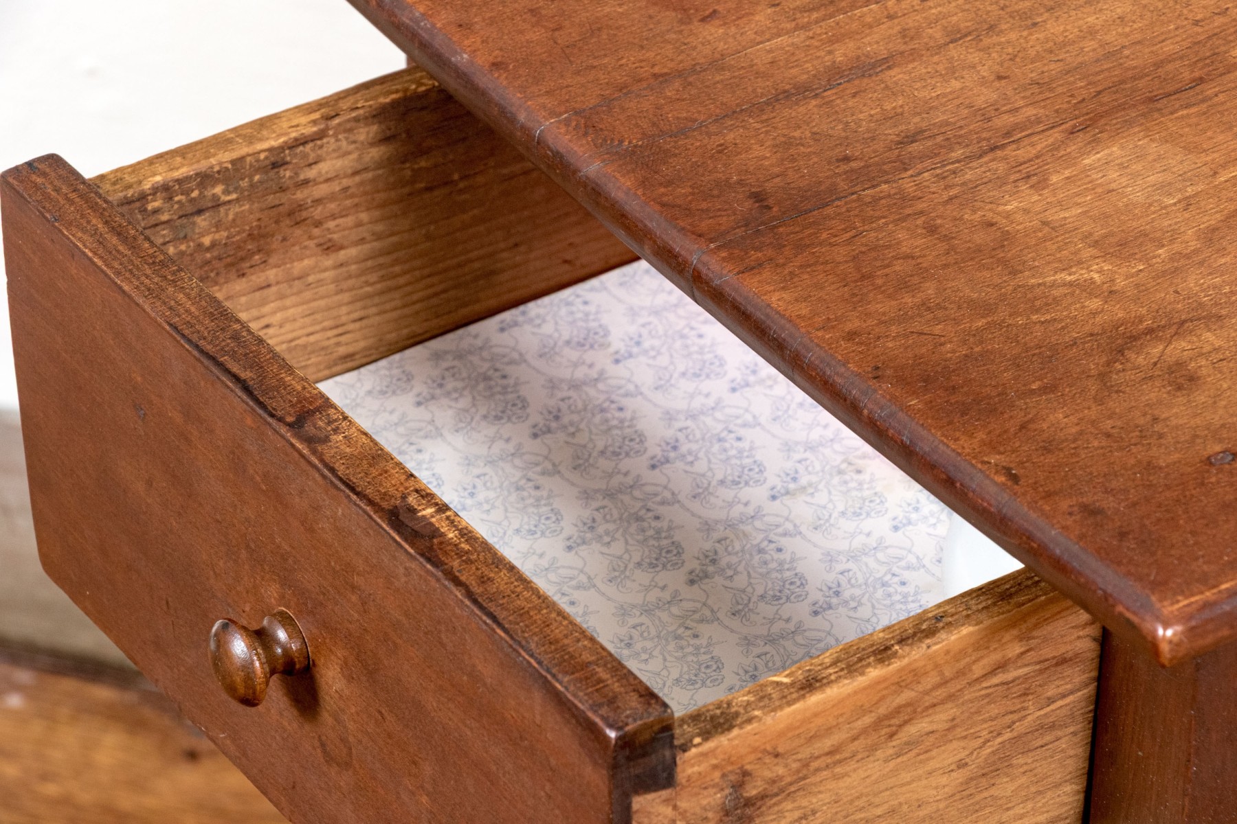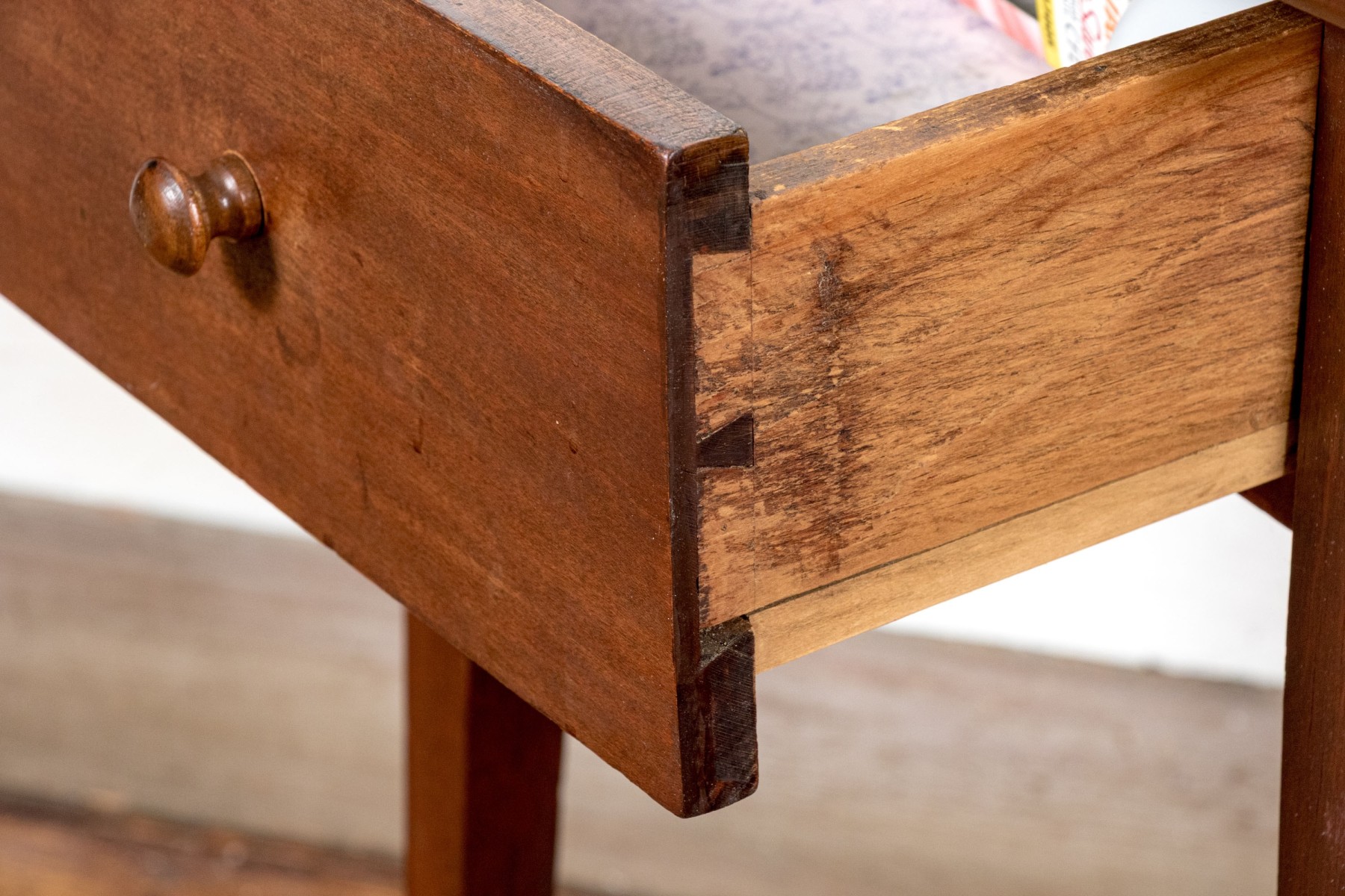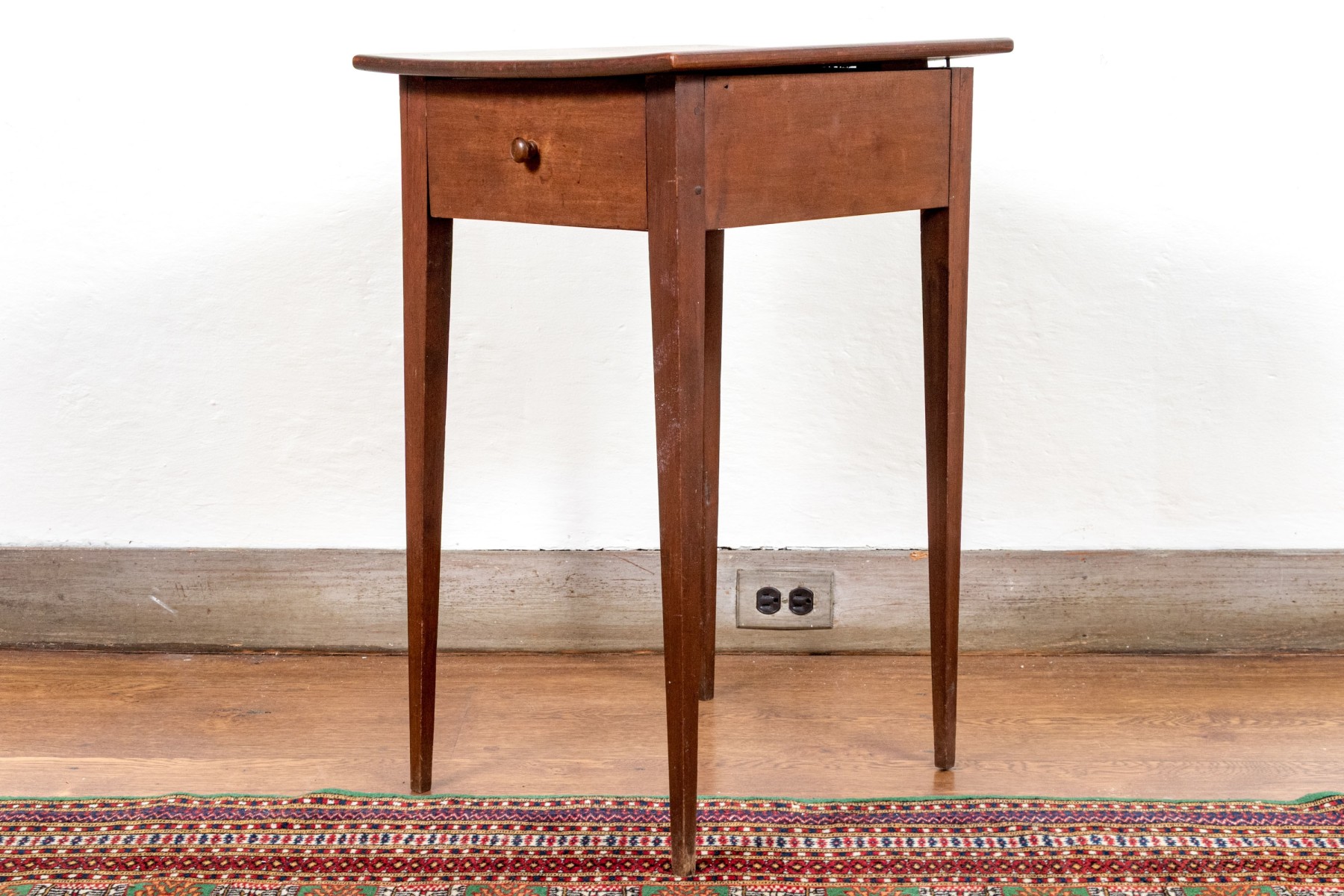 A wonderful antique Shaker style side table crafted in warm medium brown cherry wood, showcasing a rectangular top overhanging a single drawer with a small knob handle raised over sleek straight, tapered legs.