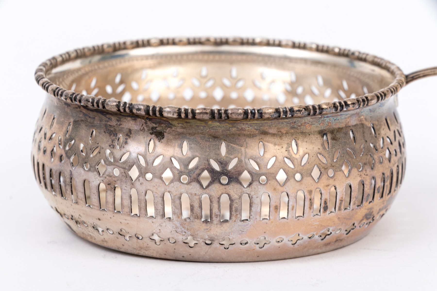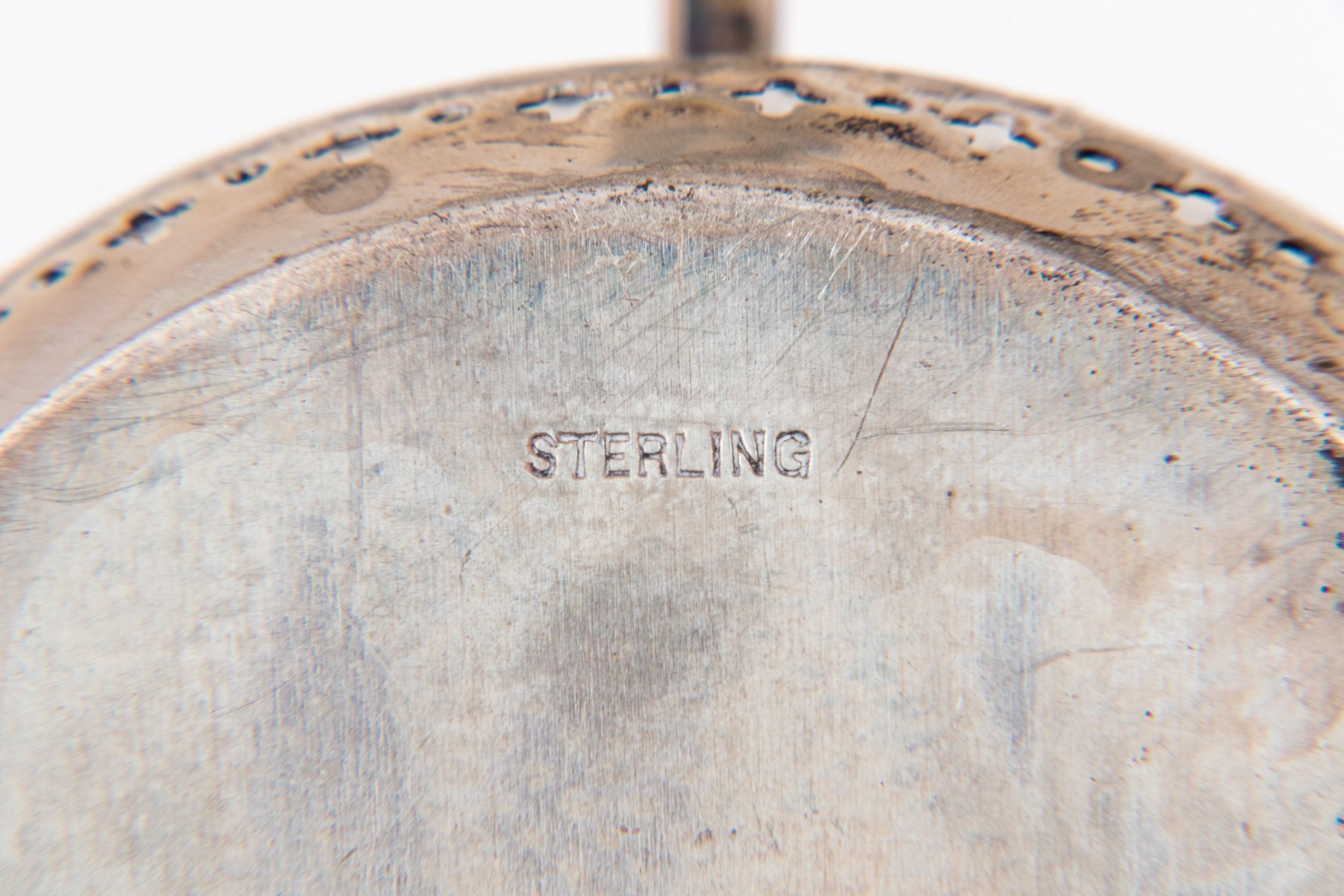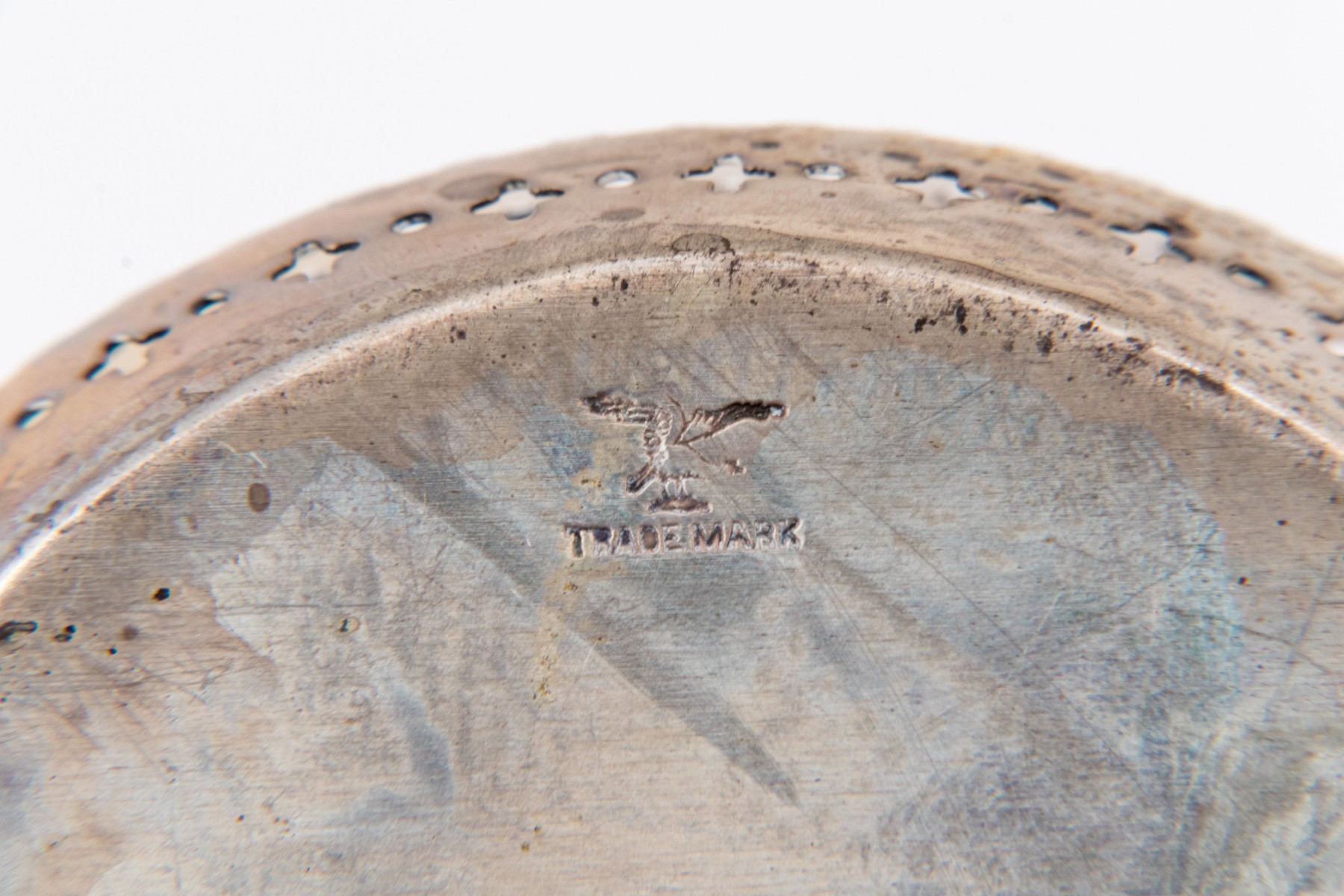 Marked with their trademark of an eagle with spread wings. A fine sterling cup with beaded edge and pierced decorative bands around the sides. The long pierced and scrolled handle with a shield motif. Lacking the porcelain insert for serving.