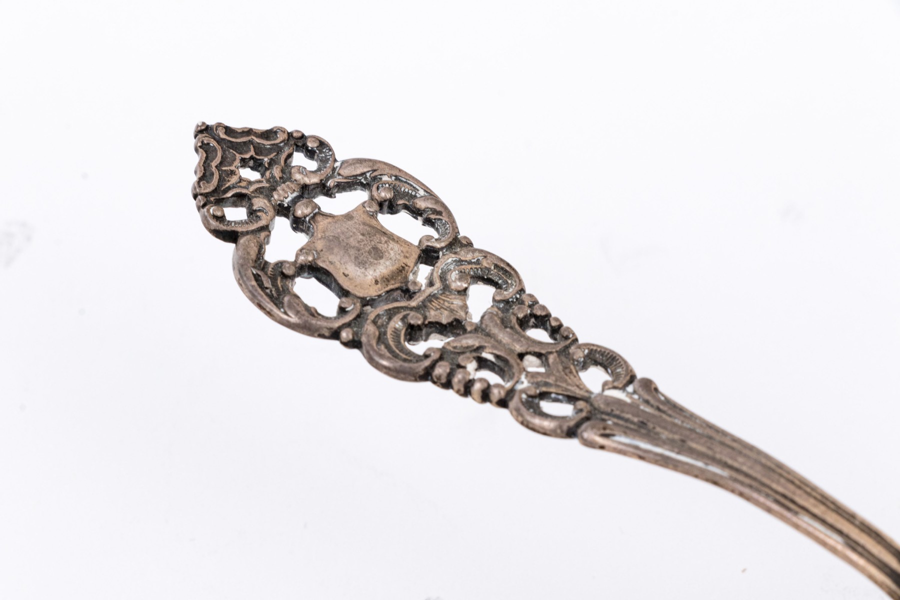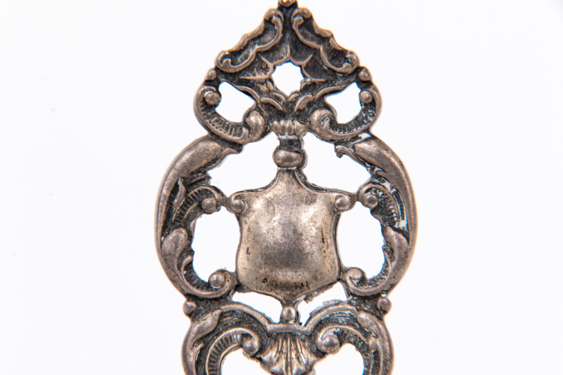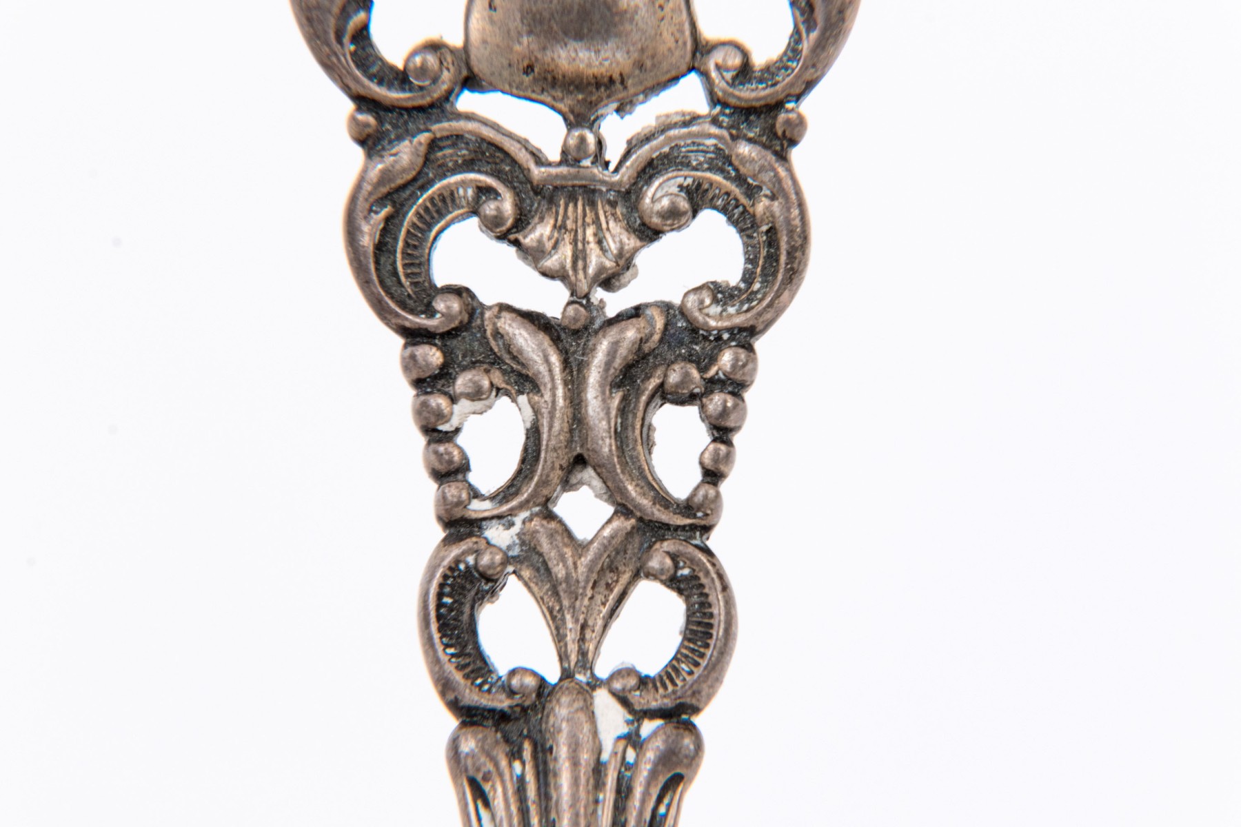 Marked with their trademark of an eagle with spread wings. A fine sterling cup with beaded edge and pierced decorative bands around the sides. The long pierced and scrolled handle with a shield motif. Lacking the porcelain insert for serving.