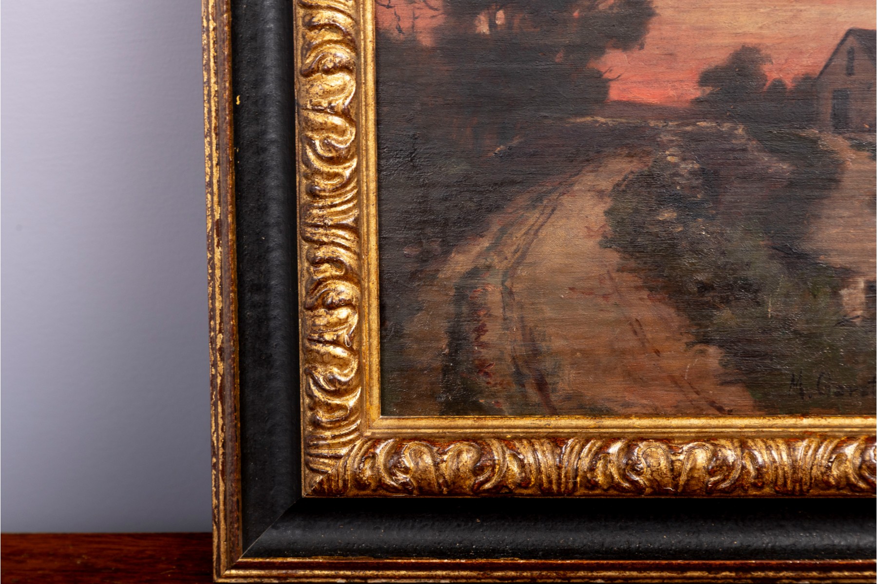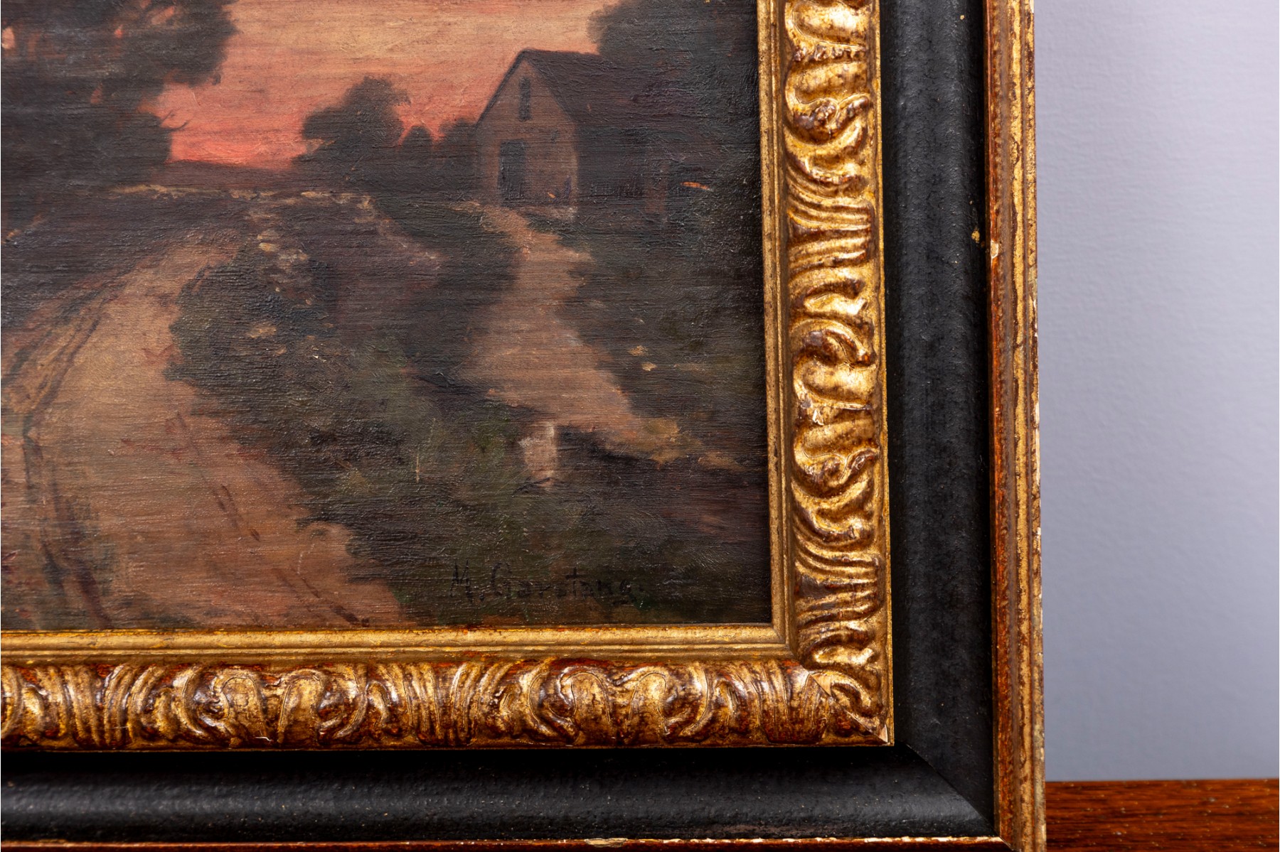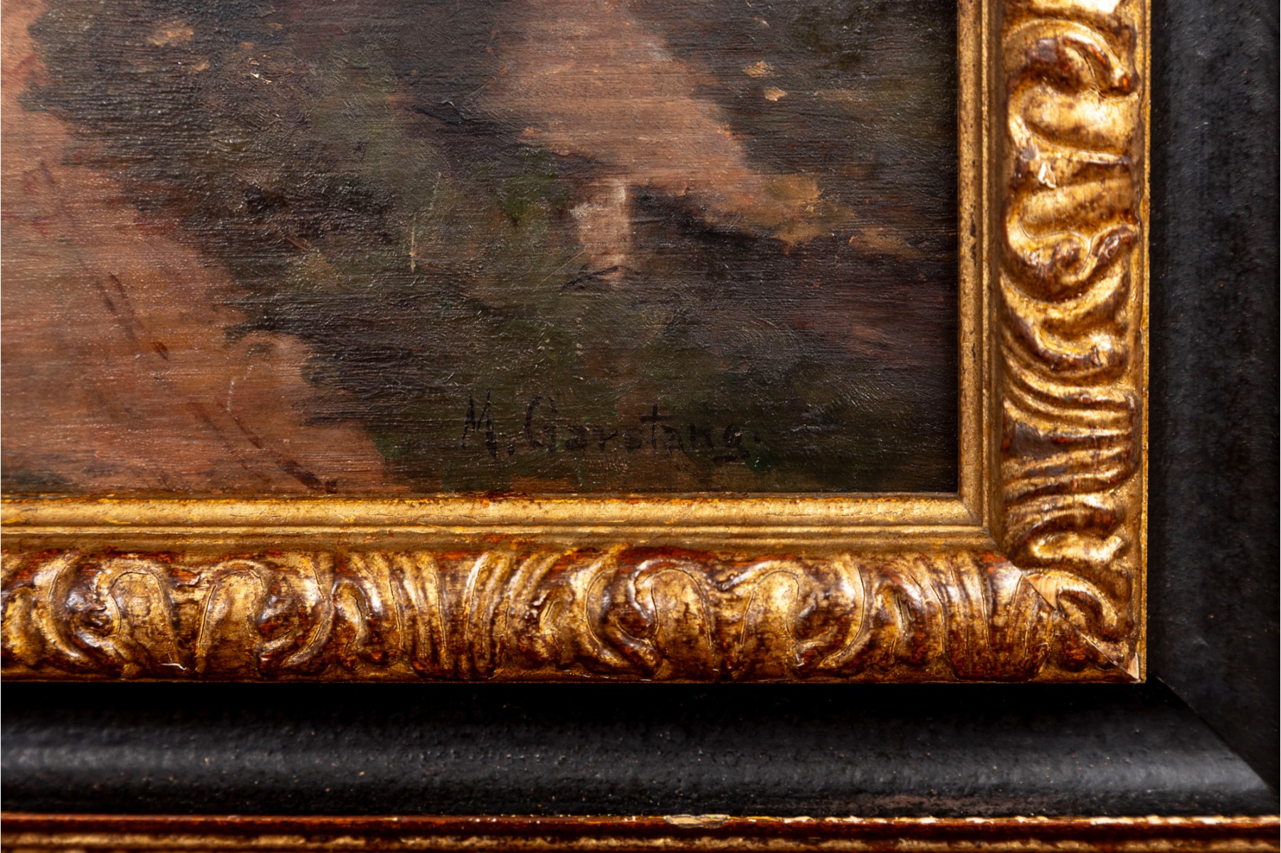 Antique, signed "M. Garstang" oil on wood board rural landscape painting displayed openly in an ornate black/gold-tone wood frame.