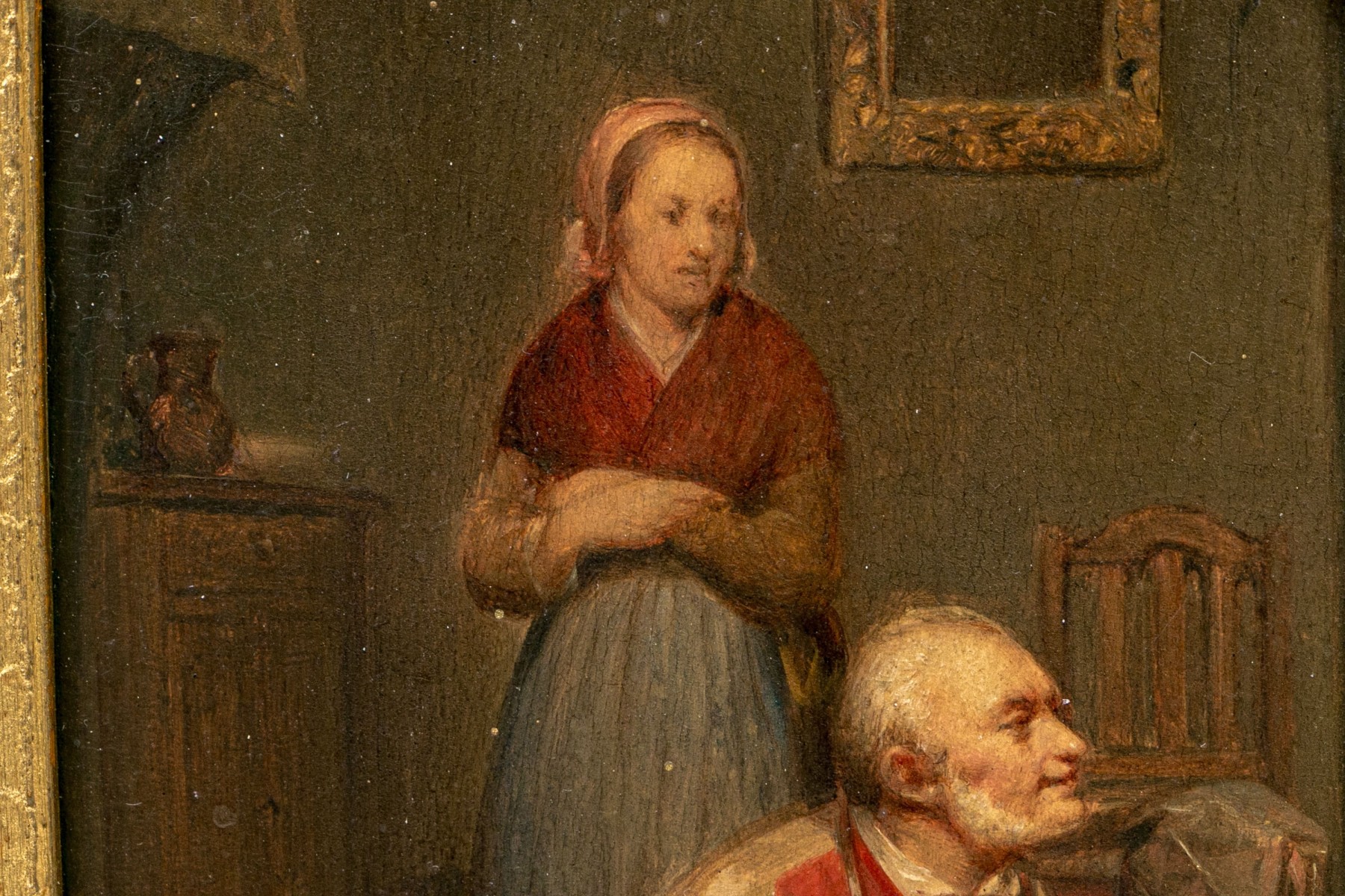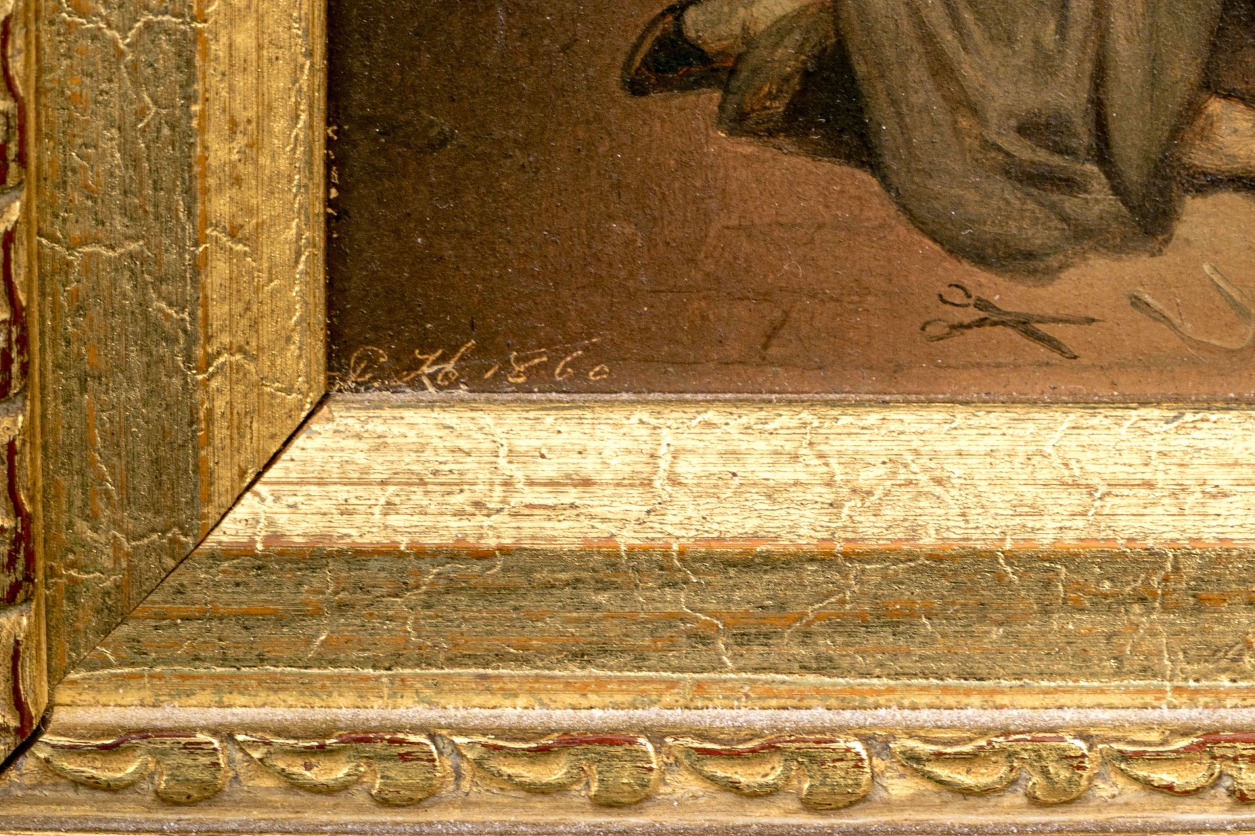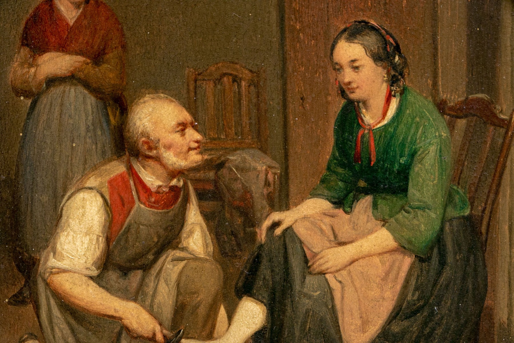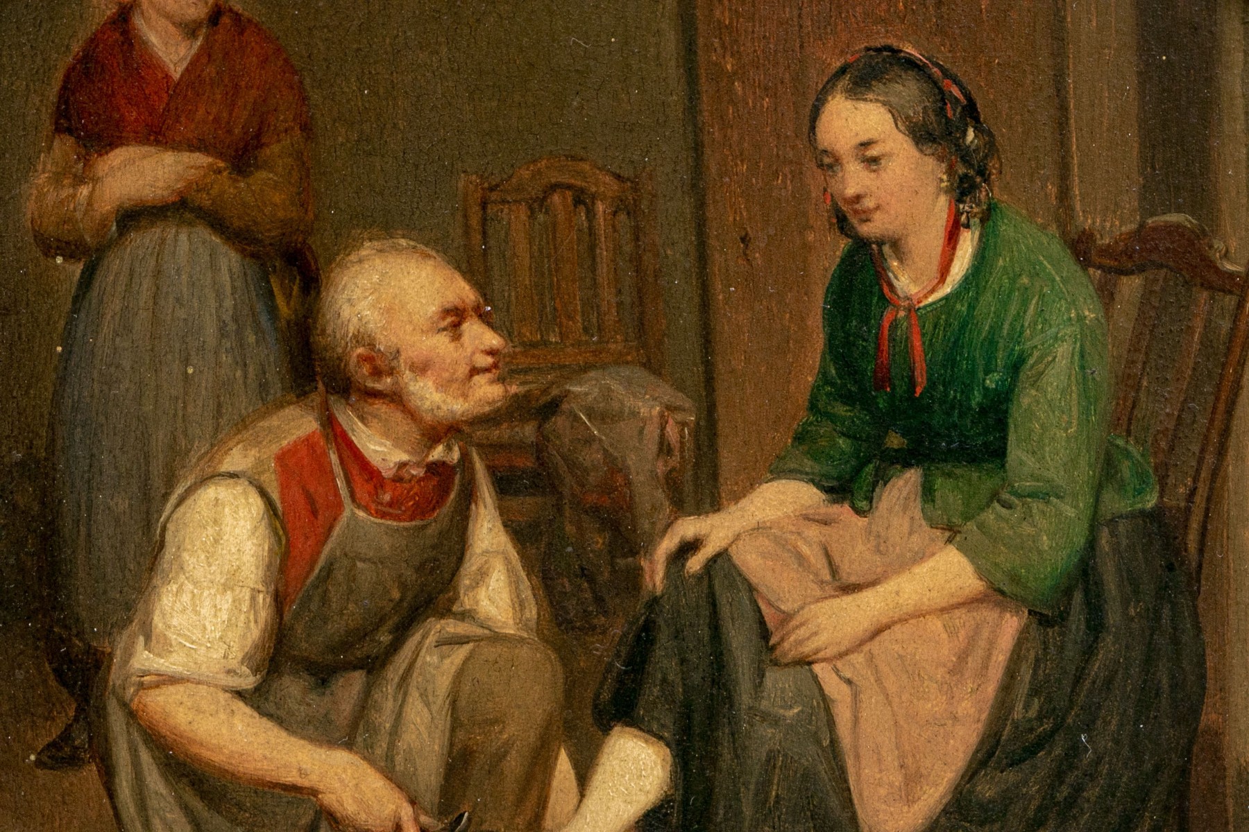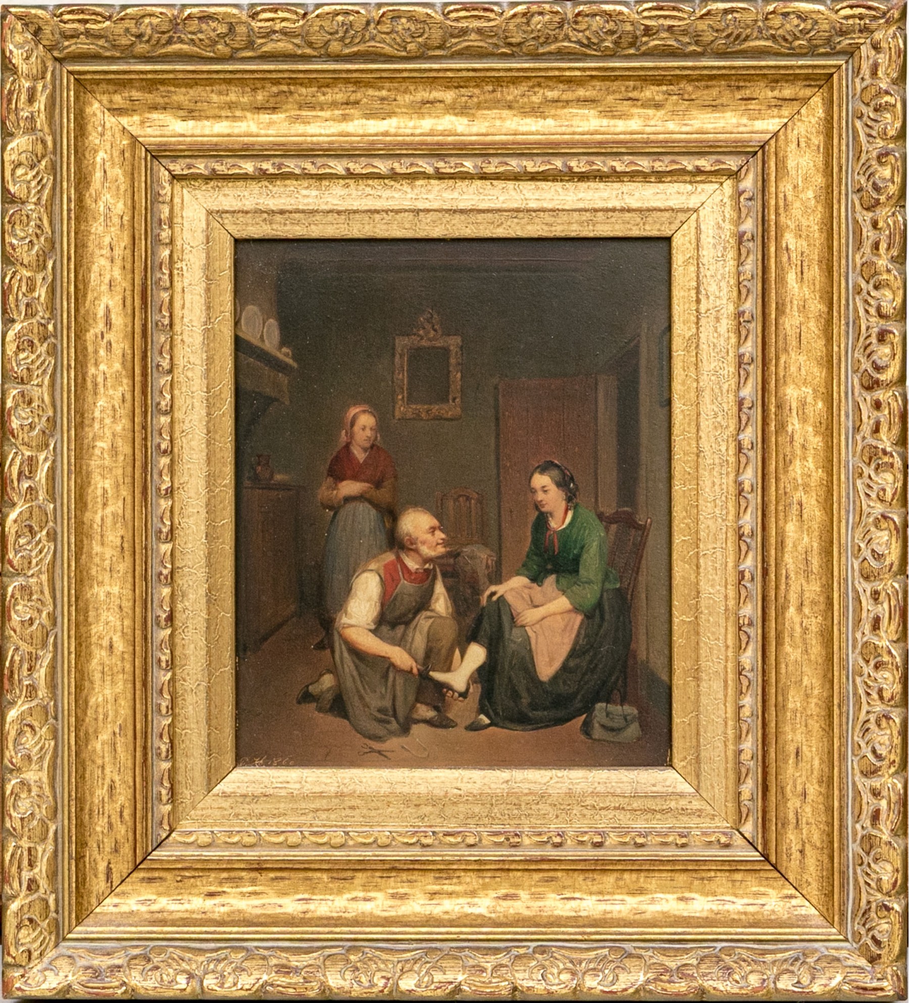 A wonderful antique oil painting on board depicting a woman in green seated while having her foot measured by a cobbler in red with a gray apron. Another woman in red and blue looks on in the background, standing in a kitchen interior with an ornate frame on the wall and plates lined alone a cupboard. Signed and dated 1860 lower left.