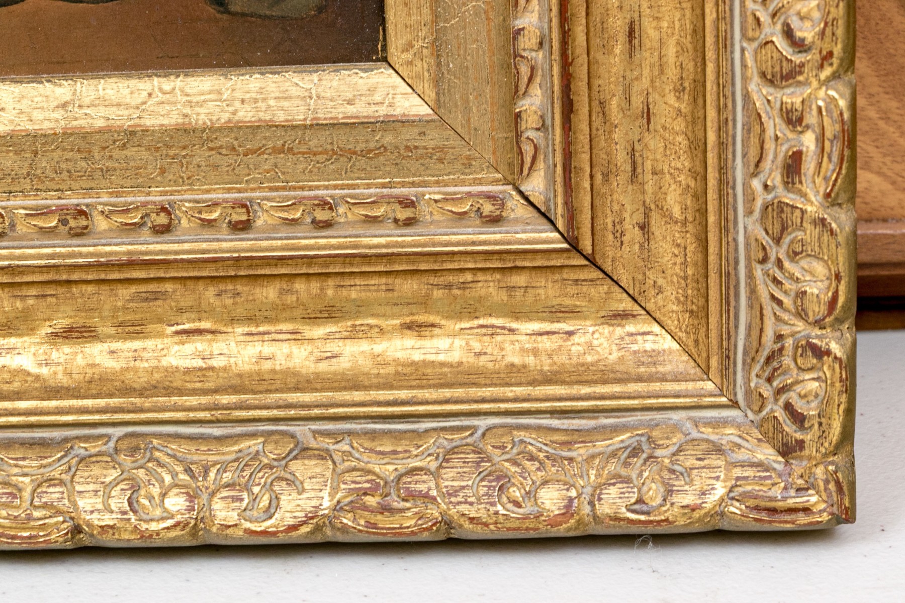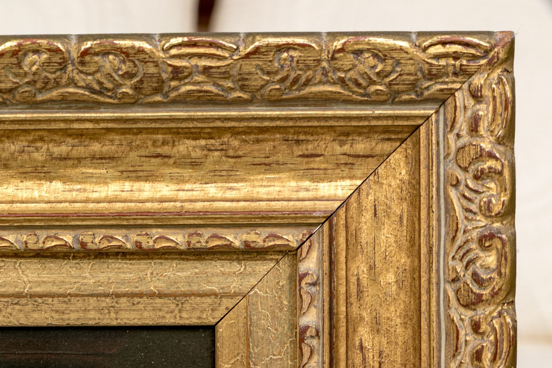 Displayed in an ornate gilt frame with banded borders and an exterior trim of elegant relief.