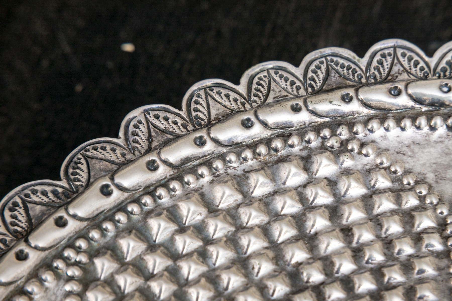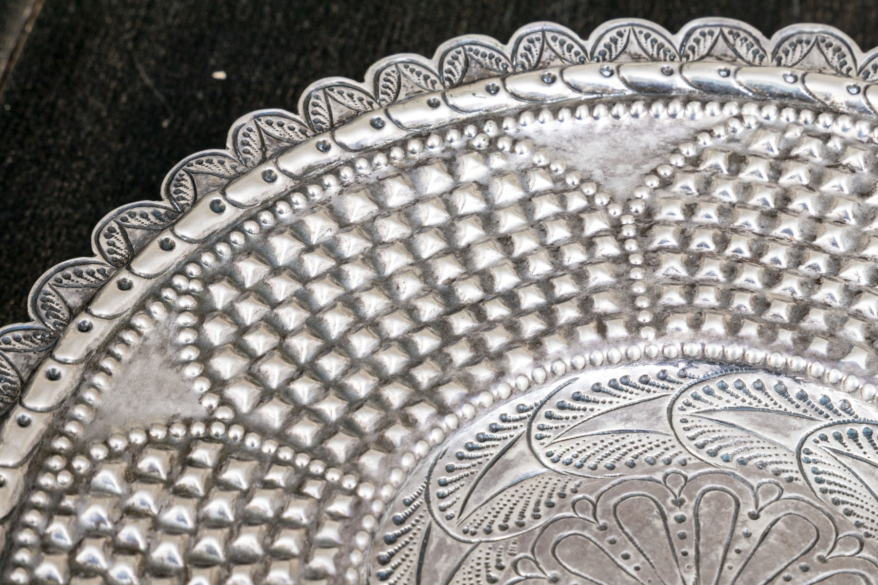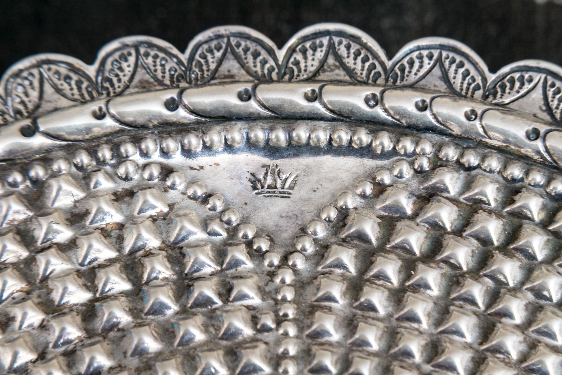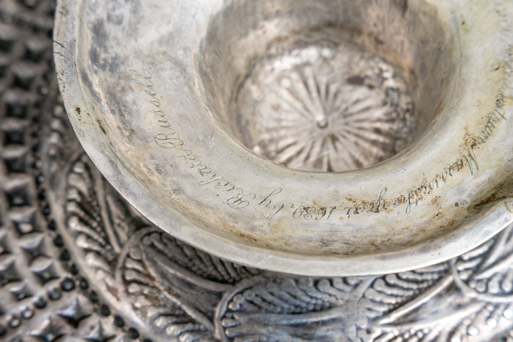 The tazza is raised on a on a foot with a wonderfully repousse and etched floral motif with scalloped trim.