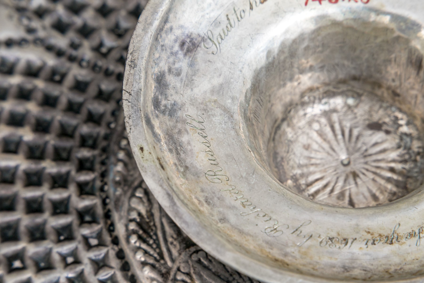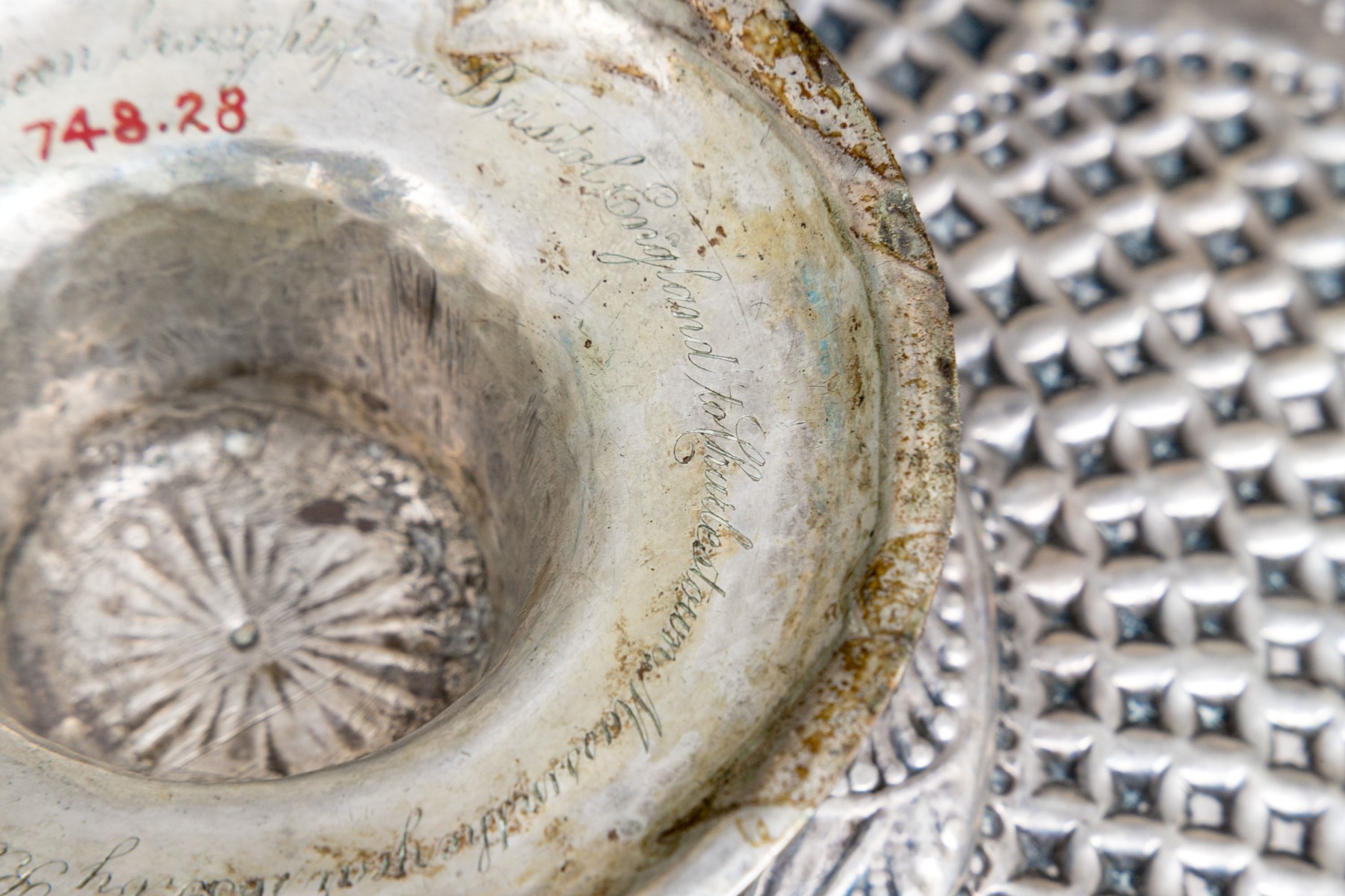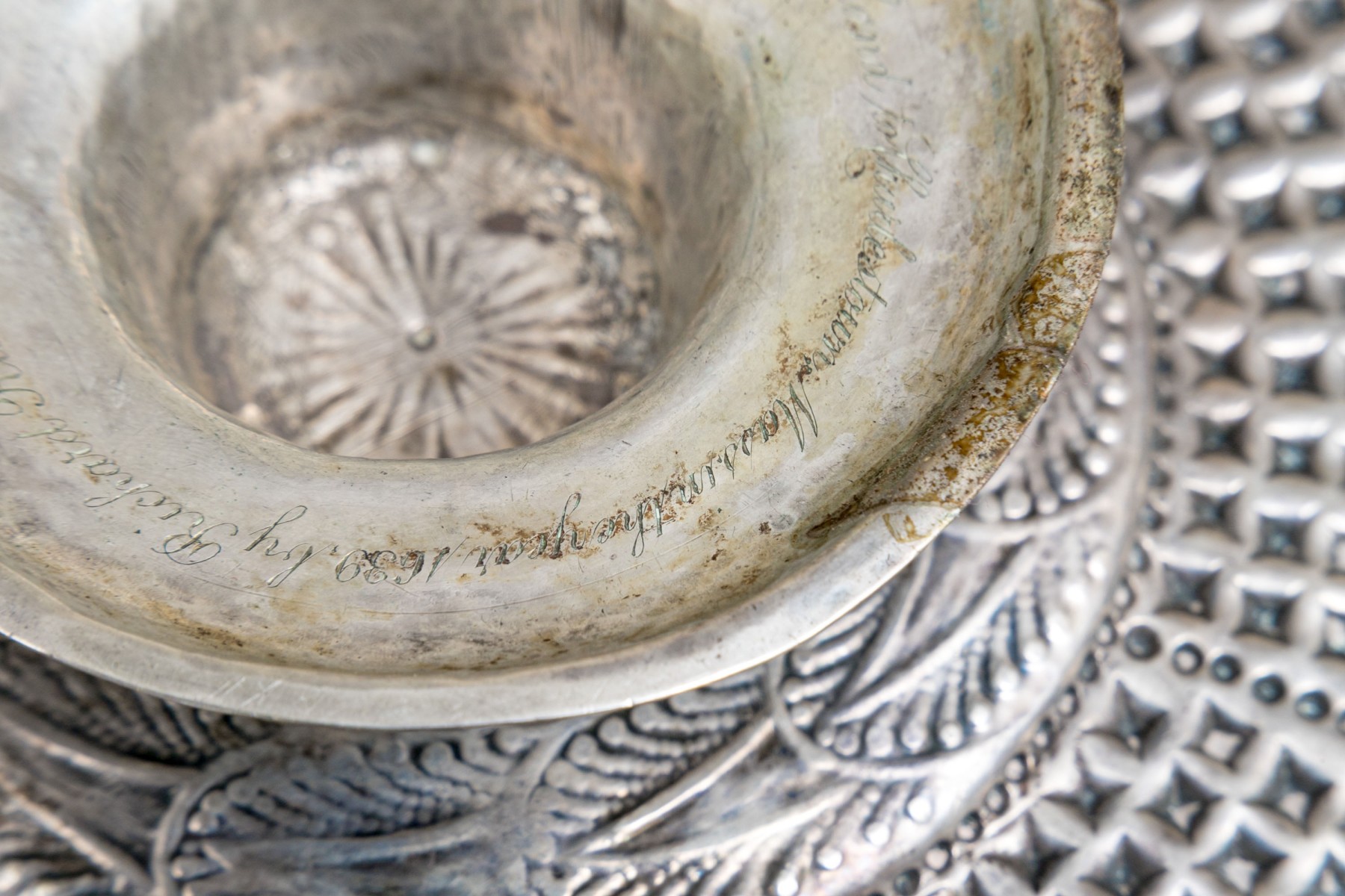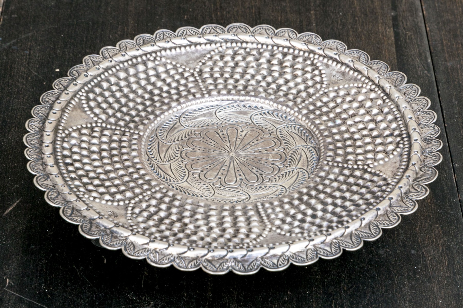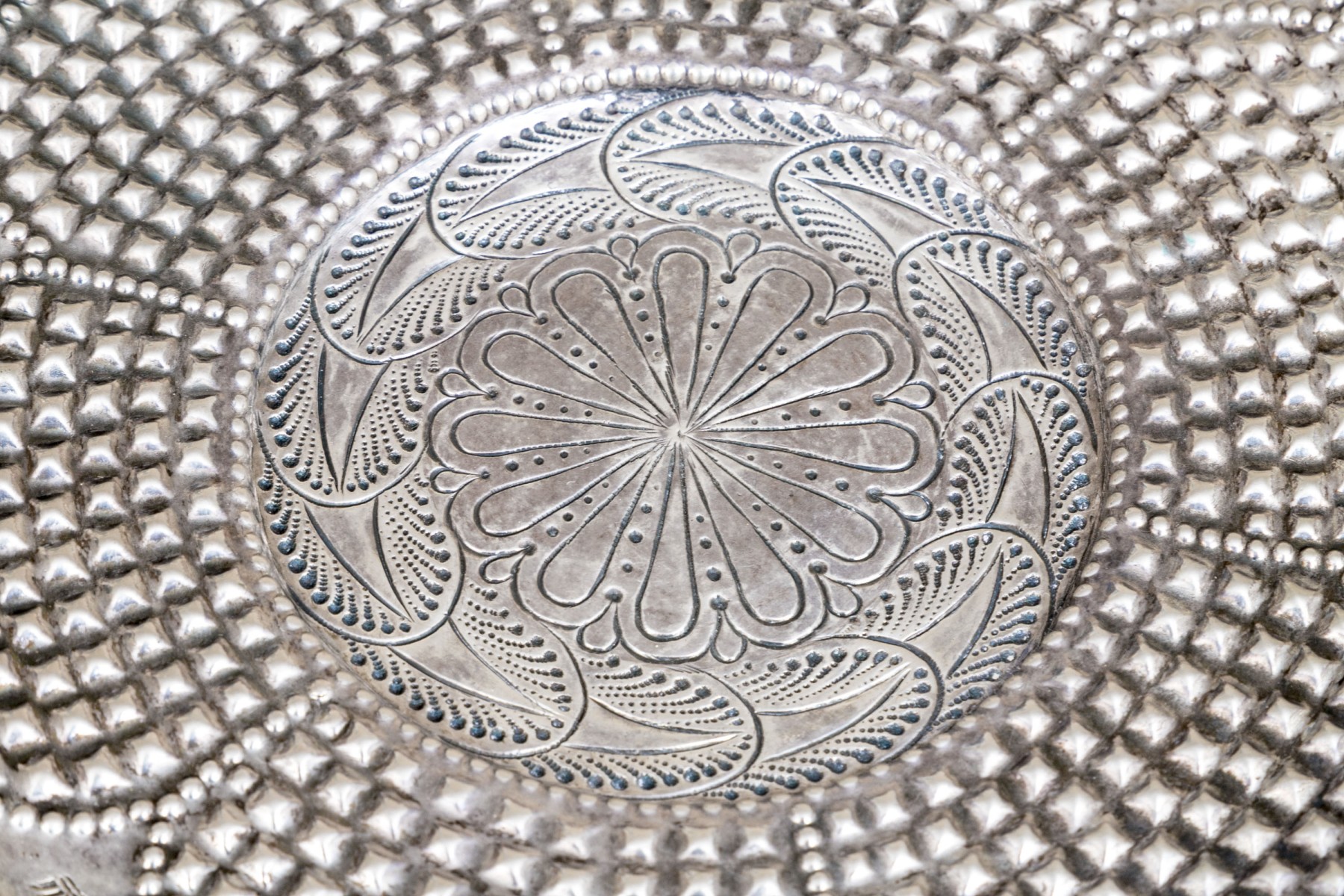 The tazza is raised on a on a foot with a wonderfully repousse and etched floral motif with scalloped trim.