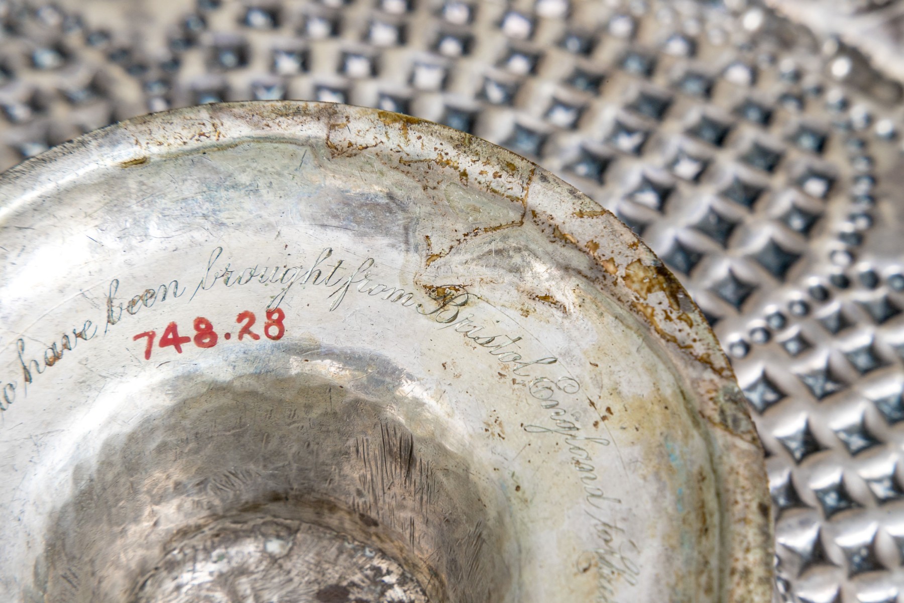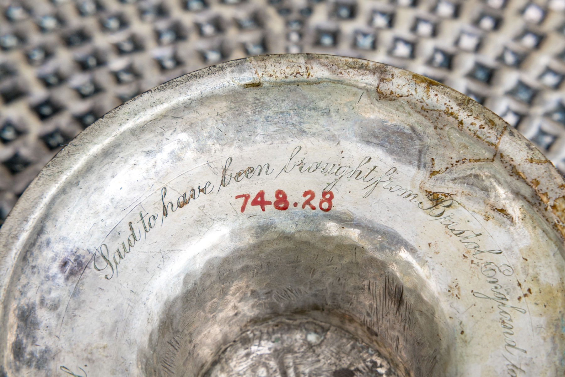 Engraved "Said to have been brought from Bristol, England to Charlestown, Mass. in the year 1639 by Richard Russel" underfoot.