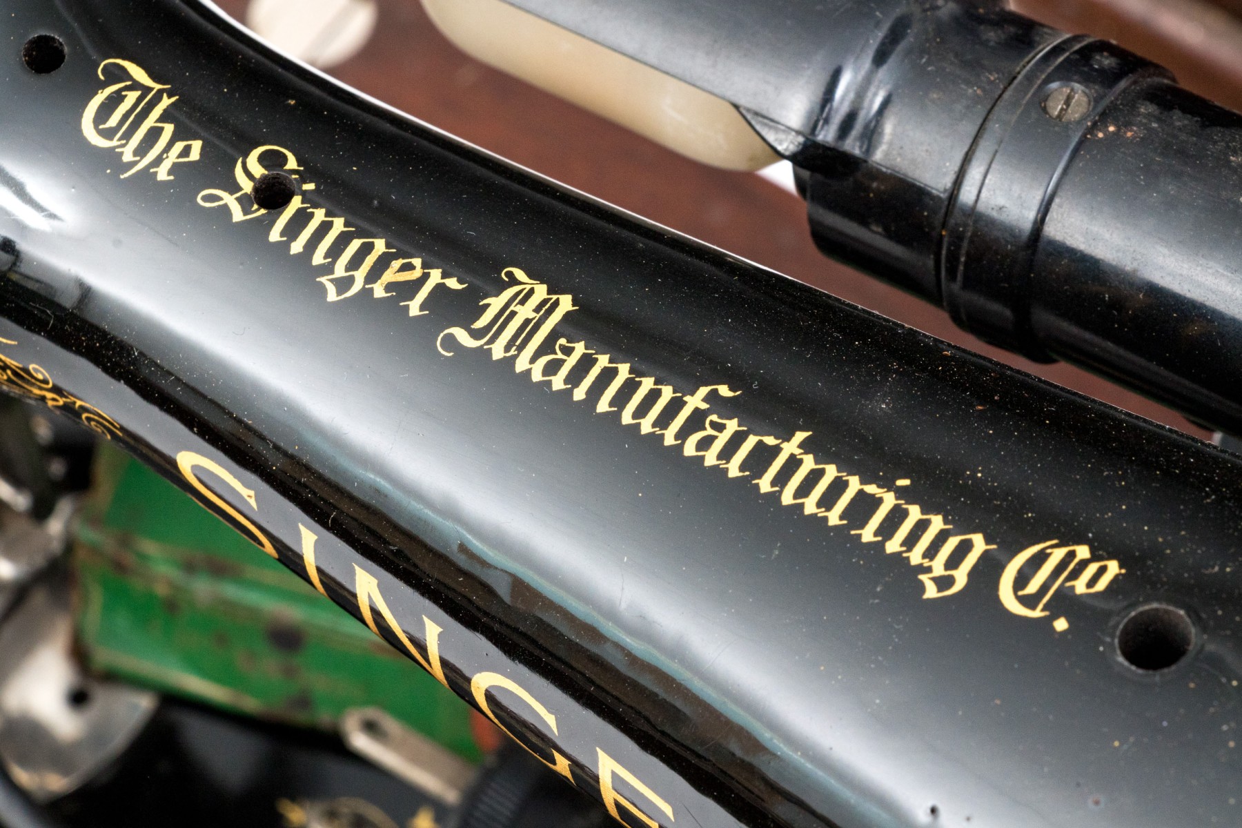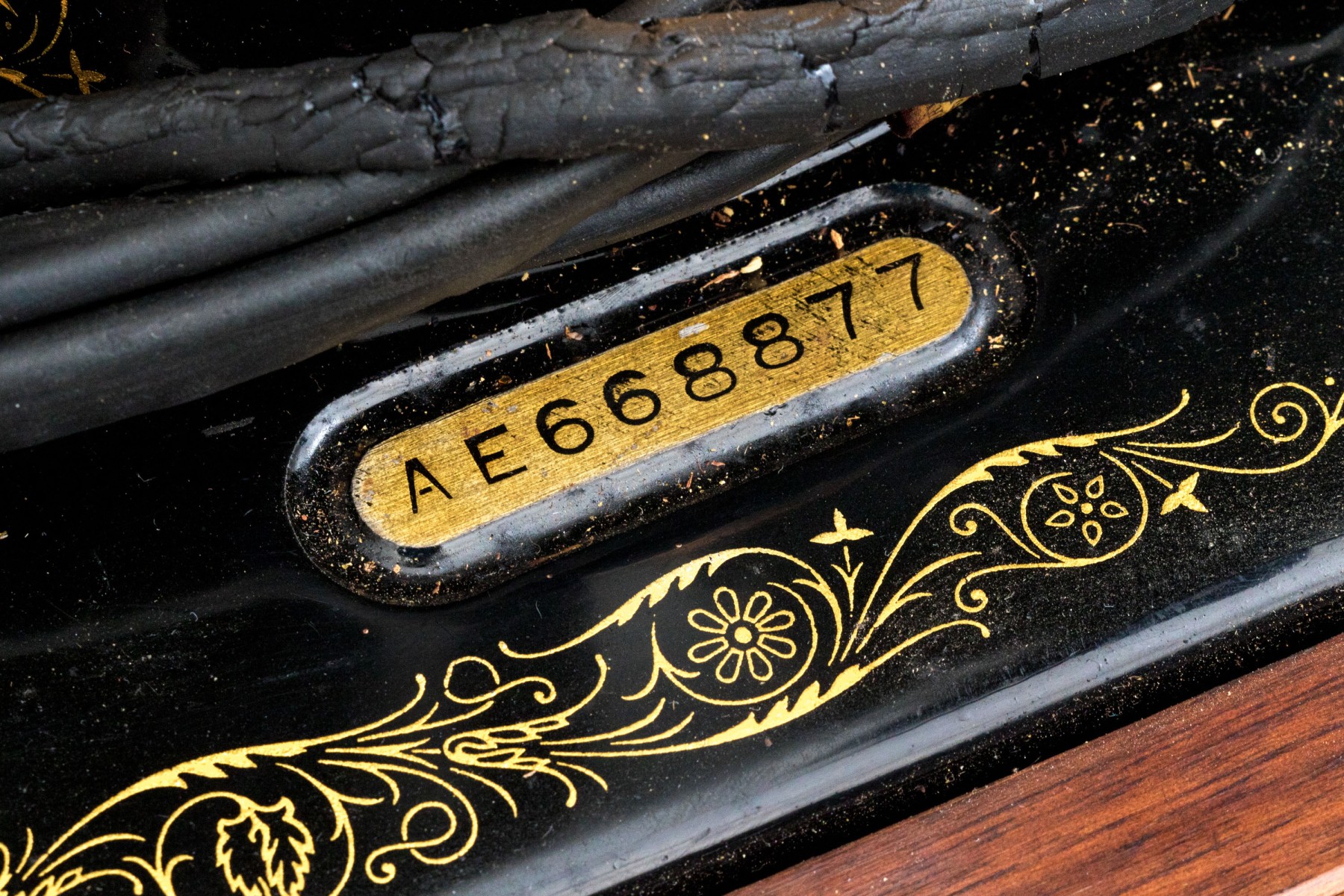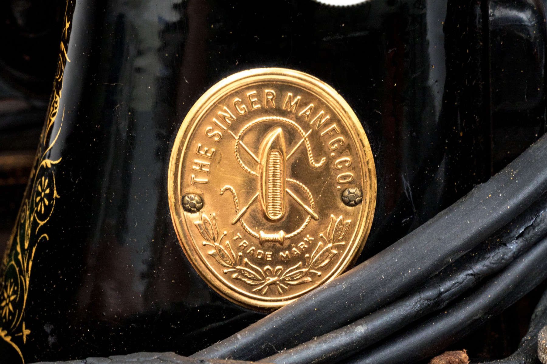 Black enamel painted with gold stenciled decoration. Overall in beautiful condition, now electrified. the head spins freely, great paint, just needs a cleaning. The electrician chops is dry with damage and should not be used.