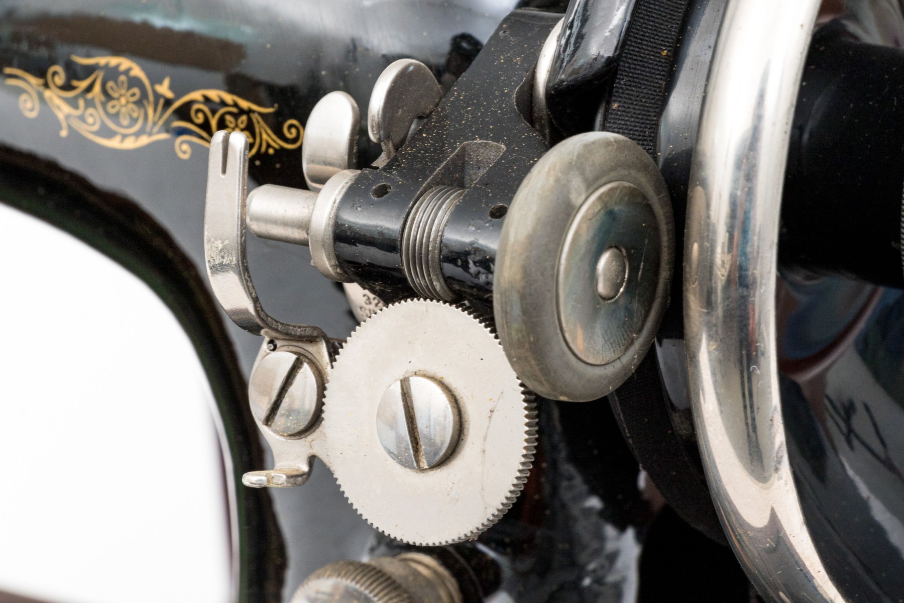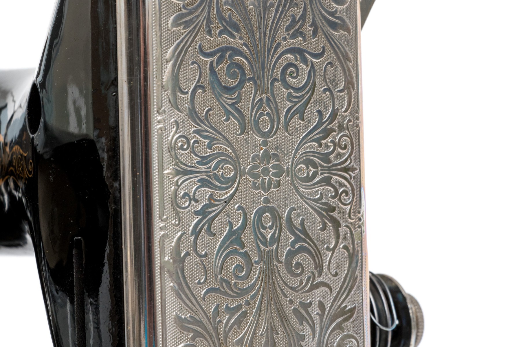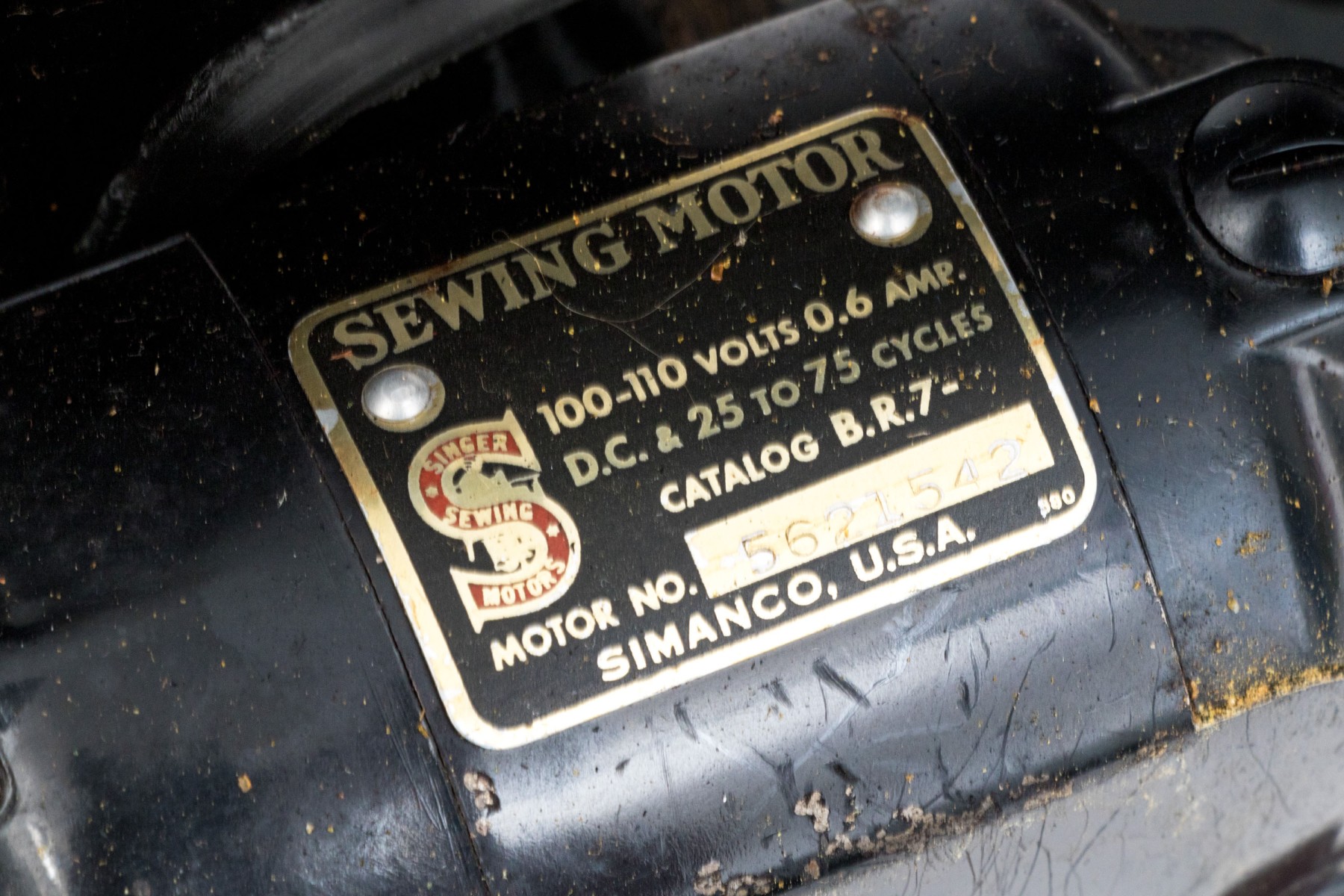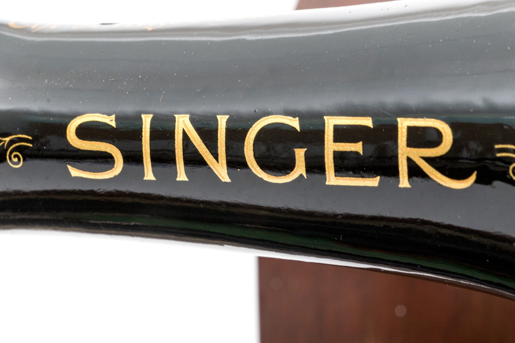 Black enamel painted with gold stenciled decoration. Overall in beautiful condition, now electrified. the head spins freely, great paint, just needs a cleaning. The electrician chops is dry with damage and should not be used.