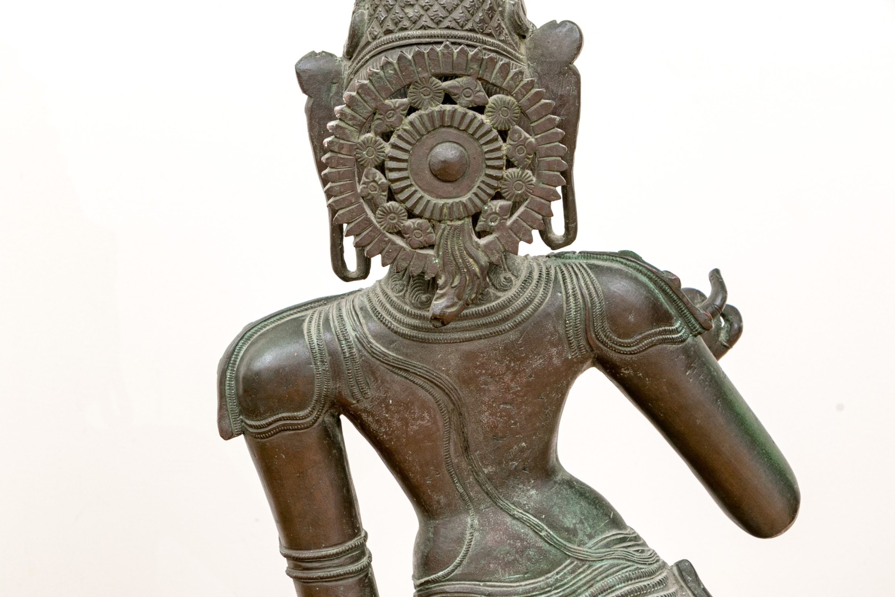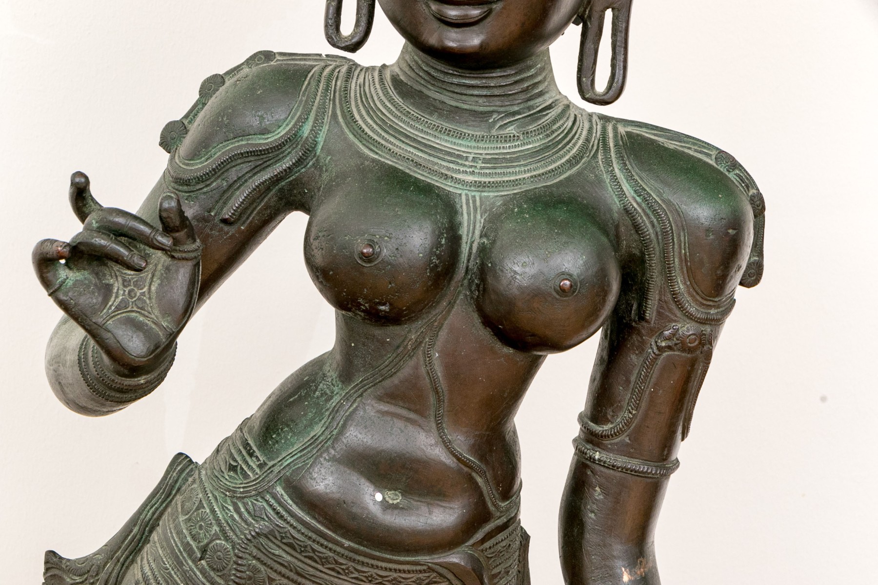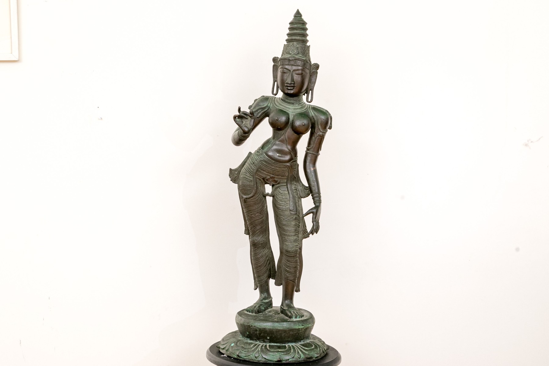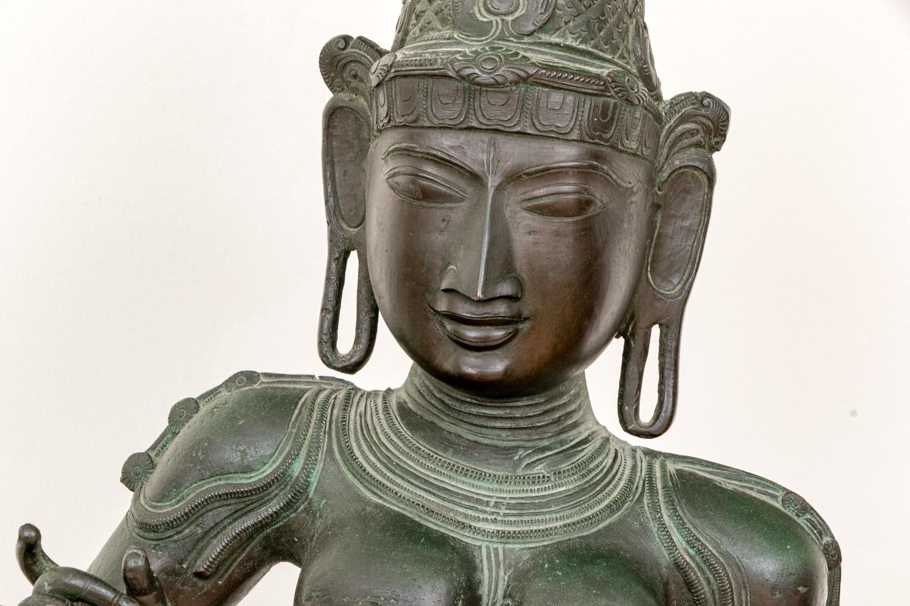 The bronze figure of Parvatti has an oval face, with striking almond form eyes and an angular nose.