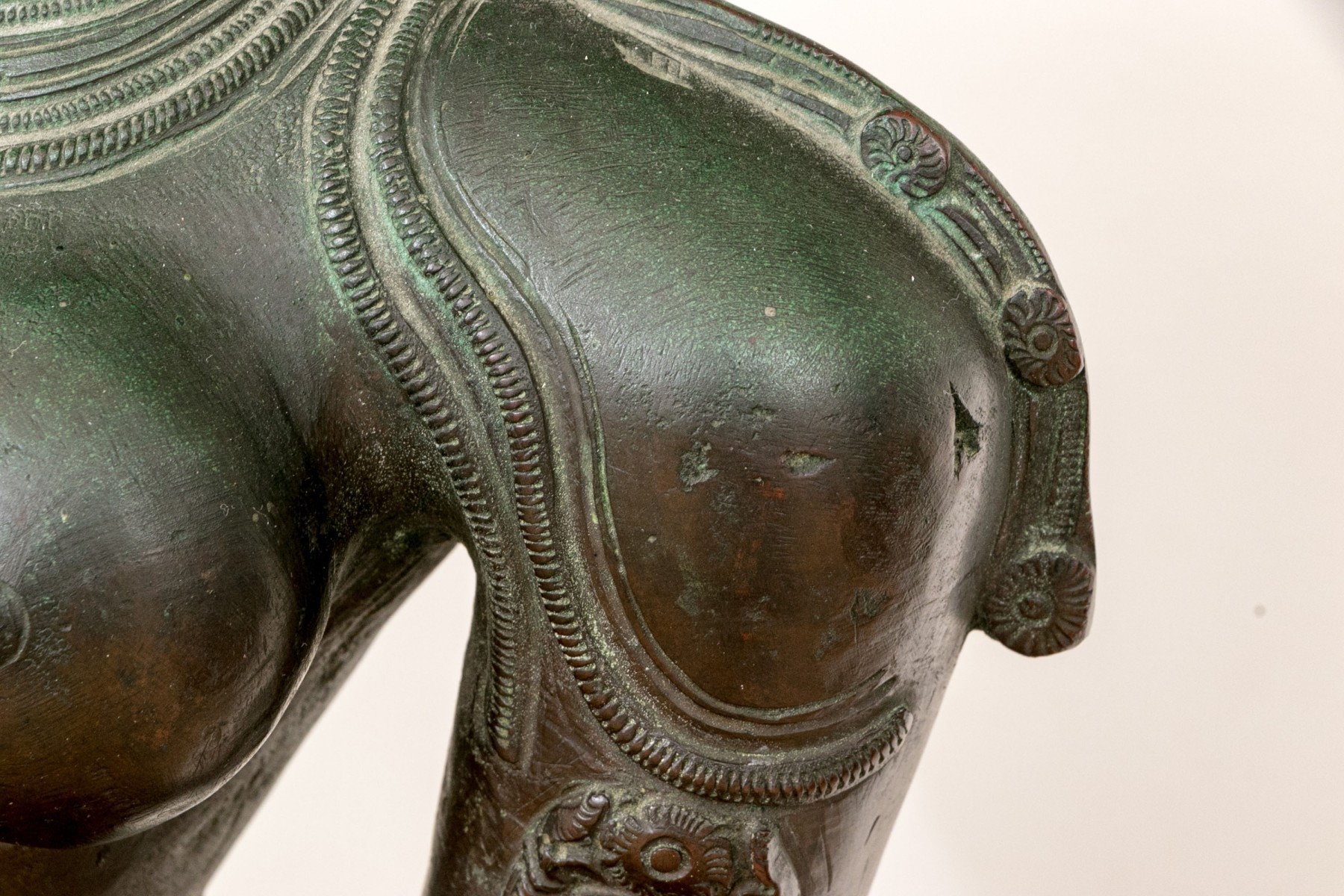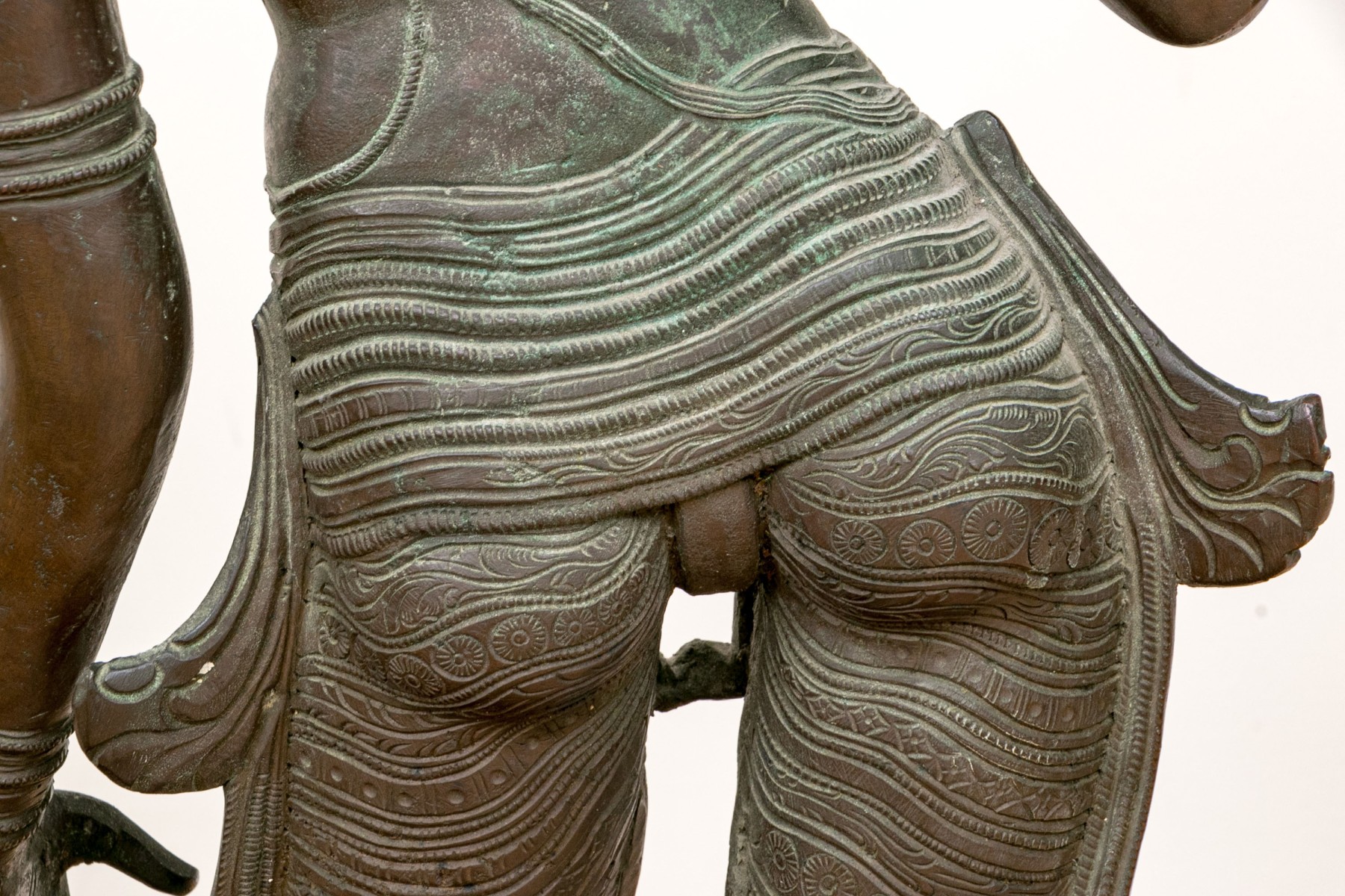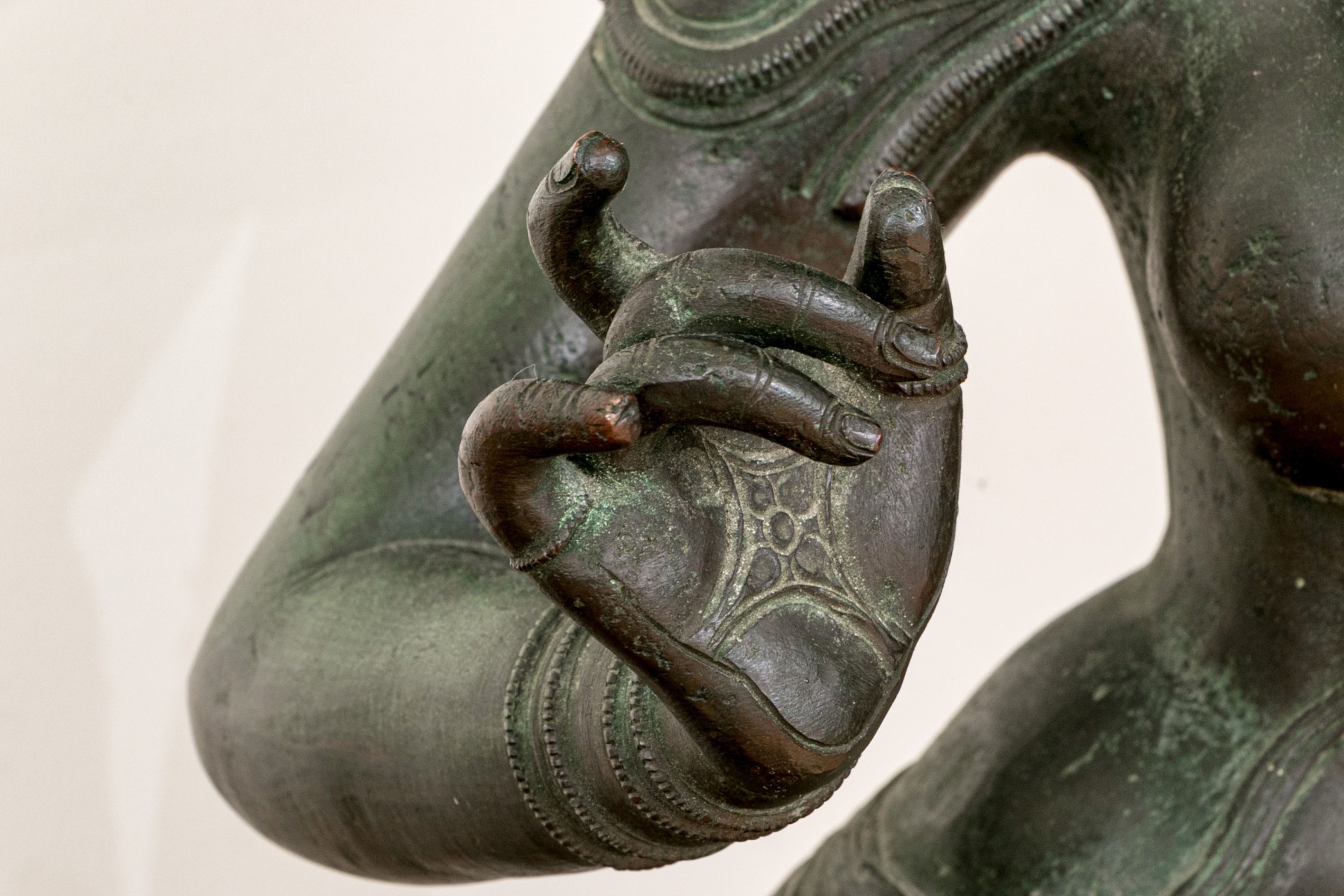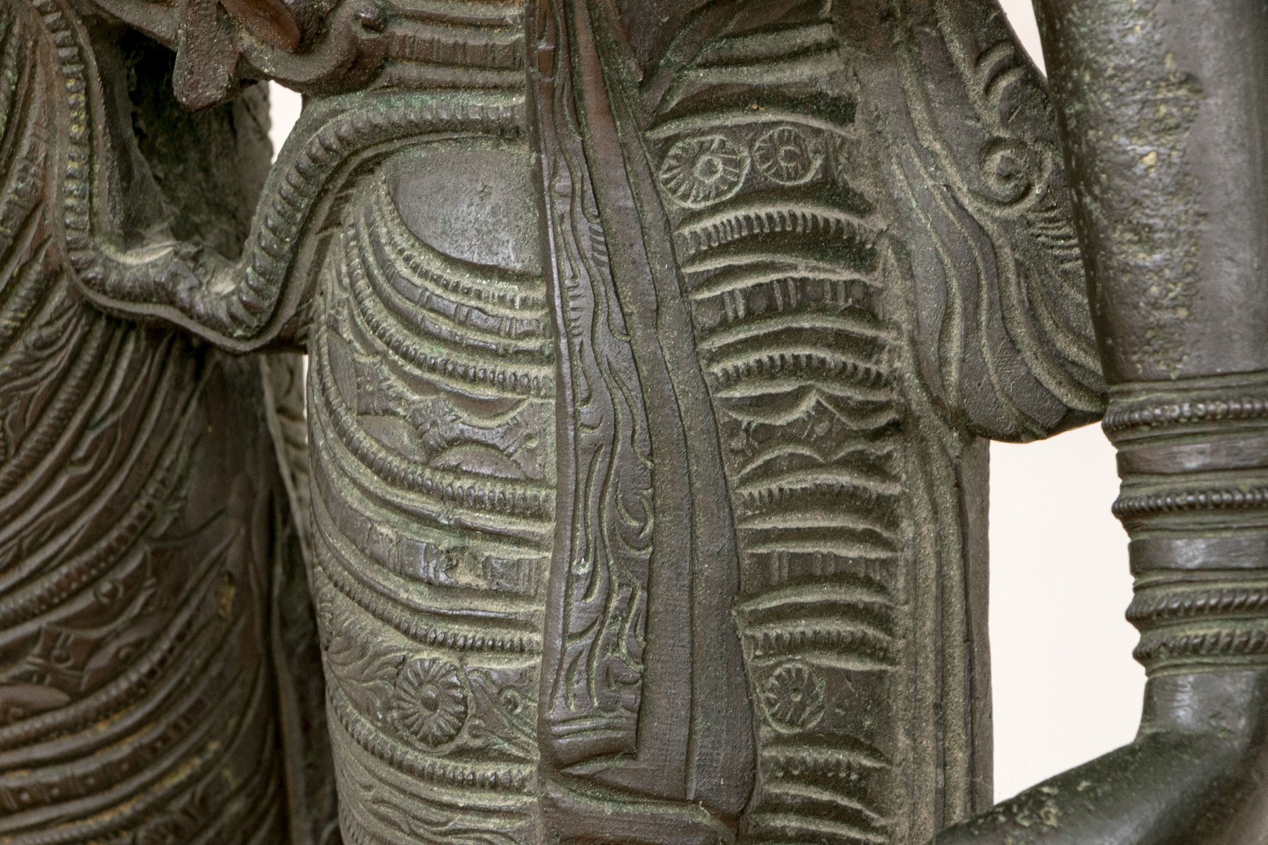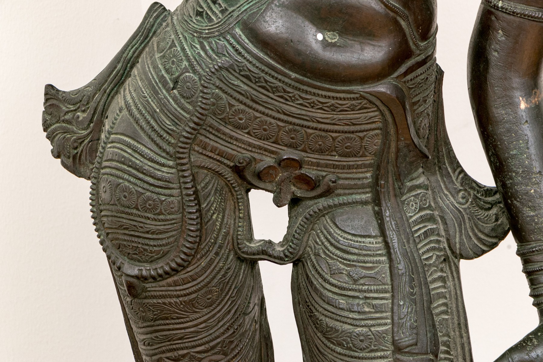 The bronze figure of Parvatti has an oval face, with striking almond form eyes and an angular nose.