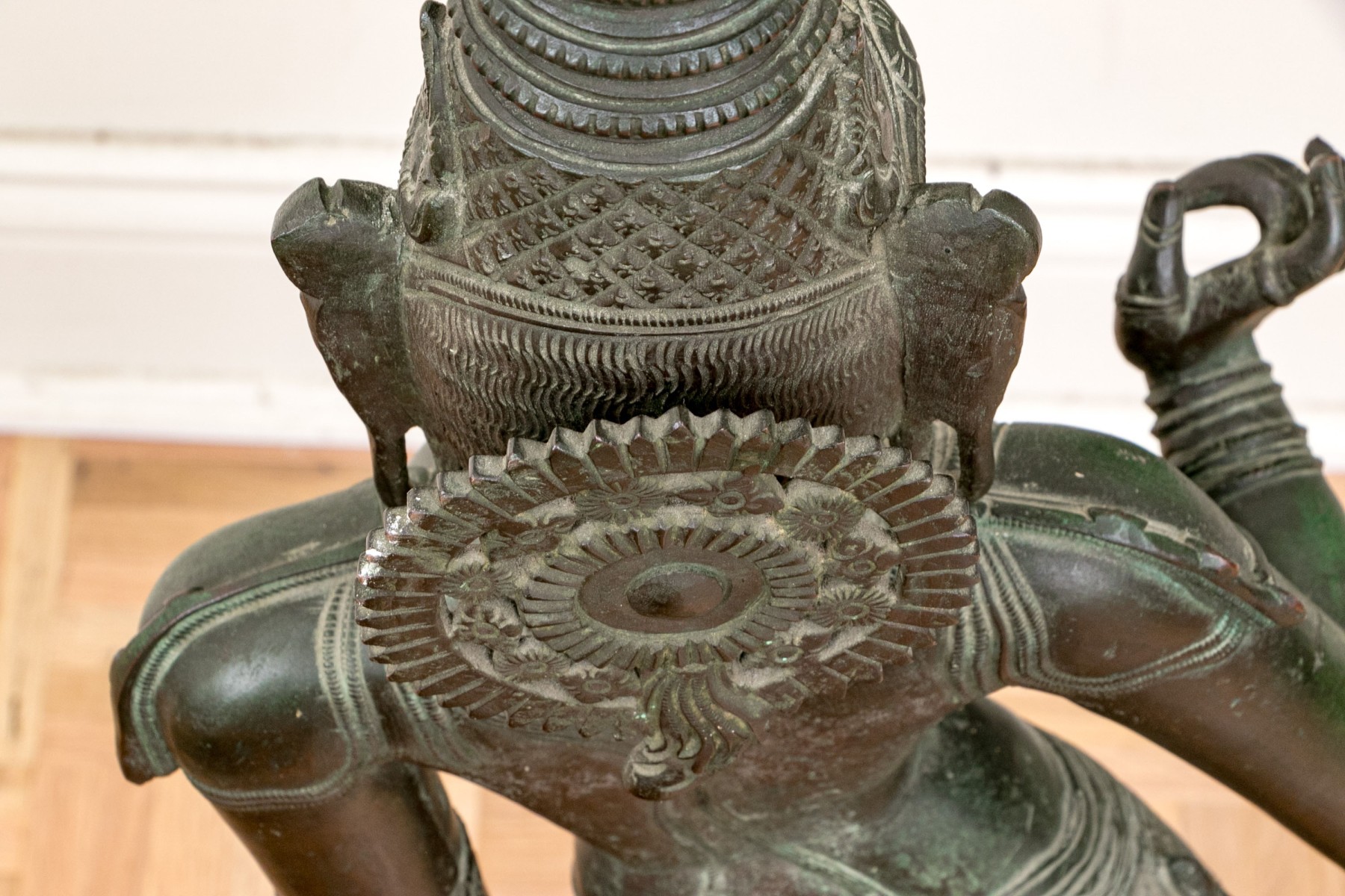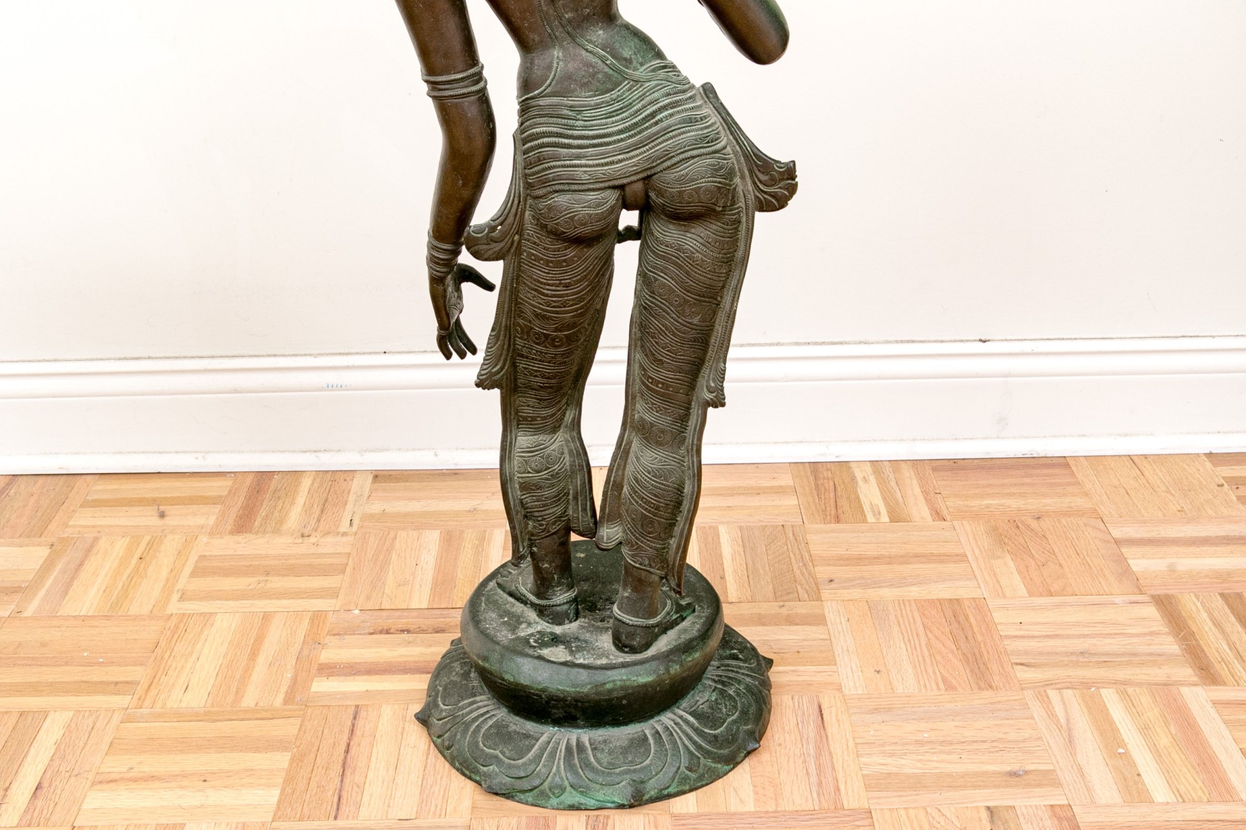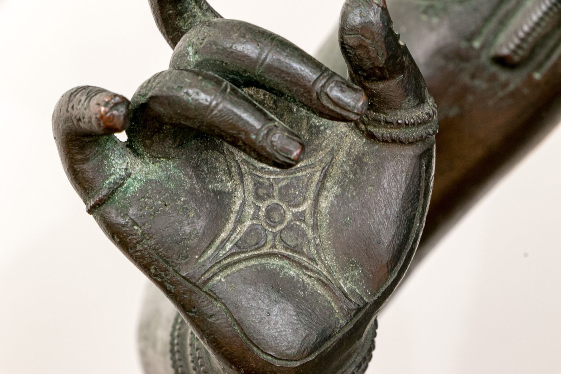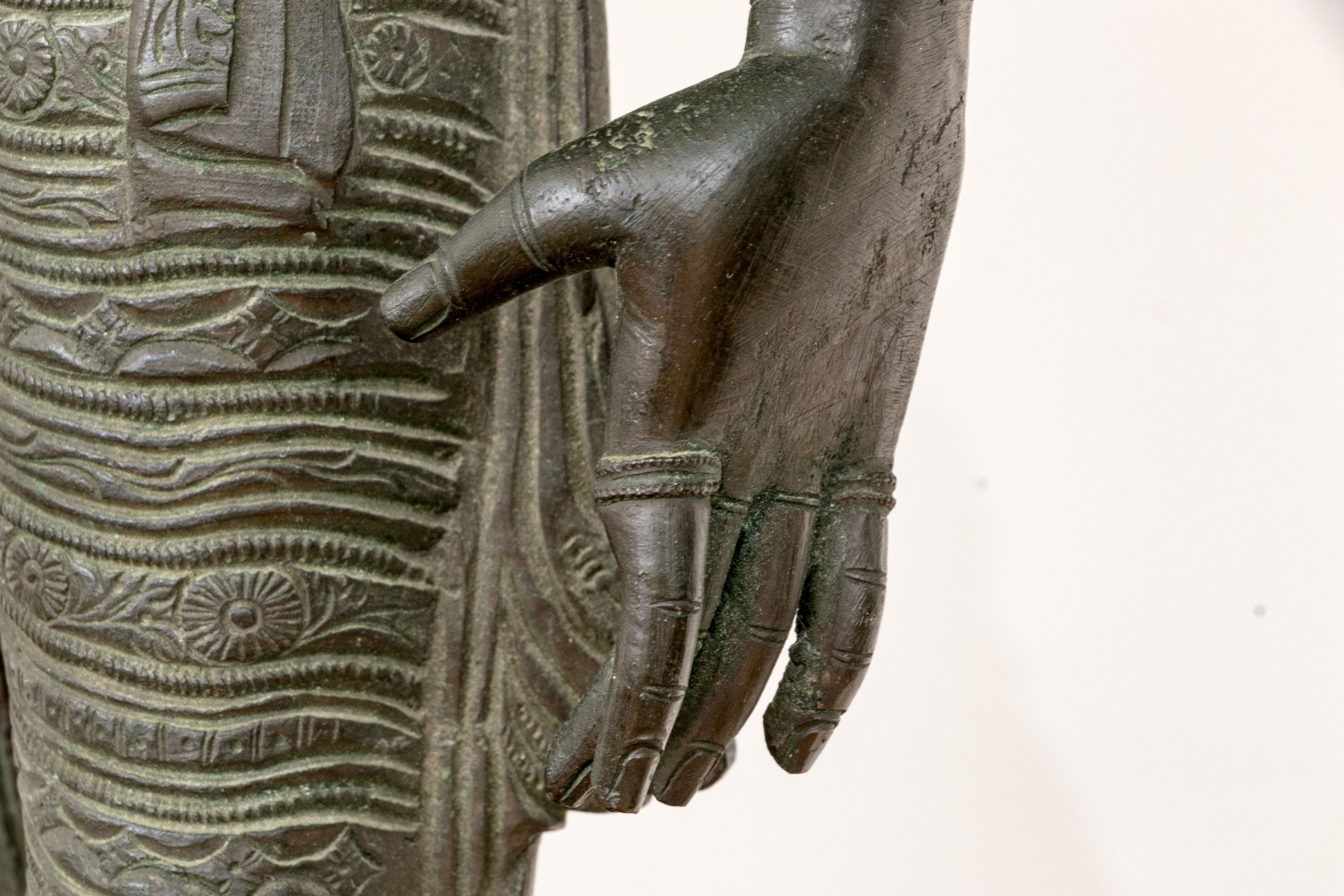 The bronze figure of Parvatti has an oval face, with striking almond form eyes and an angular nose.