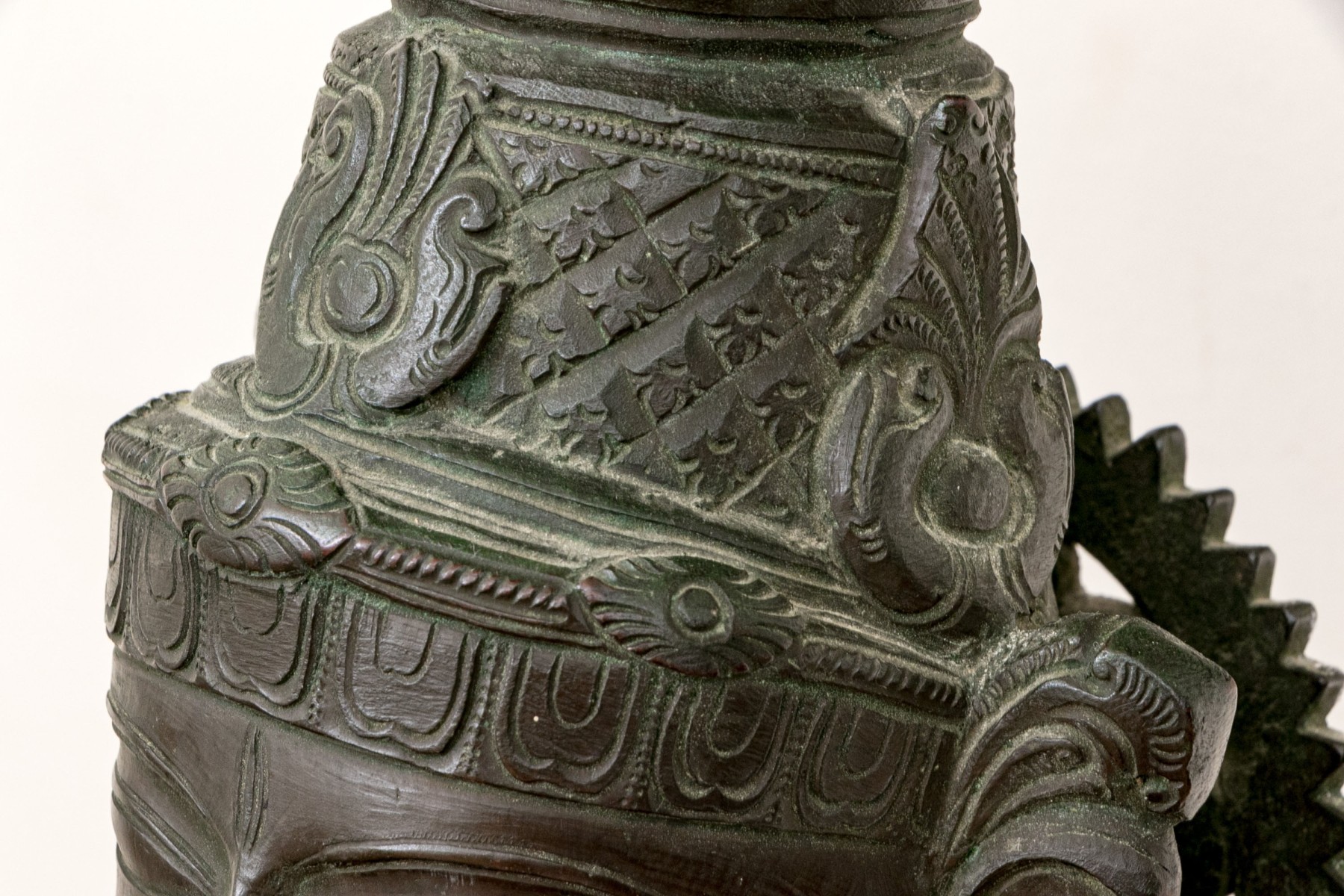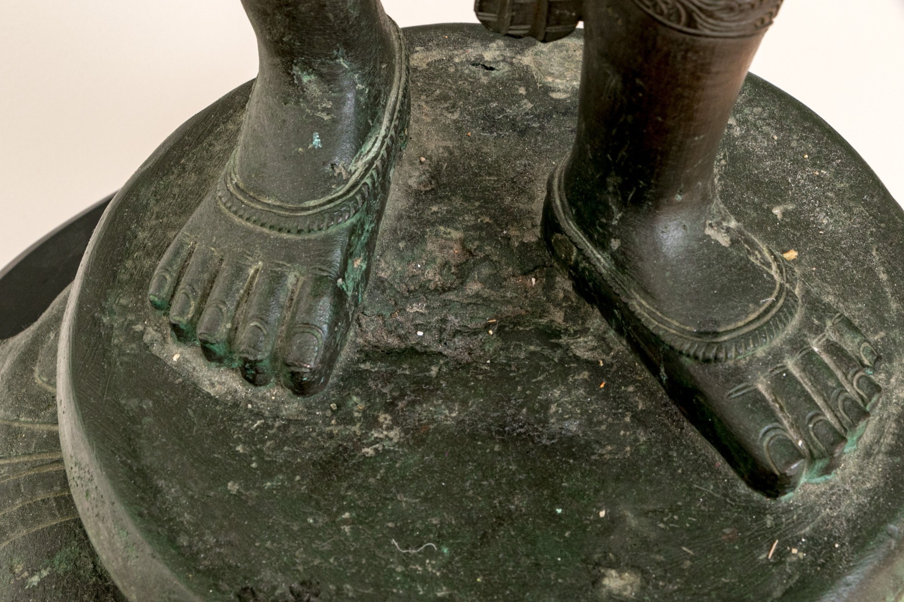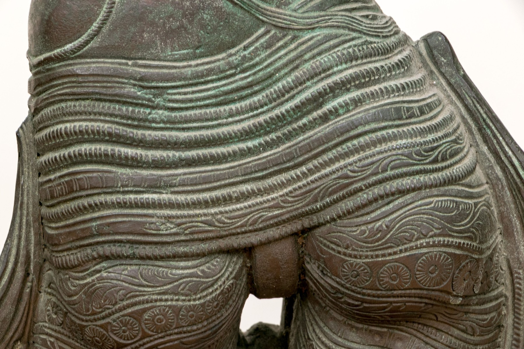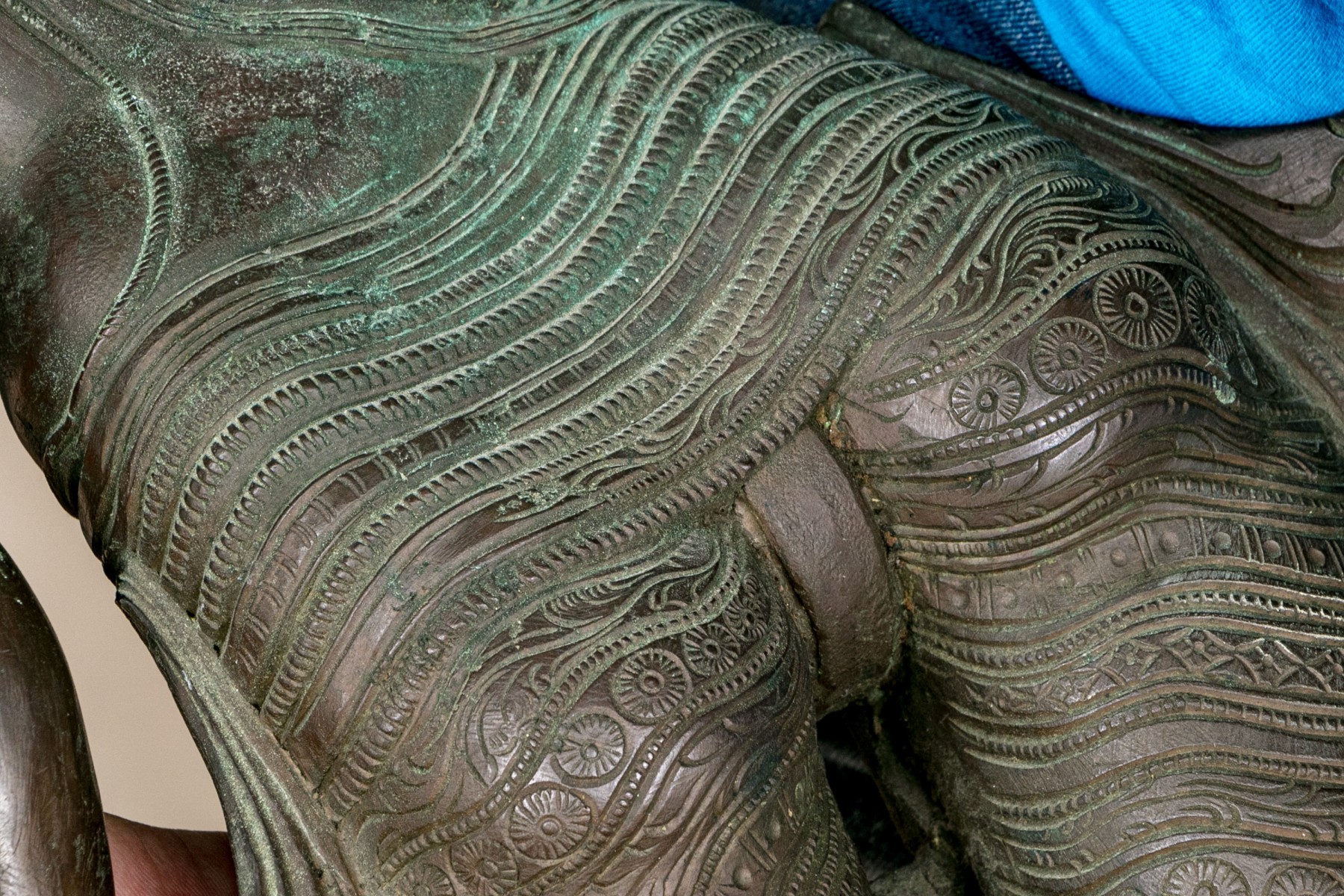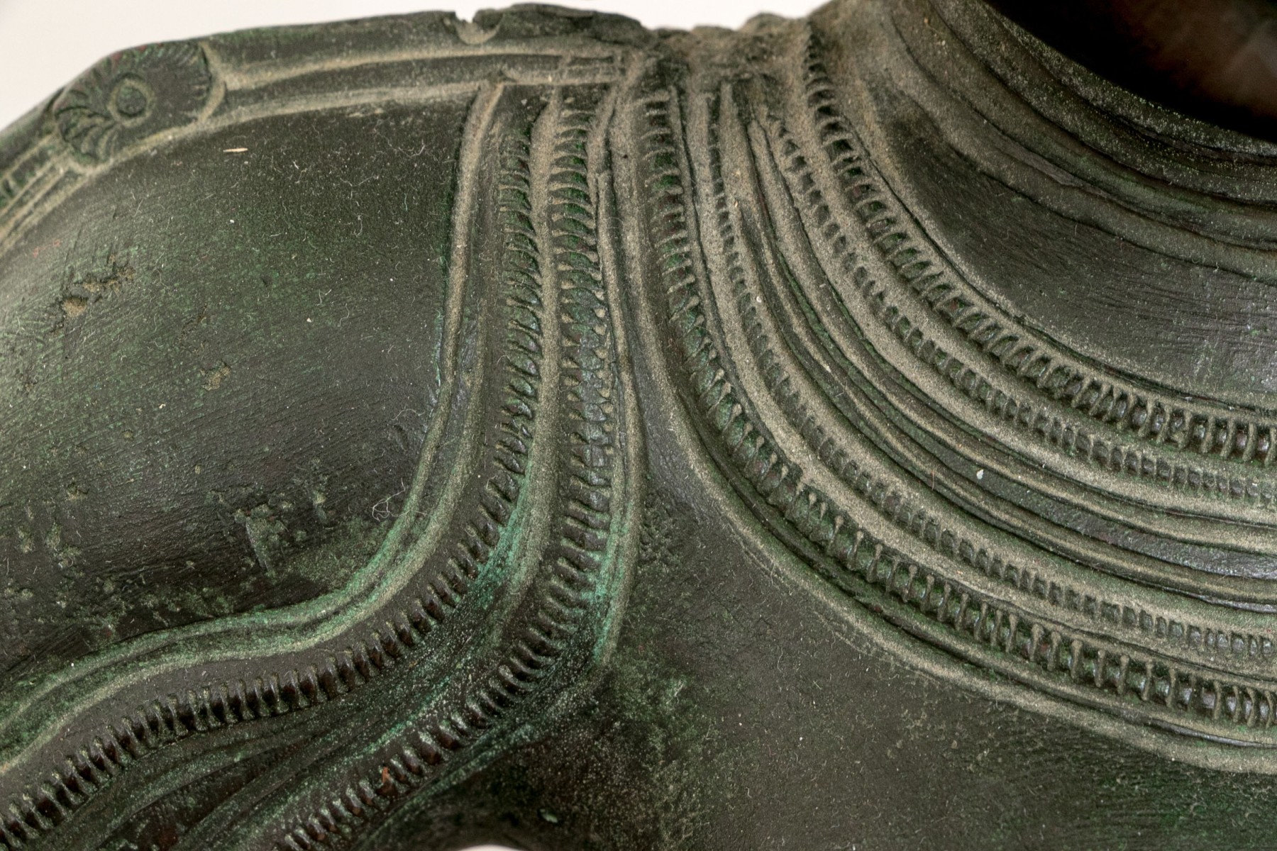 The bronze figure of Parvatti has an oval face, with striking almond form eyes and an angular nose.