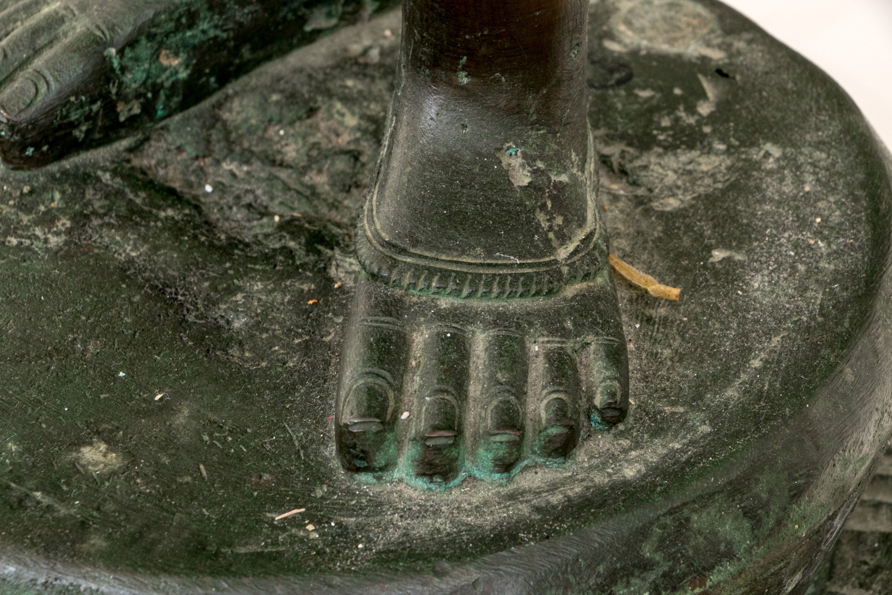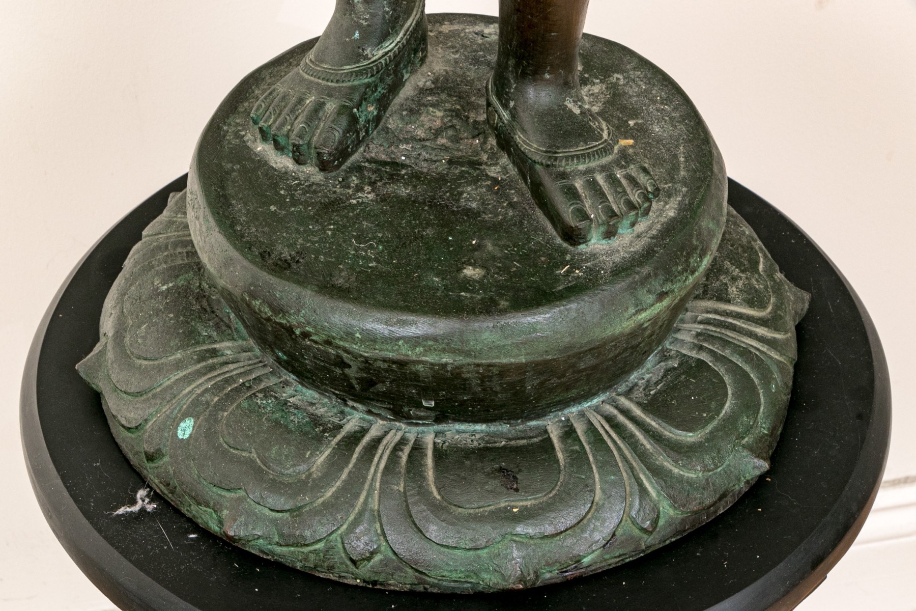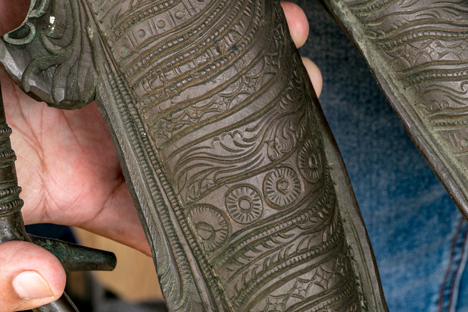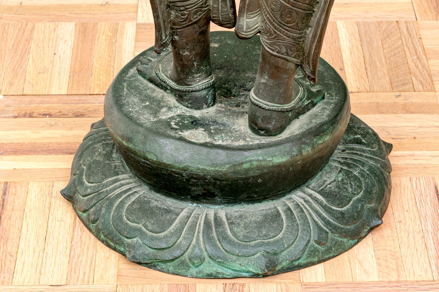 The bronze figure of Parvatti has an oval face, with striking almond form eyes and an angular nose.