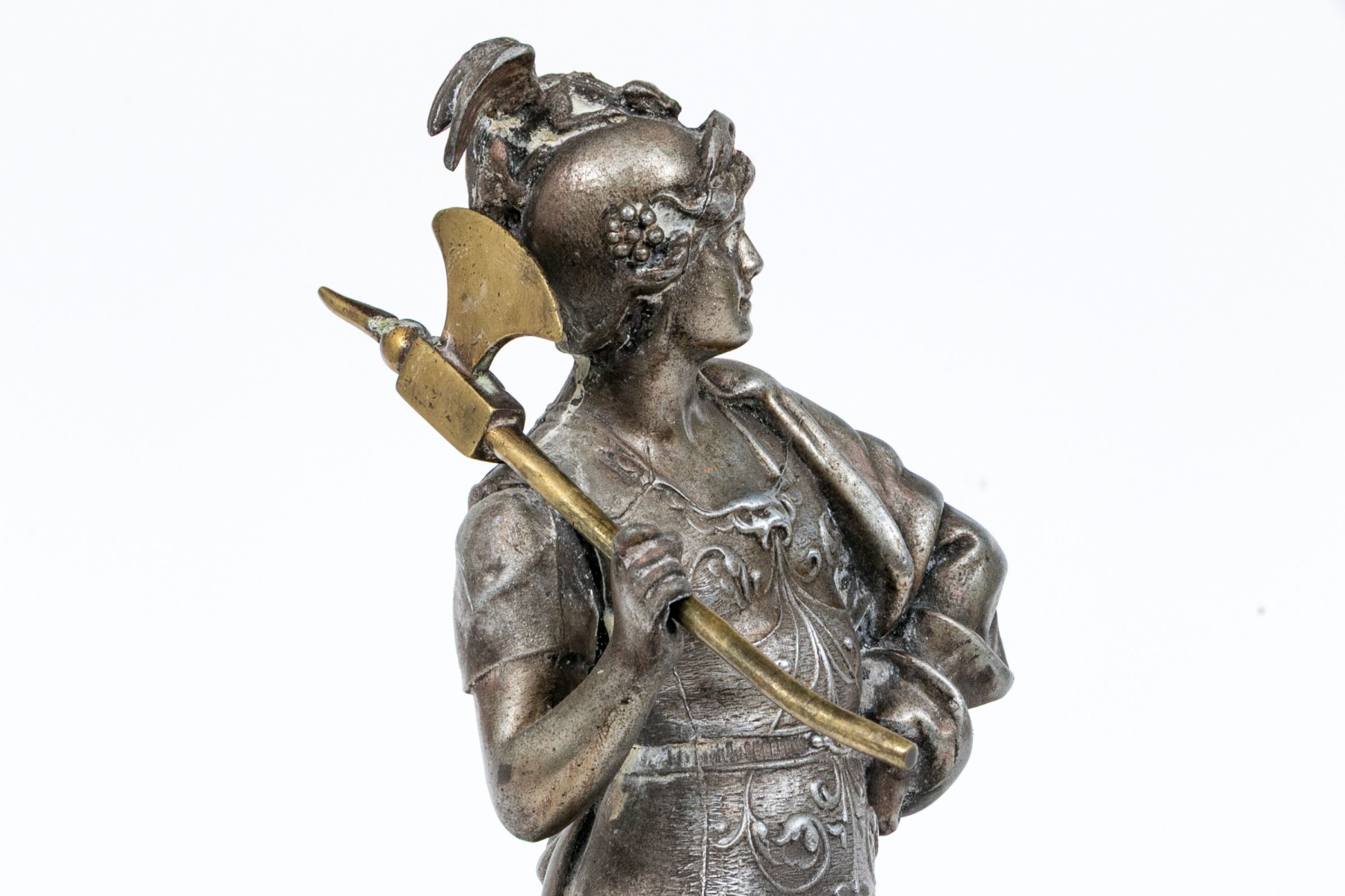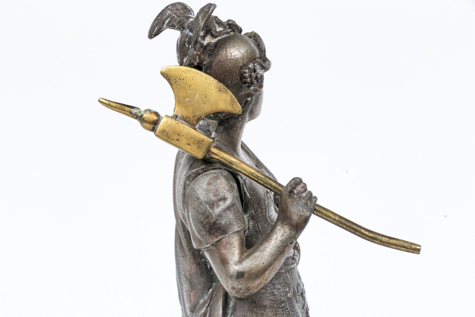 Renaissance revival style of the standing god dressed as a warrior in an elaborate breastplate, long cloak and boots. He stands on a pedestal base and holds a separately made brass axe weapon.