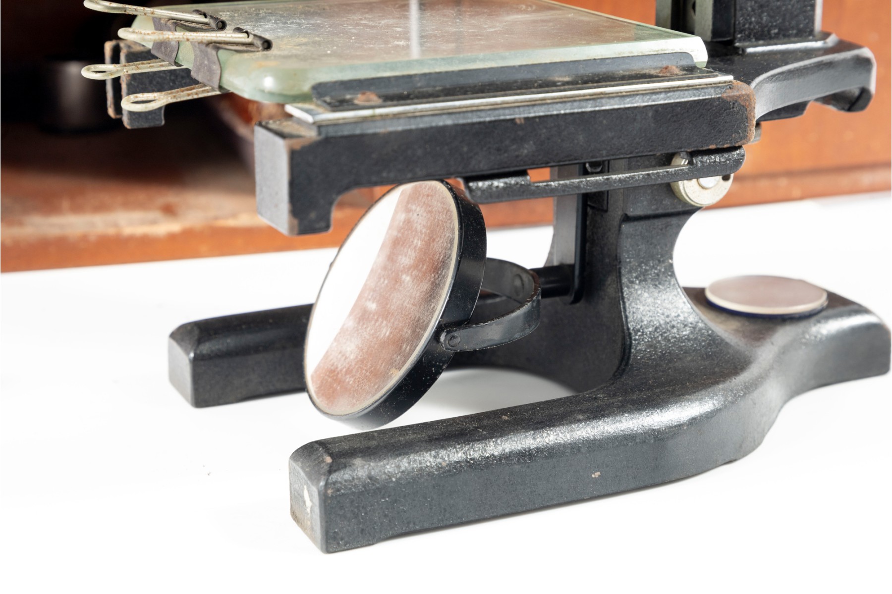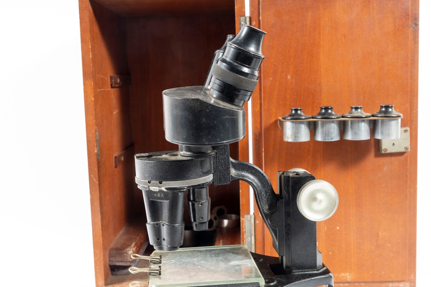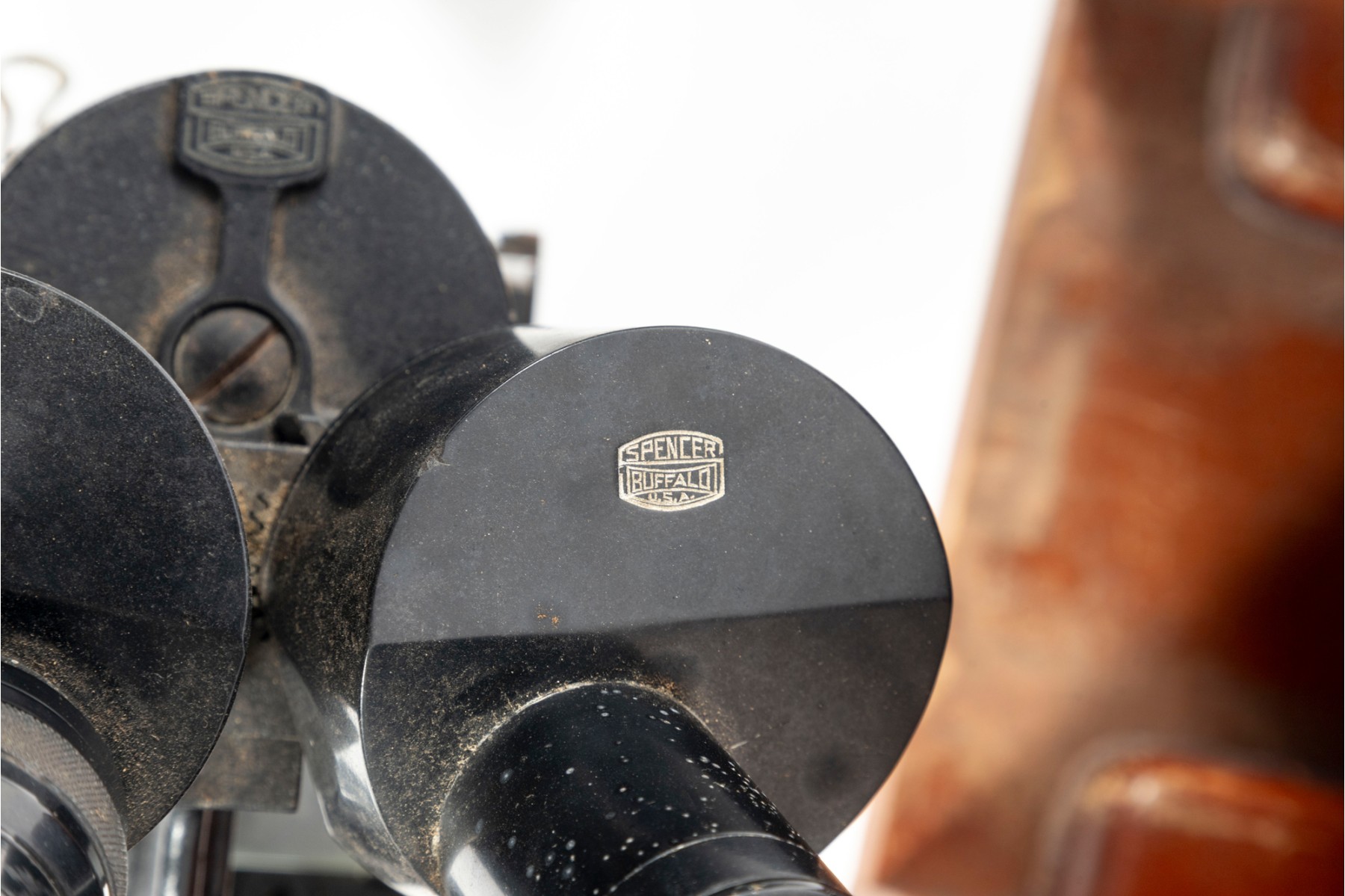 Manufactured by Spencer, a renowned American maker of optical instruments, this stereo microscope features durable construction and precision craftsmanship. The original wooden case adds to its charm, and contains many additional lenses and accessories. See photos for details.