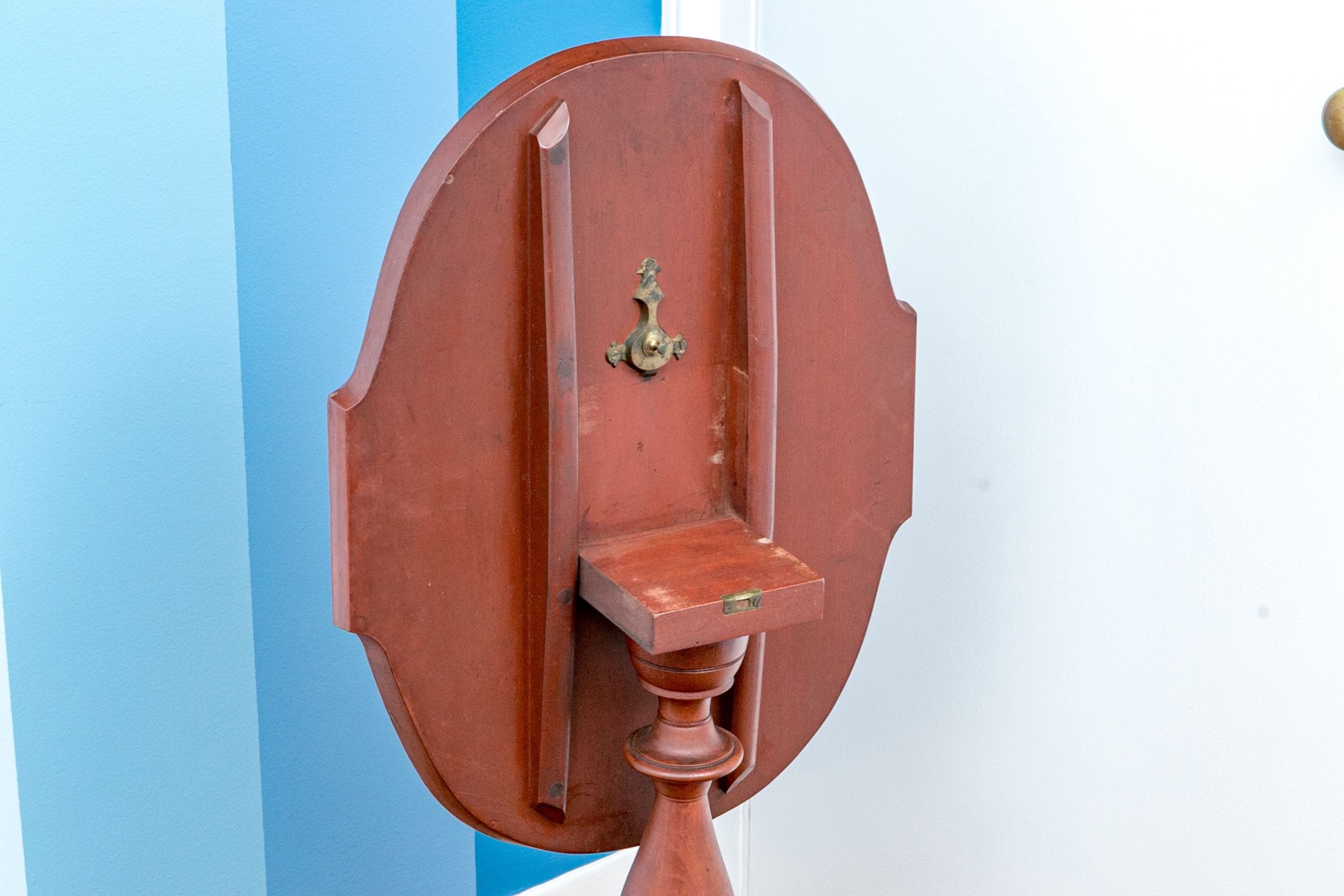 A gorgeous antique tilt-top occasional table showcasing an oval top with bracketed sides in a rich warm-toned brown finish. The tabletop is raised on an elegantly turned baluster column over a simple tripod of nicely curved legs.