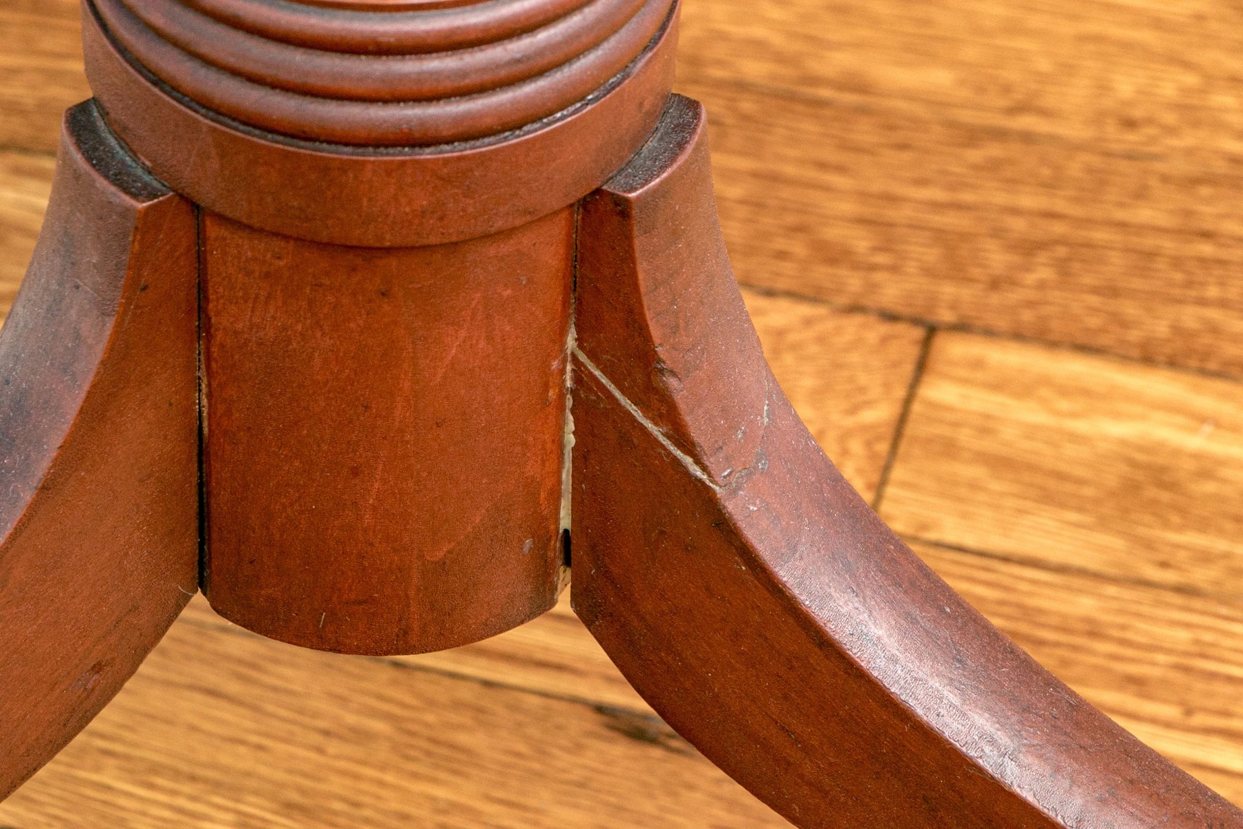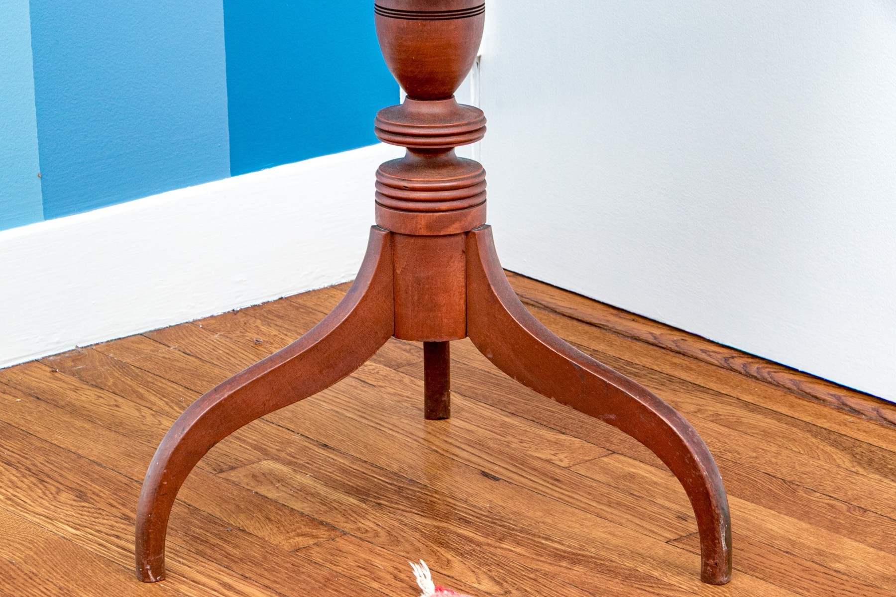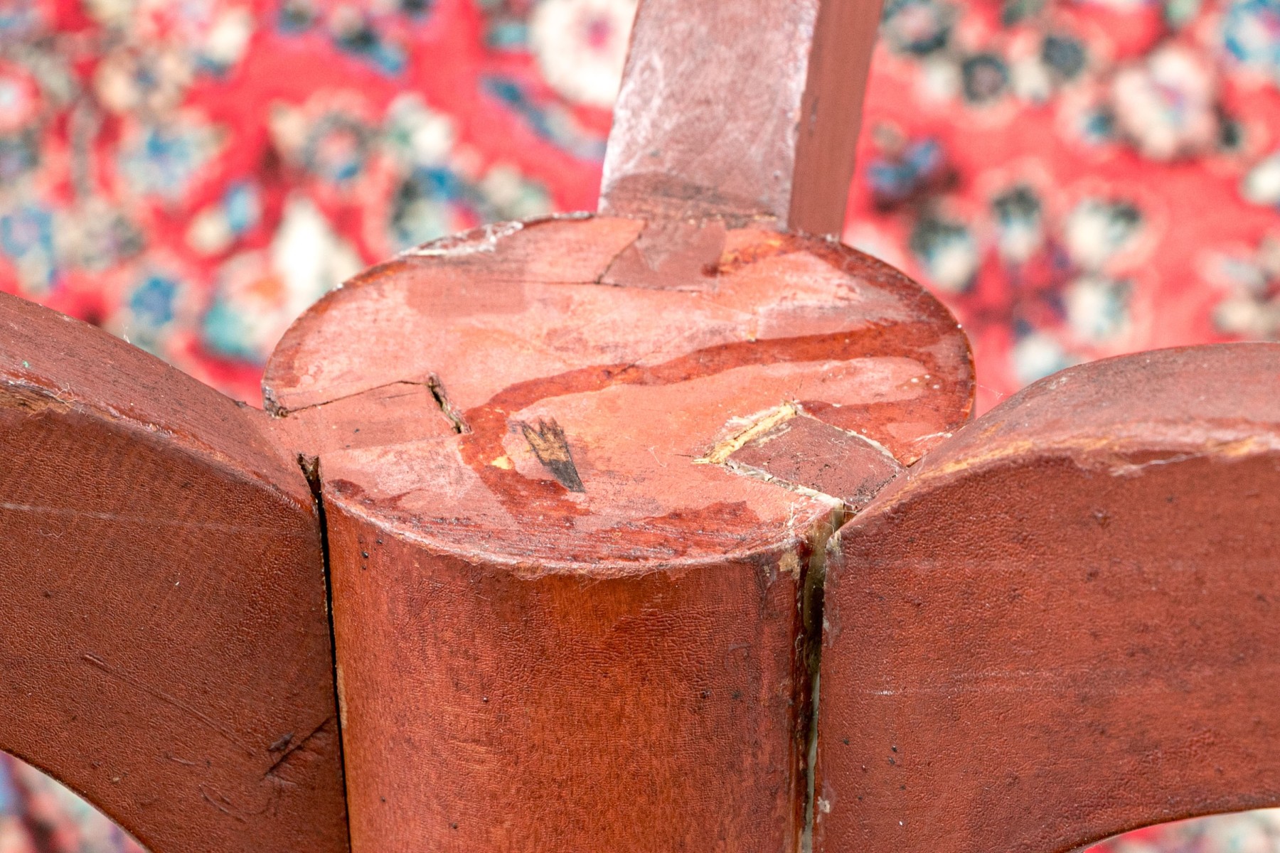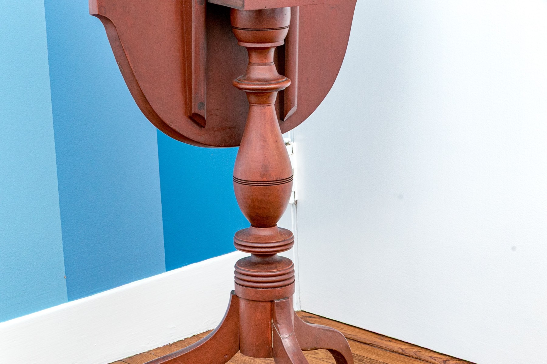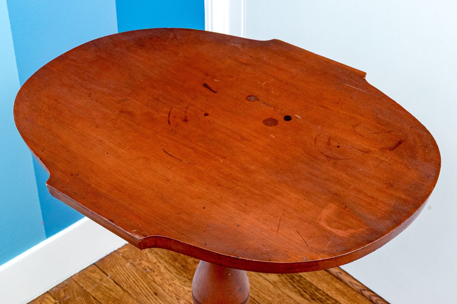 Presents well overall, with wear commensurate with age and use including ring stains, finish wear, and gentle suffs. One leg has been previously repaired.