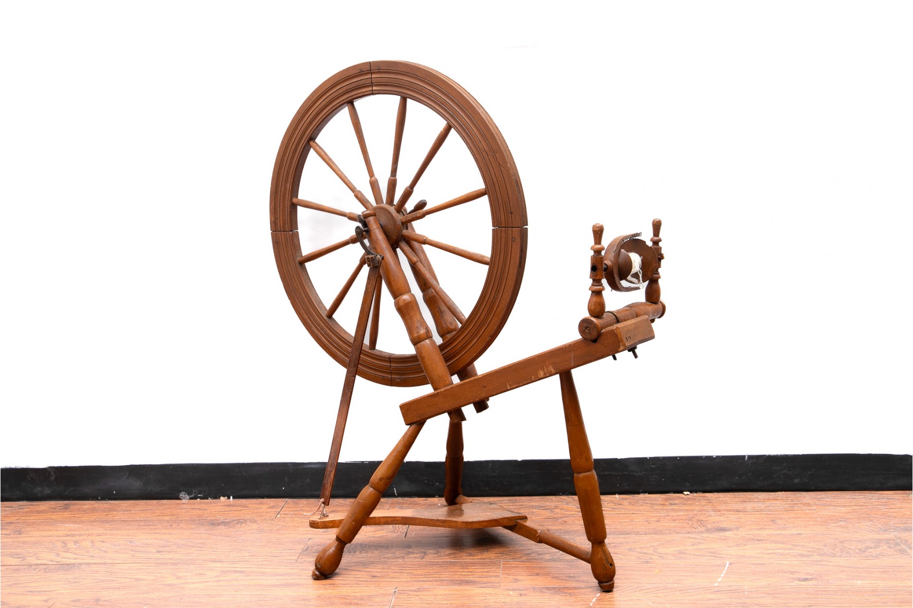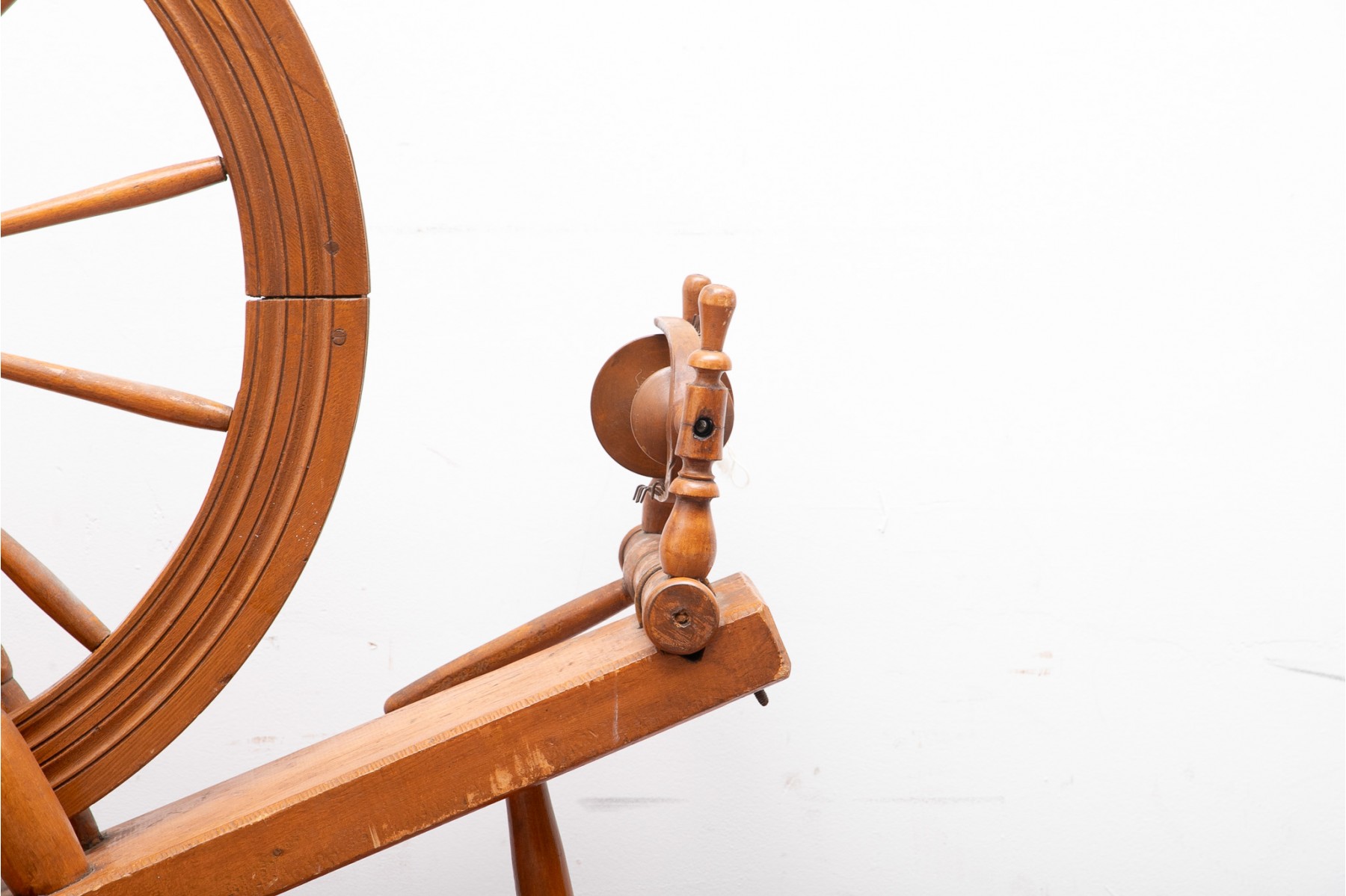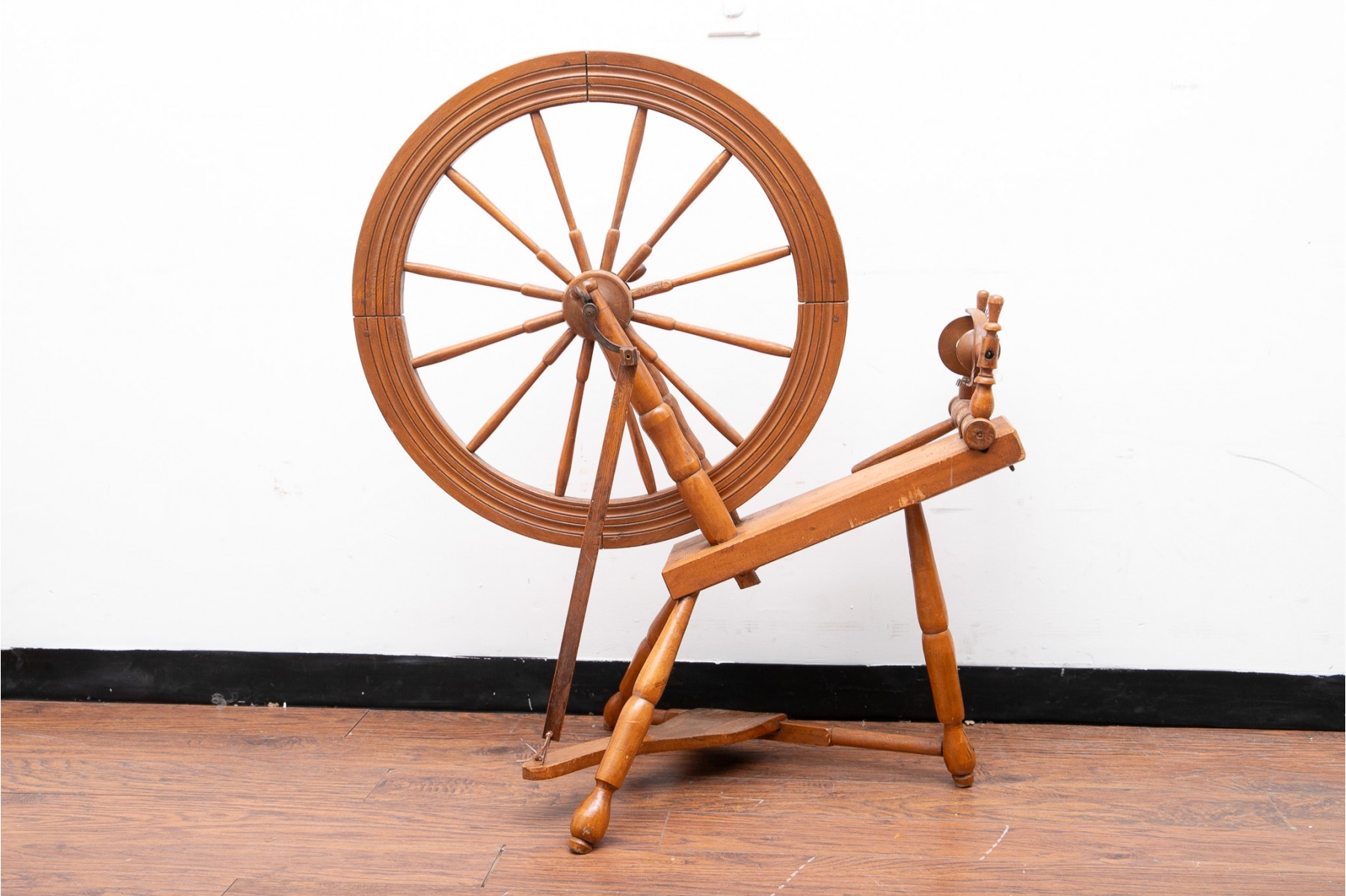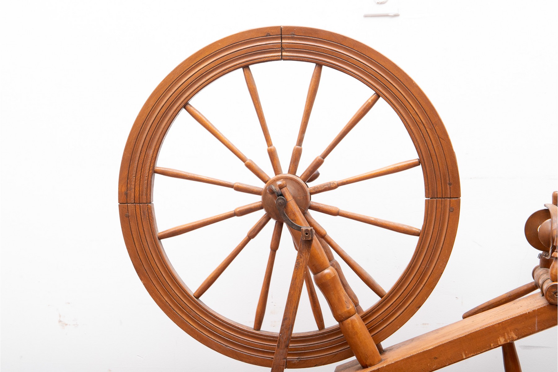 A first half 20th century spinning wheel in a warm medium brown finish.