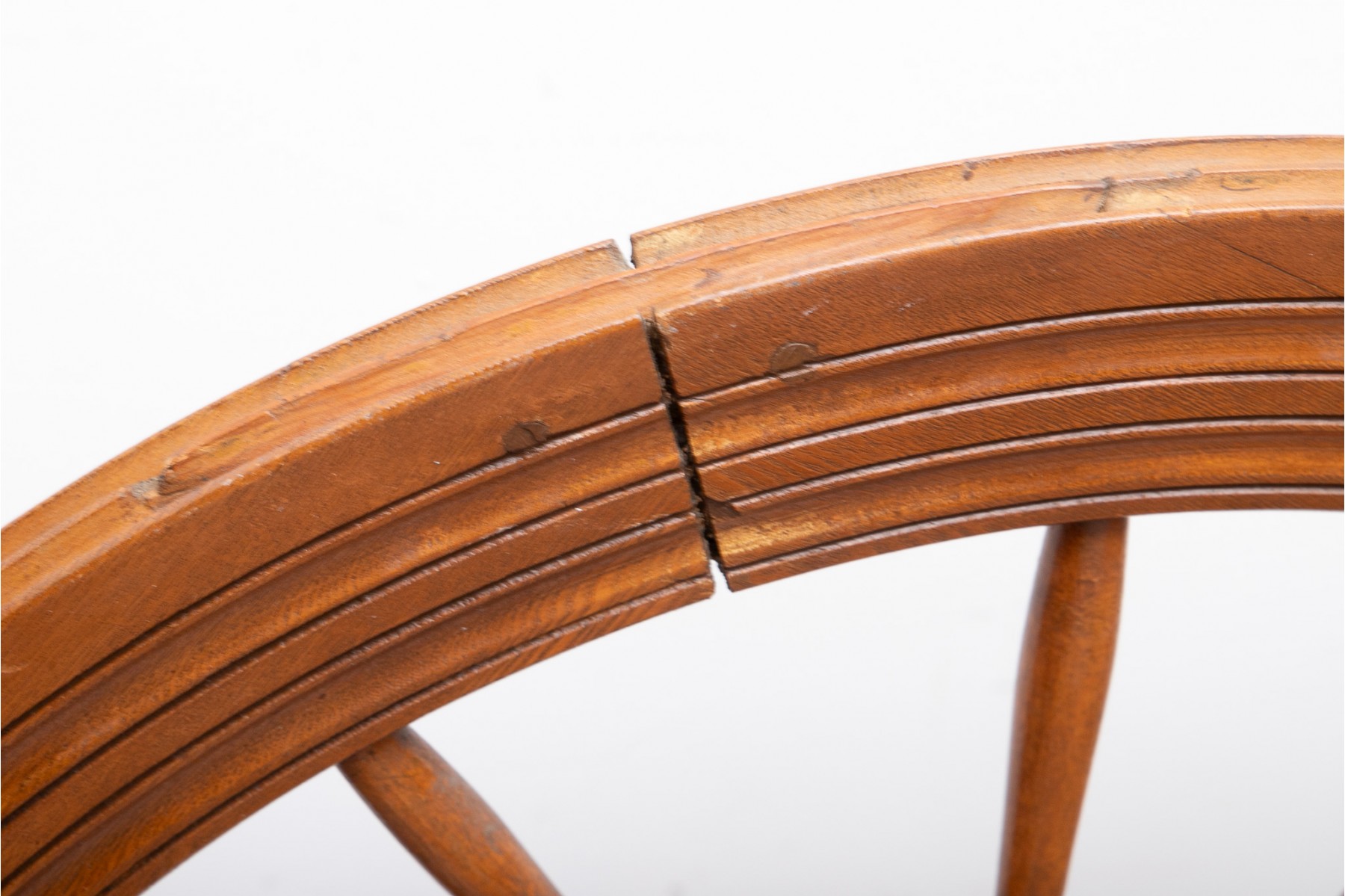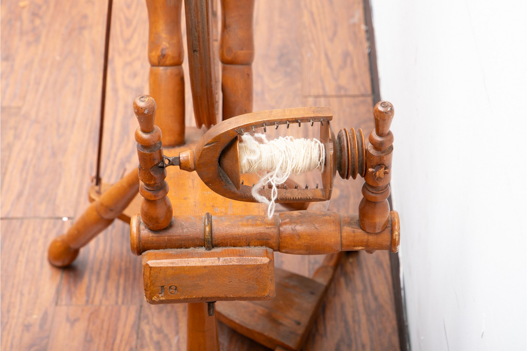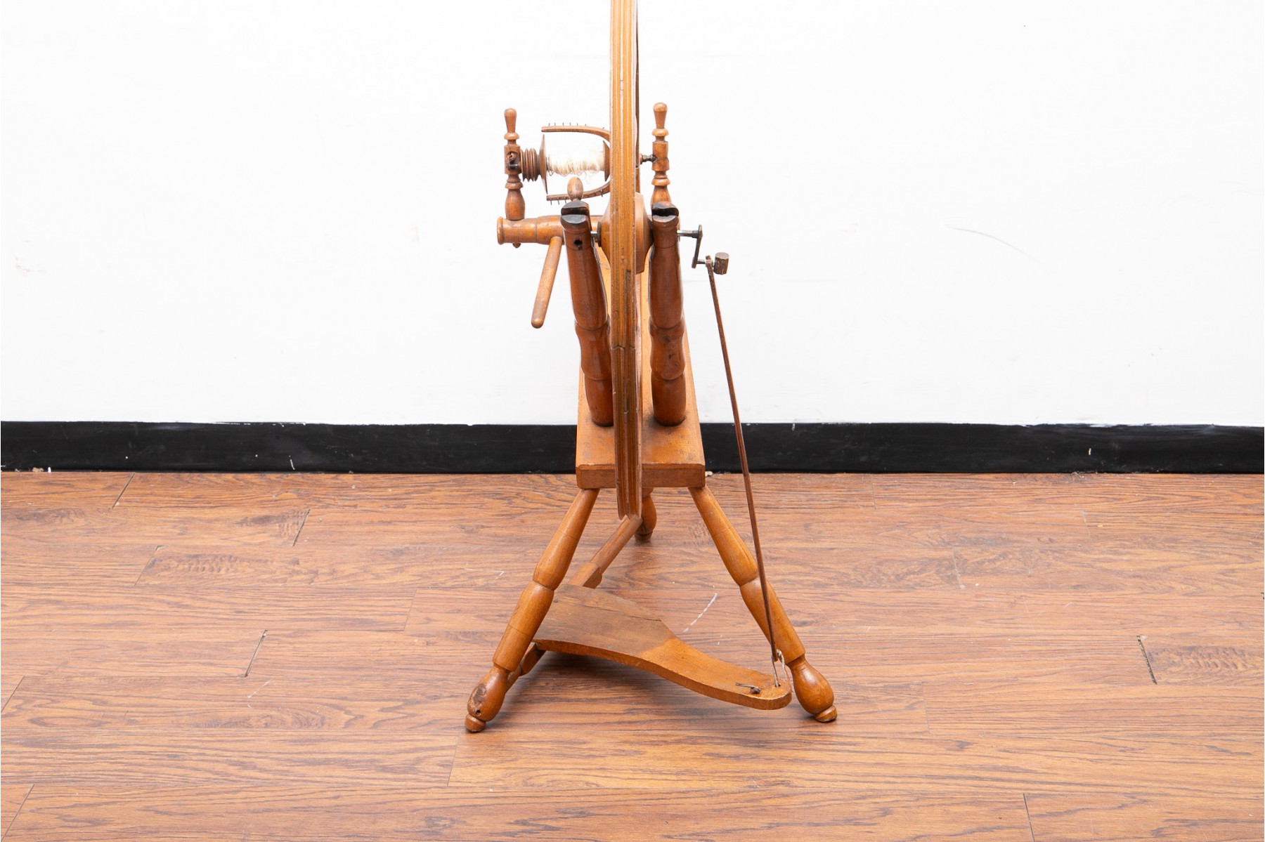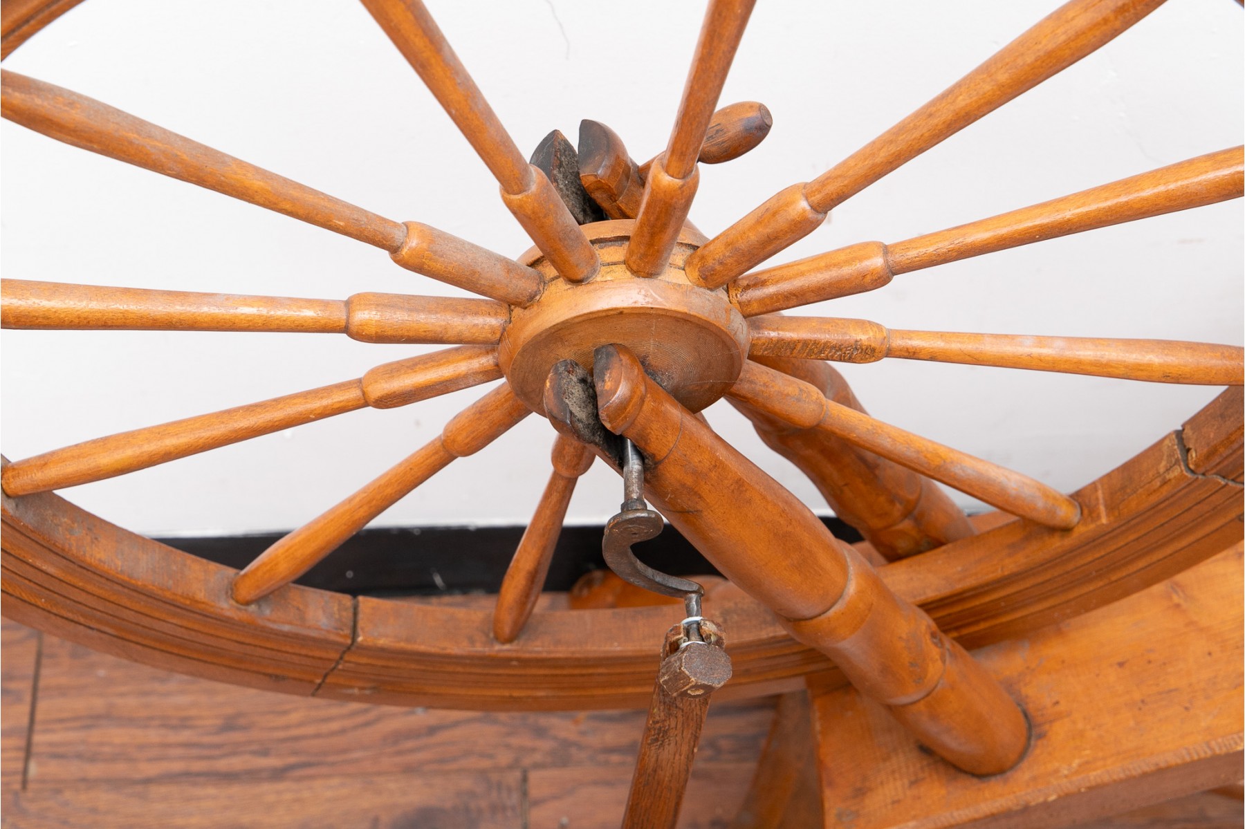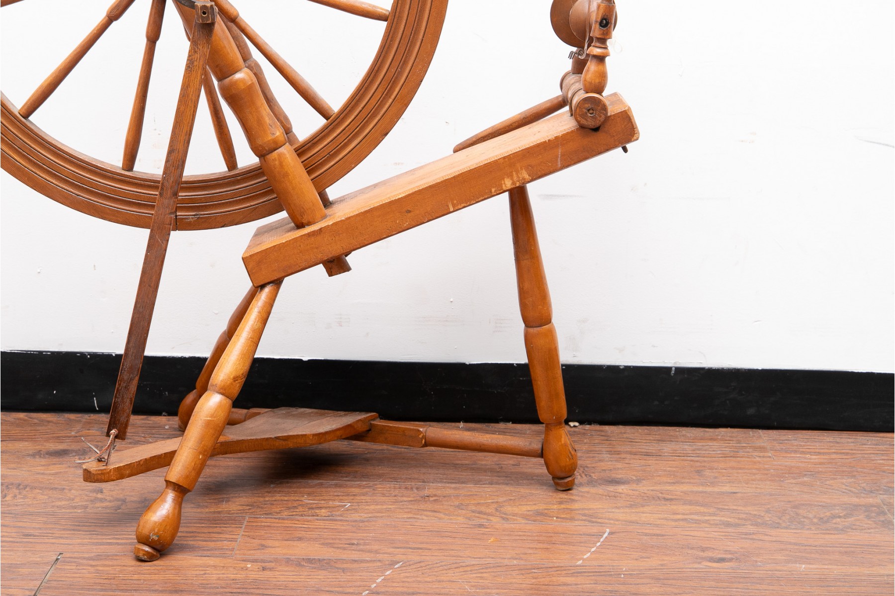 A first half 20th century spinning wheel in a warm medium brown finish.