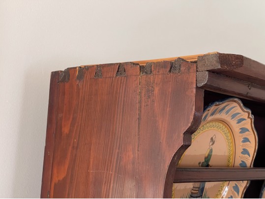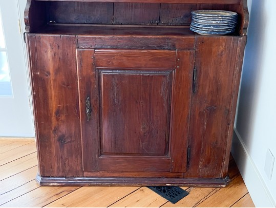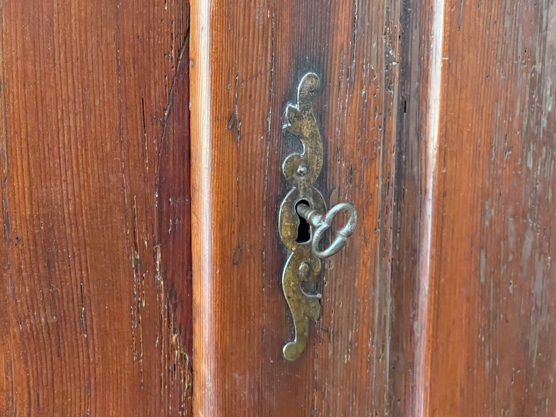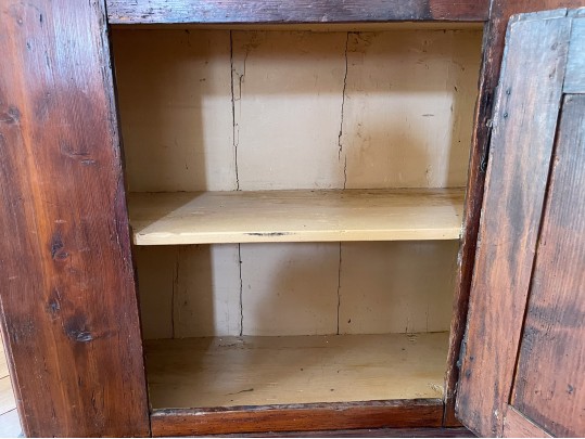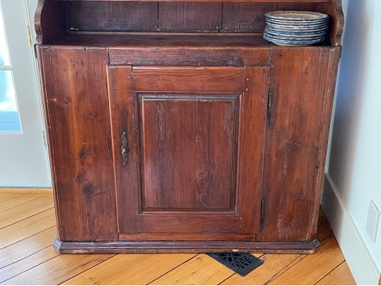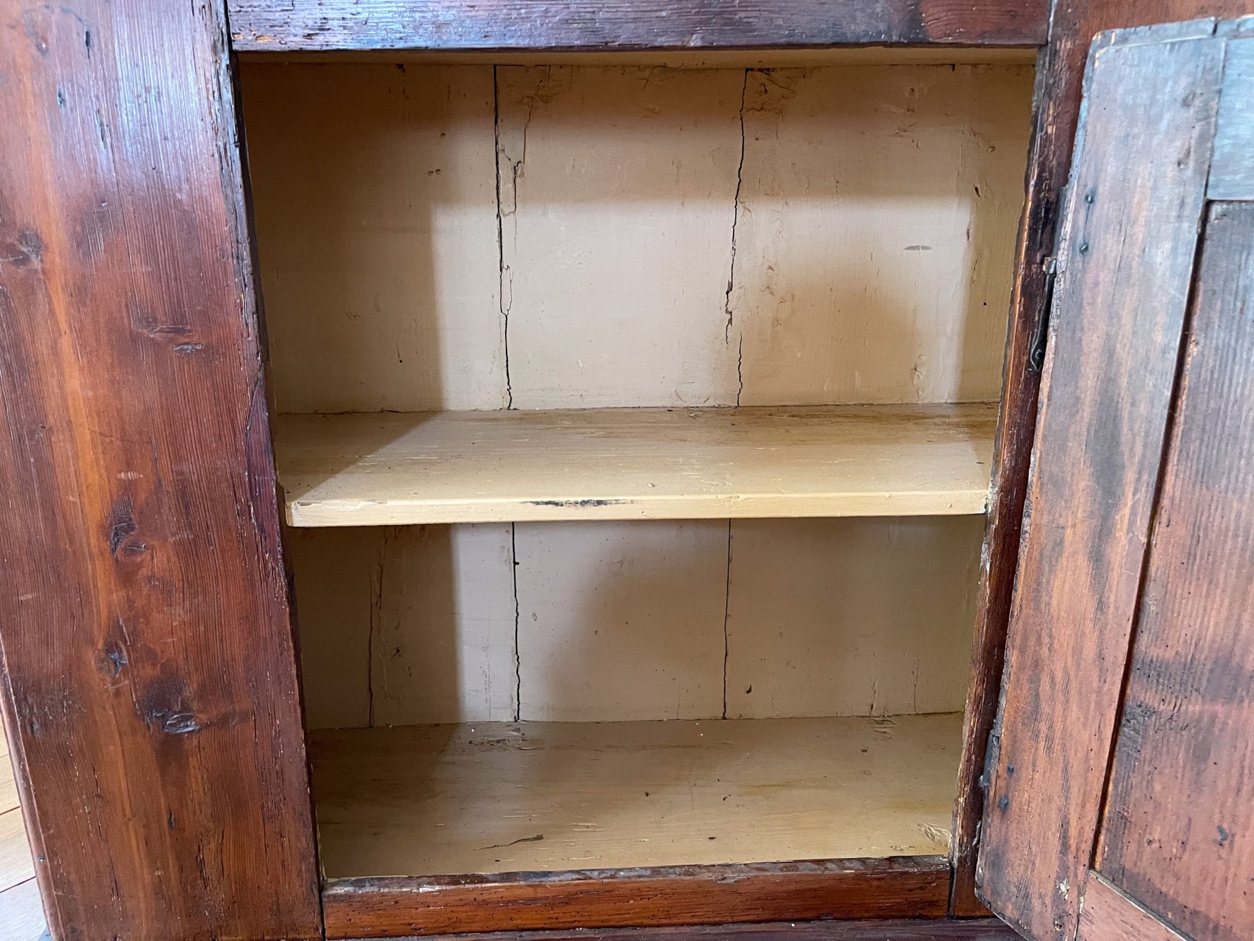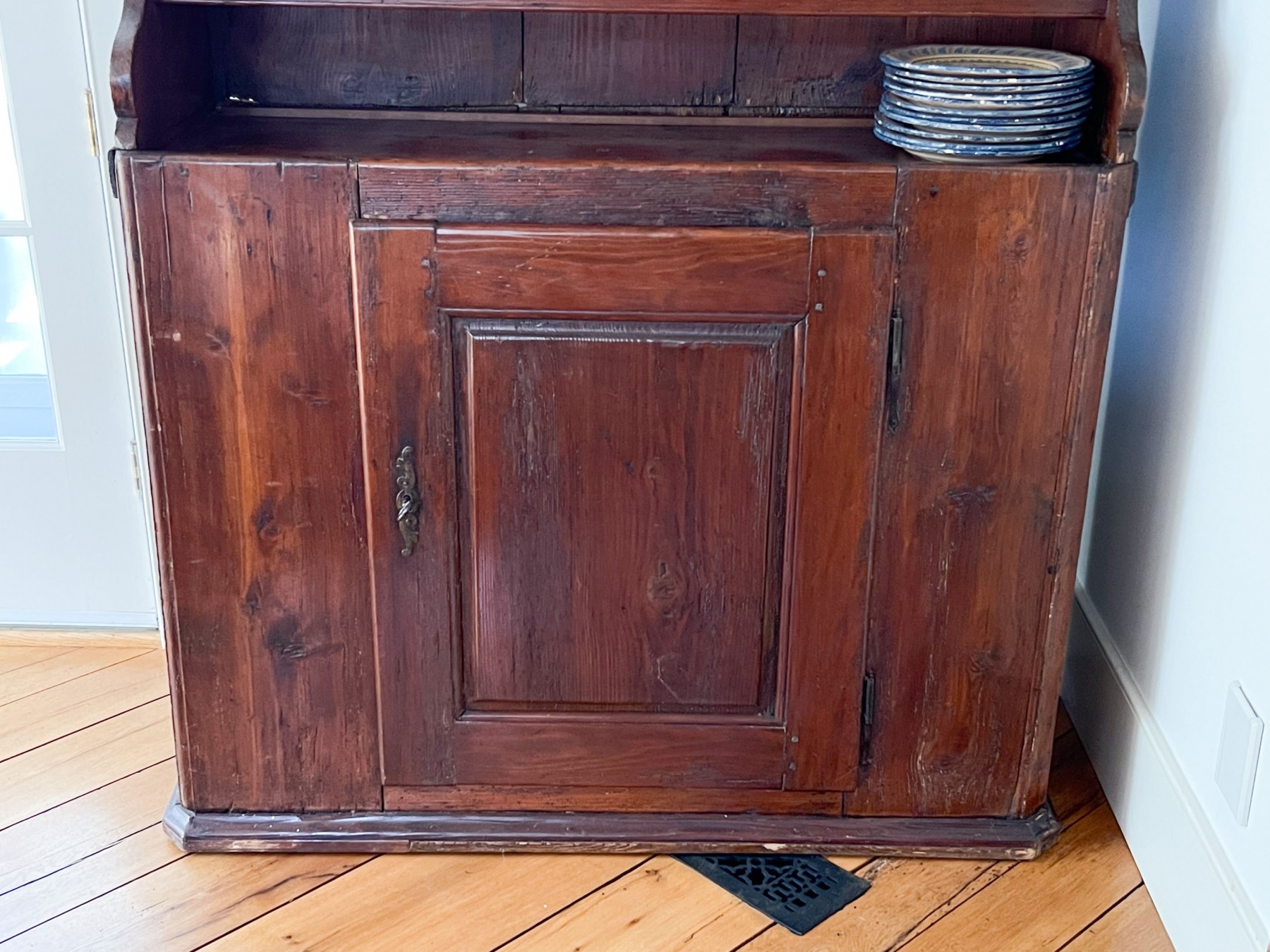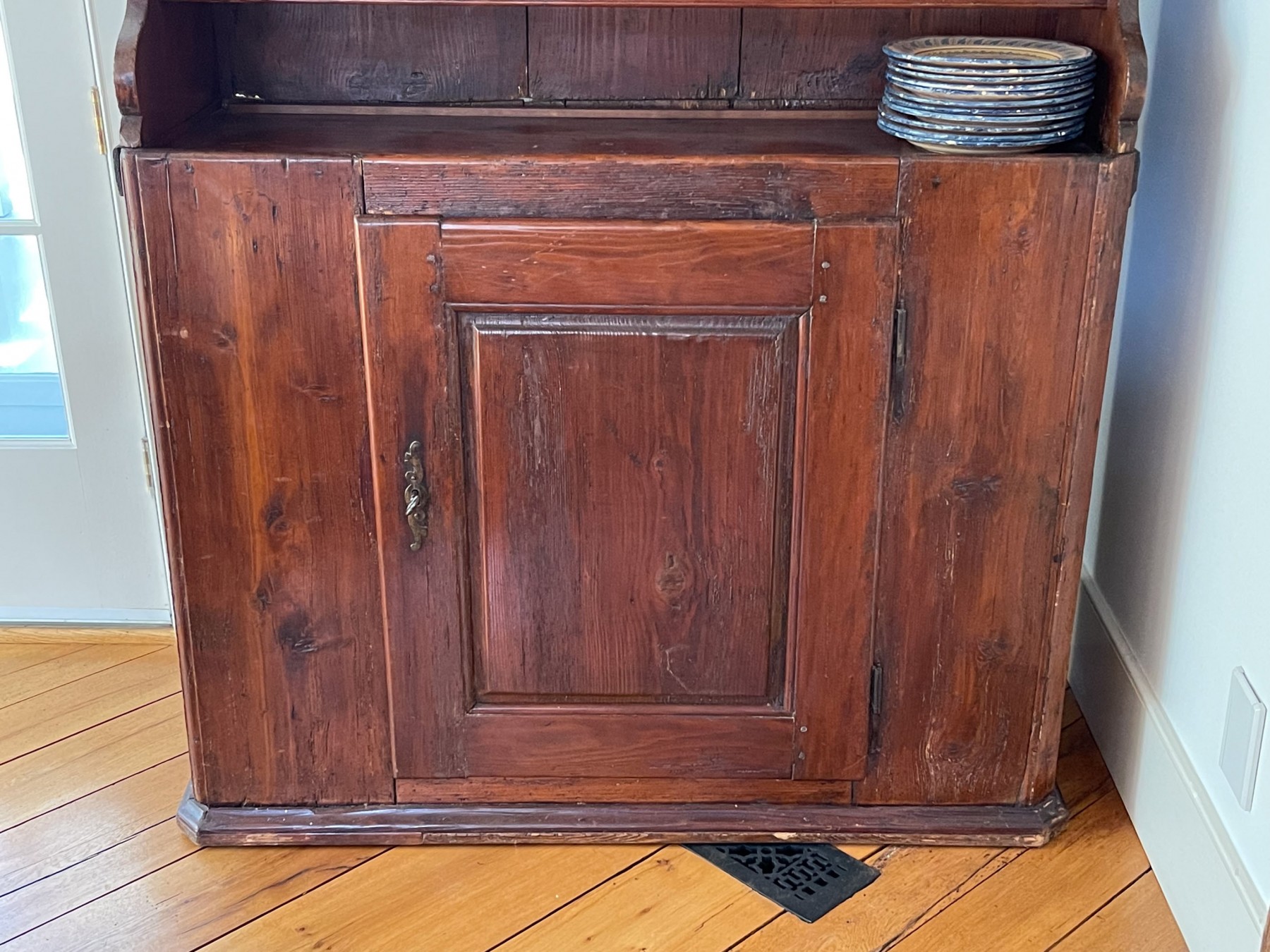 This antique stained pine two-piece cupboard is a rich dark red color. The bottom section features one cabinet door with a single shelf, while the top portion boasts three tiers with plate display racks. It includes a key and exhibits dovetail joinery.