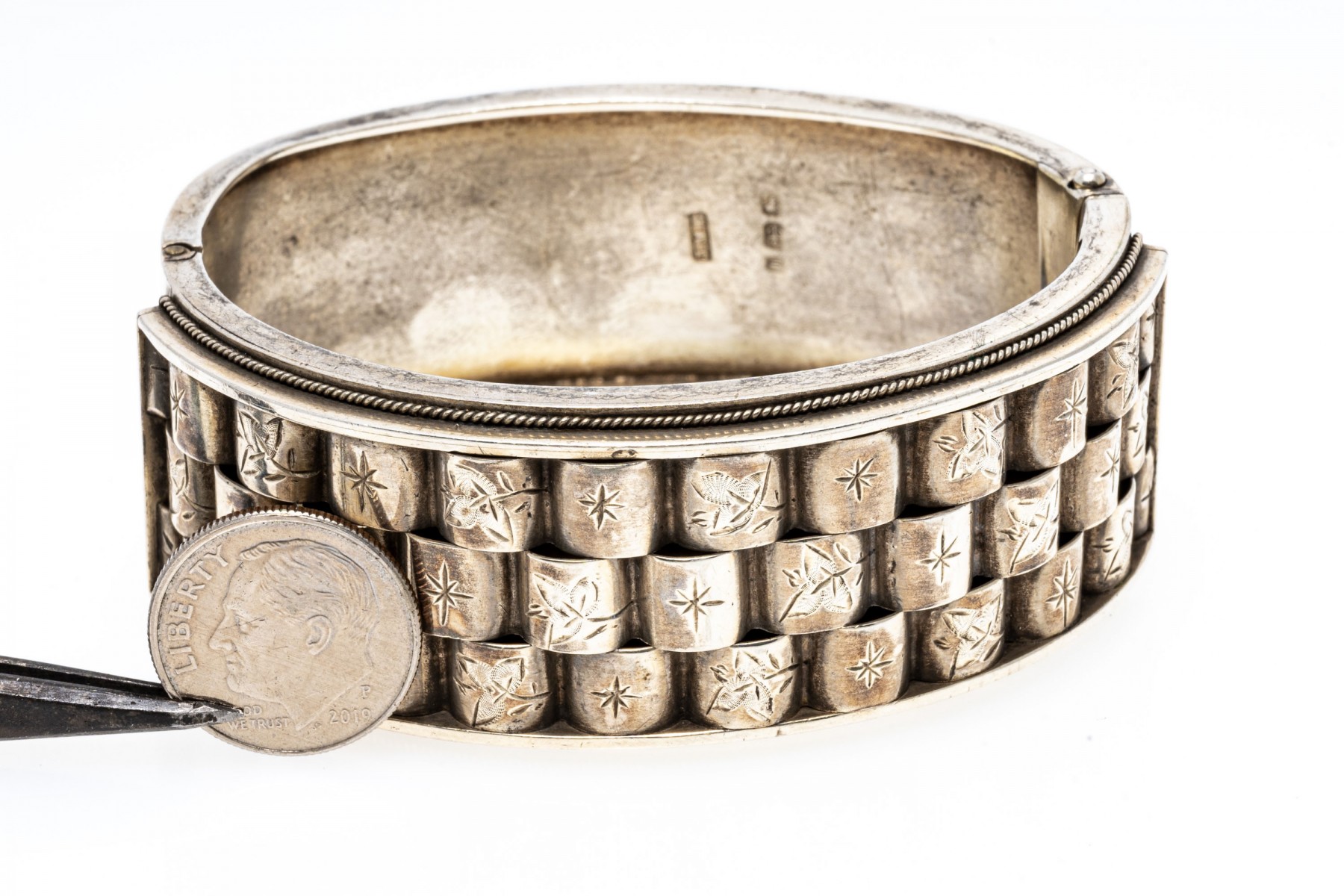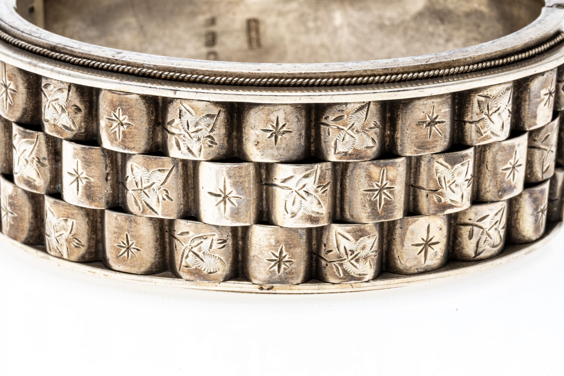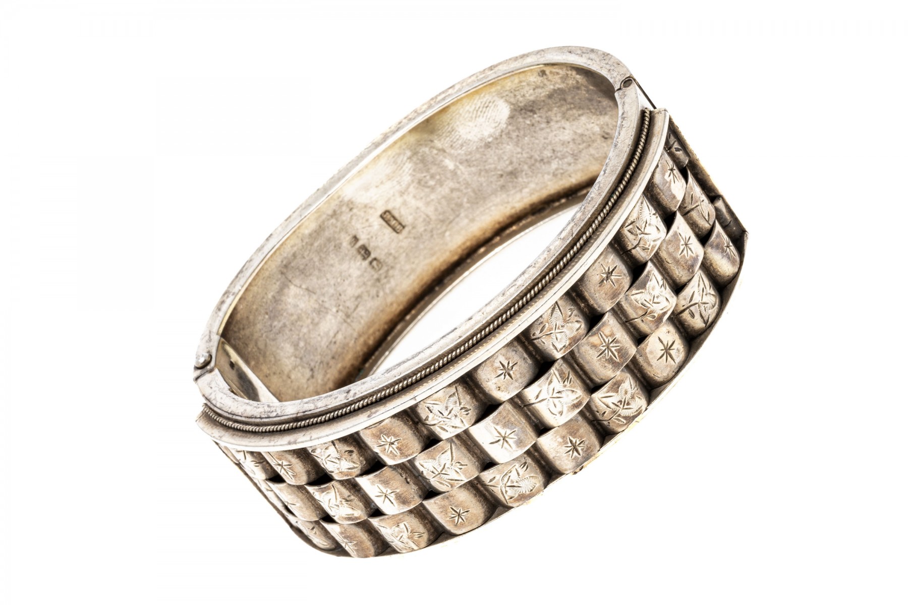 Antique English sterling silver bangle style bracelet. The face of the bracelet has a ribbed design engraved with star and leaf designs. The English sterling silver hallmarks indicate the bracelet was created in 1882. The bangle secures with a box style clasp.