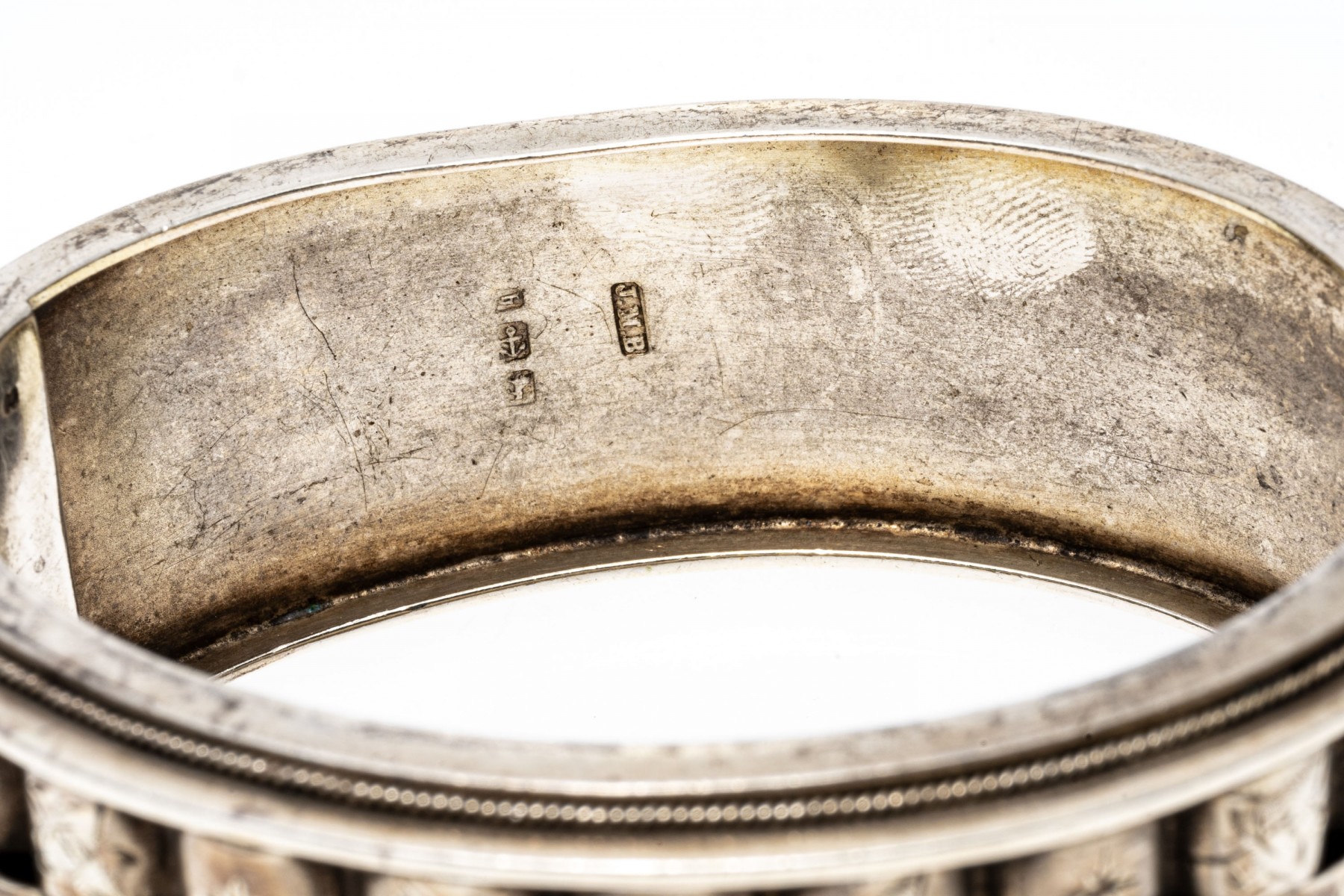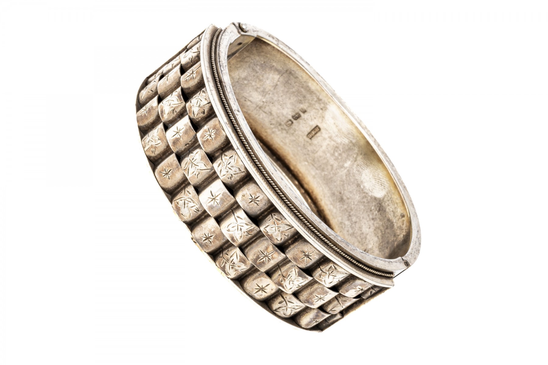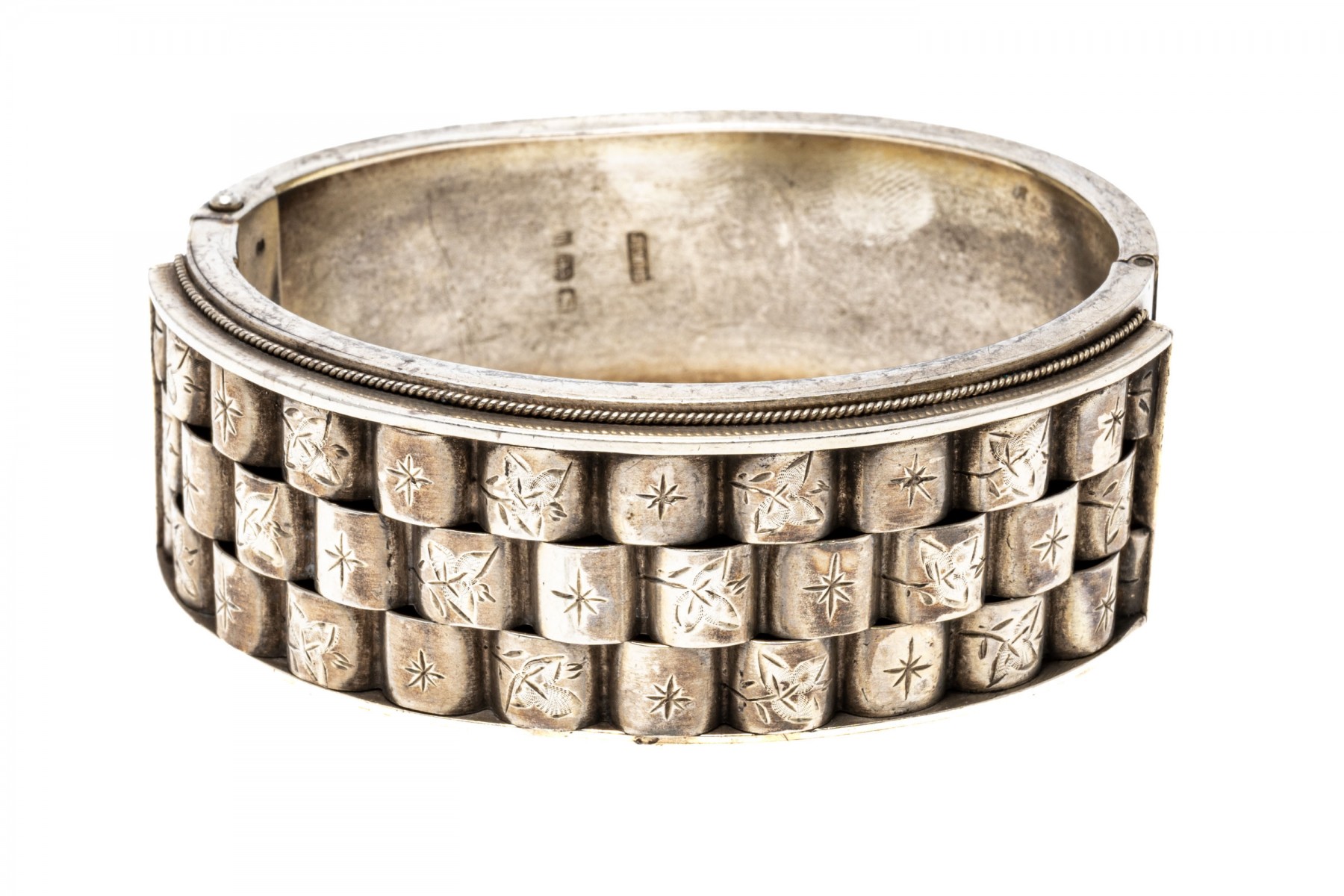 Antique English sterling silver bangle style bracelet. The face of the bracelet has a ribbed design engraved with star and leaf designs. The English sterling silver hallmarks indicate the bracelet was created in 1882. The bangle secures with a box style clasp.