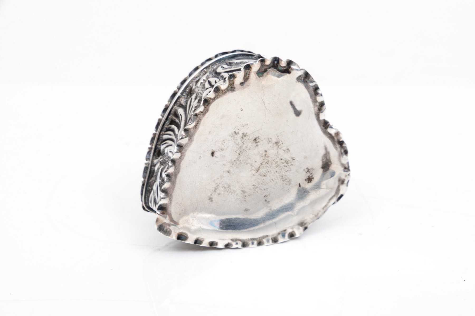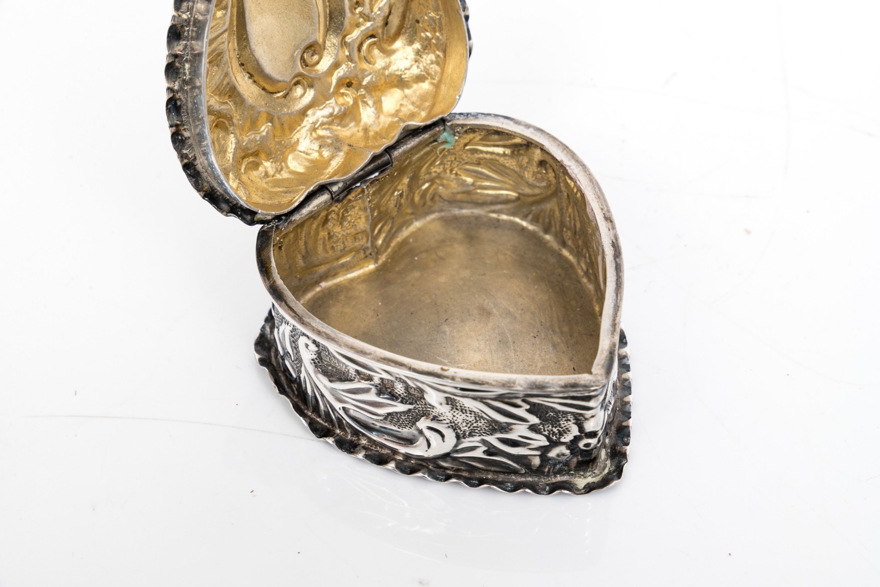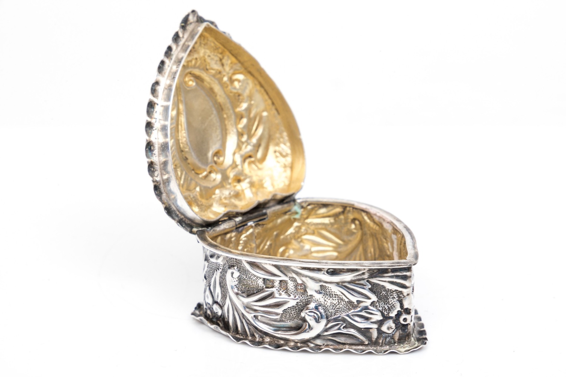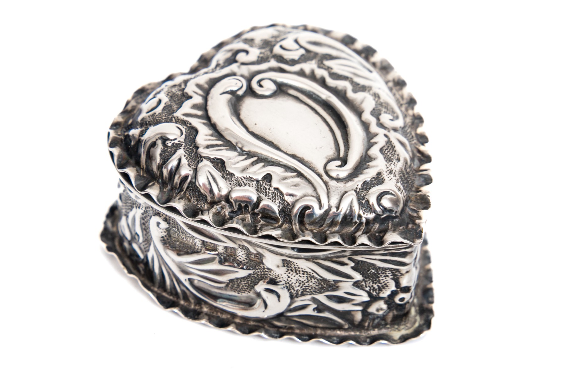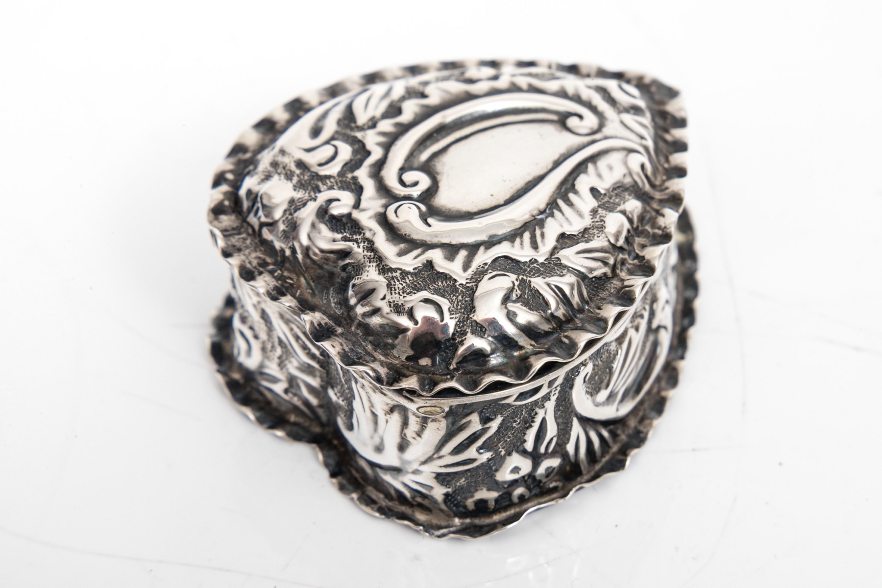 Antique sterling silver beautiful repousse hinged heart shaped box, Birmingham, England, circa 1898
