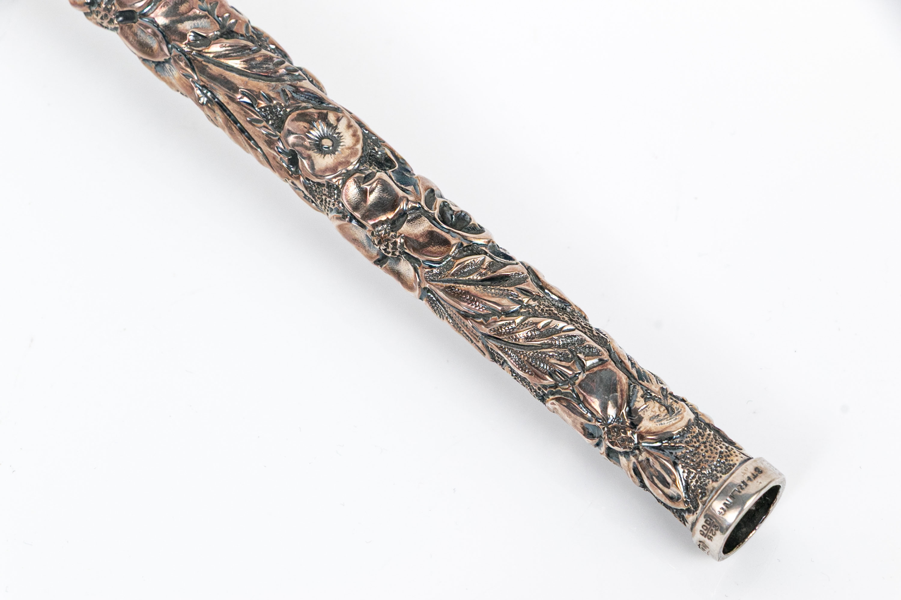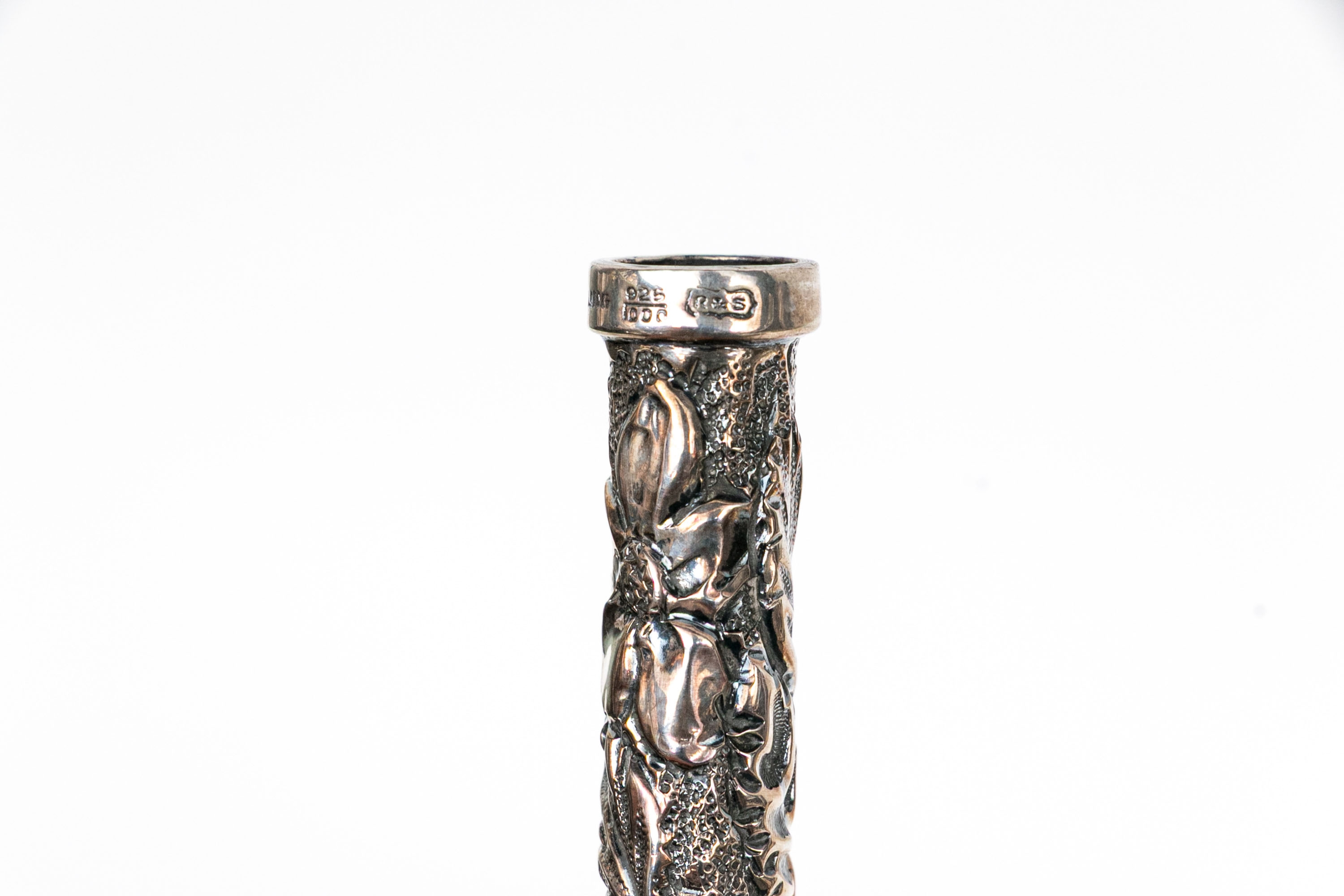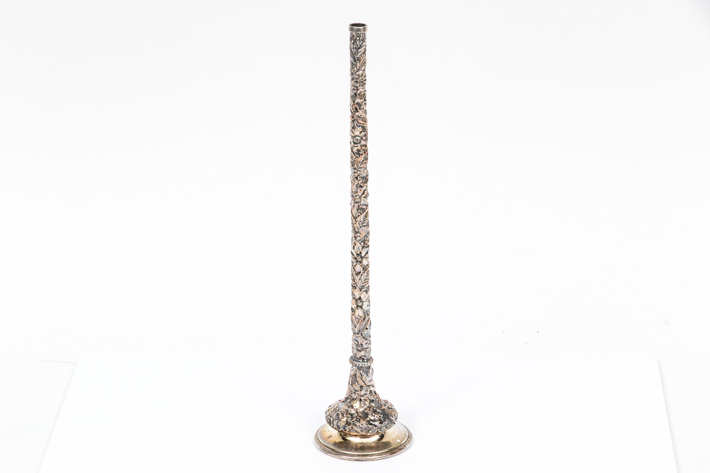 A tall slim sterling silver bud vase decorated overall with raised flowers and leaves. On a circular base.
