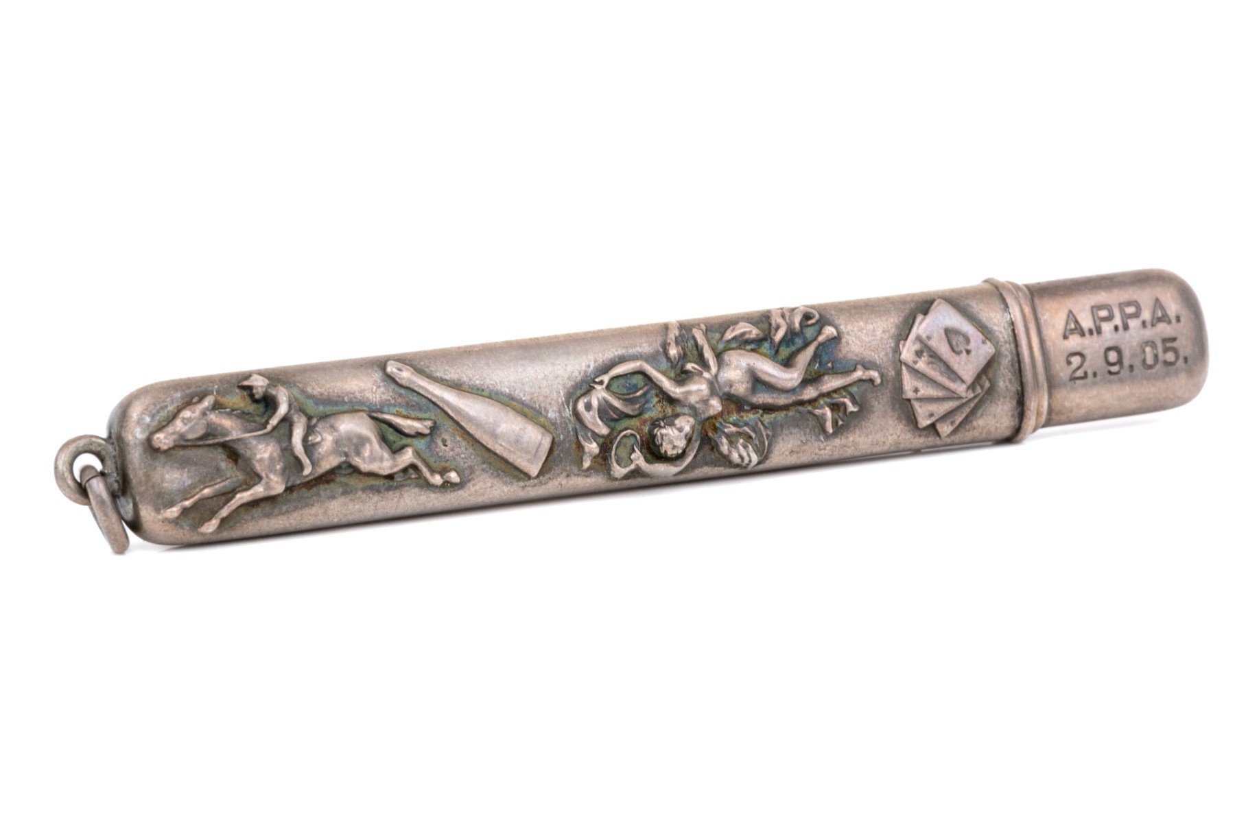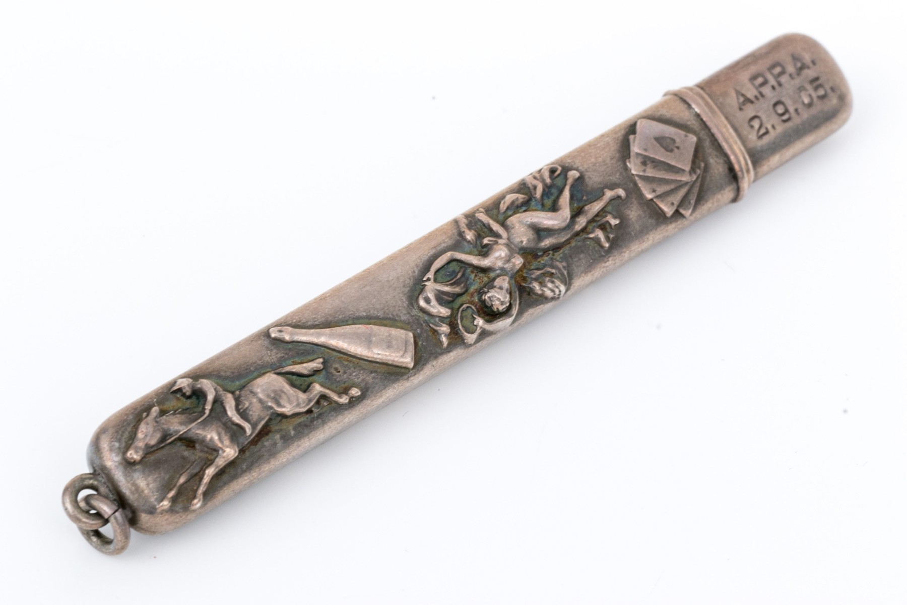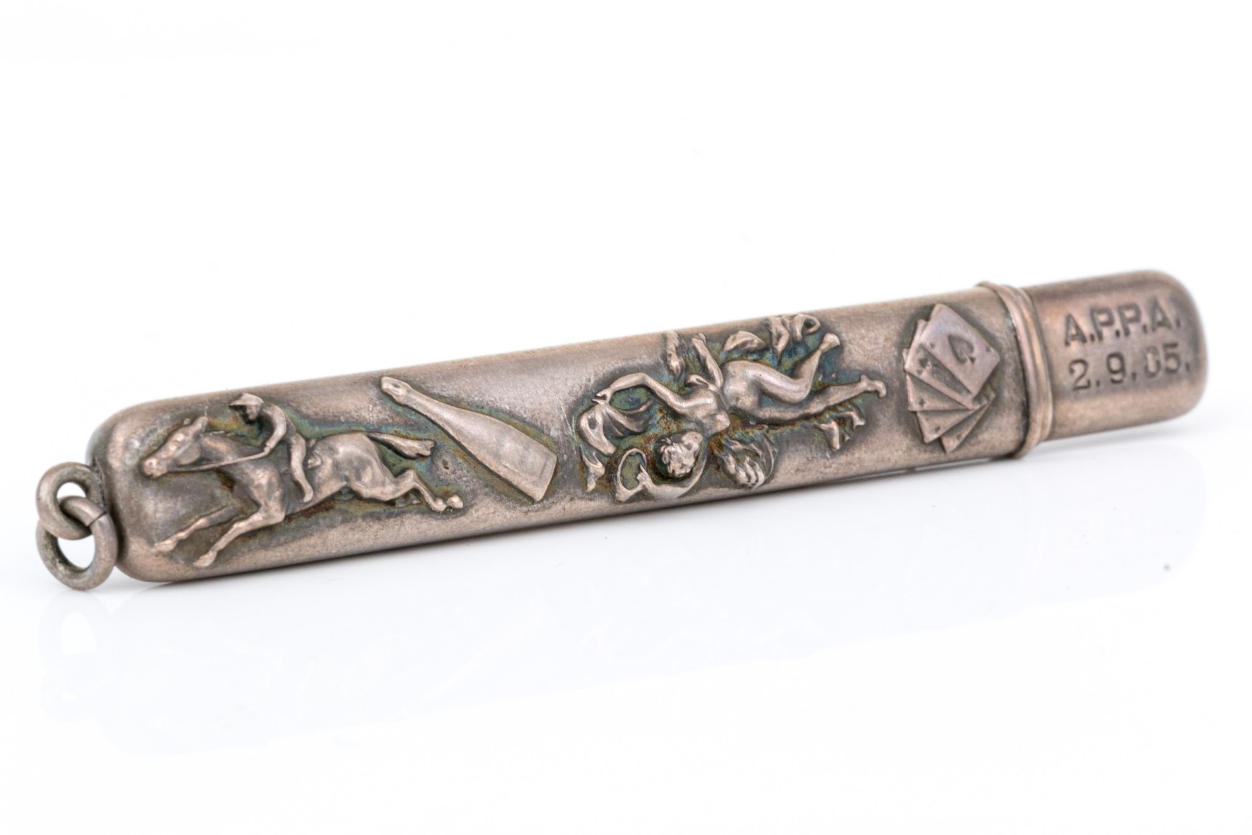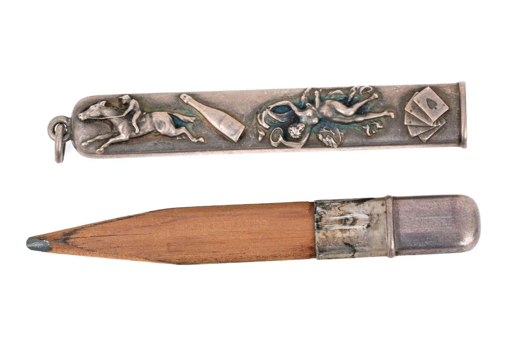 Marked A.P.P.A. and Dated 1905. A slim sterling case decorated with a raised jockey on horseback, nude female dancer figure, playing cards and a champagne bottle. The end pulls off to reveal the pencil.