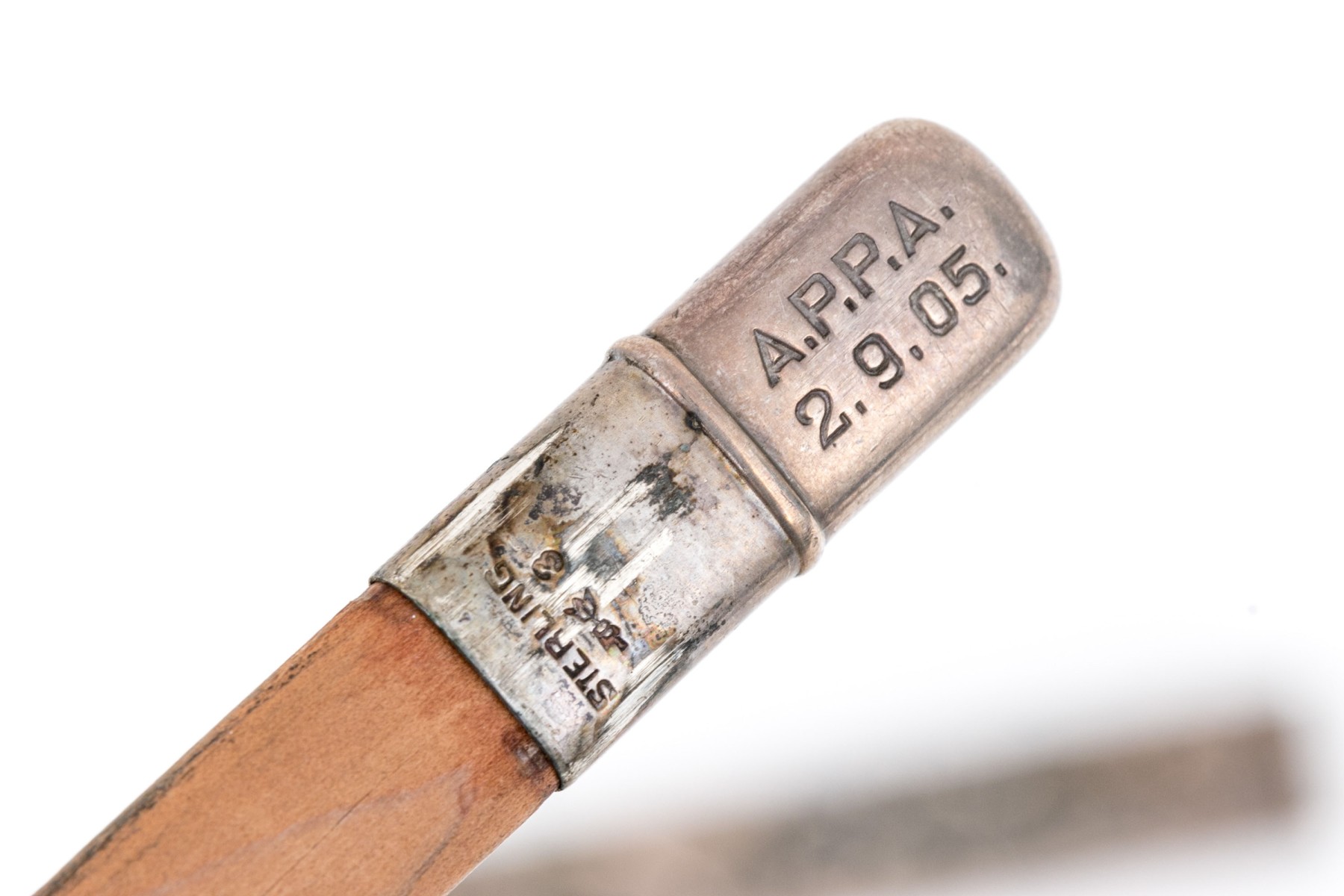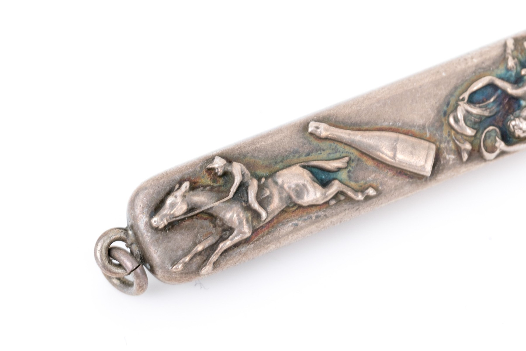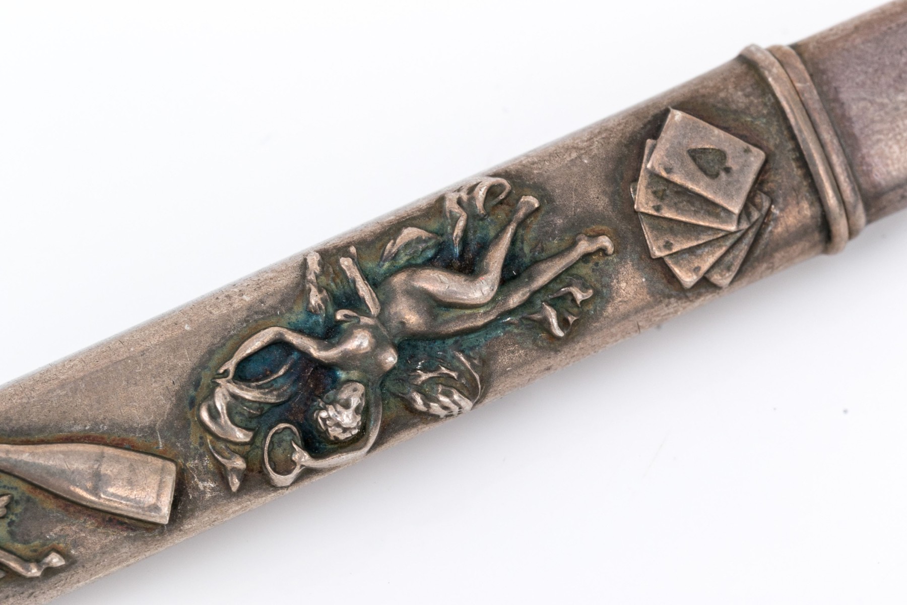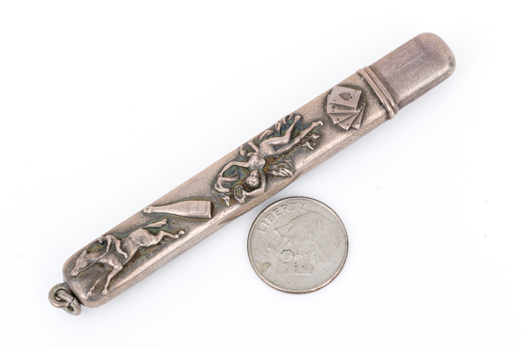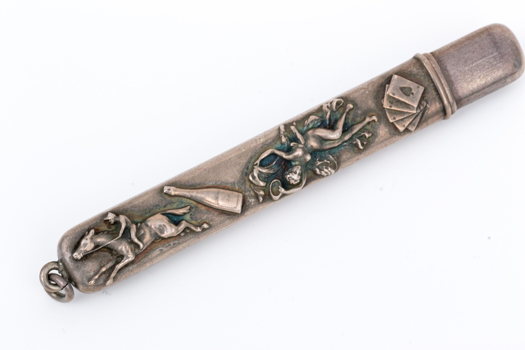 Marked A.P.P.A. and Dated 1905. A slim sterling case decorated with a raised jockey on horseback, nude female dancer figure, playing cards and a champagne bottle. The end pulls off to reveal the pencil.